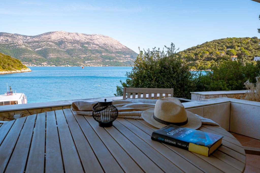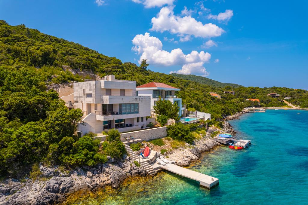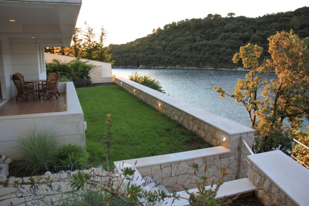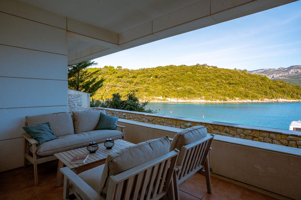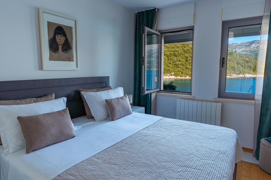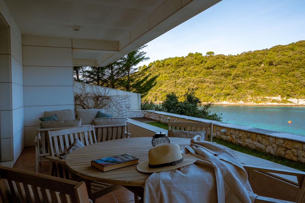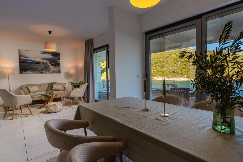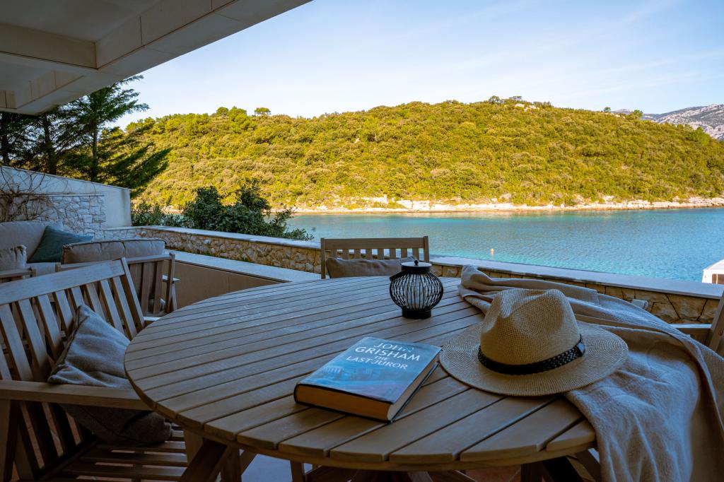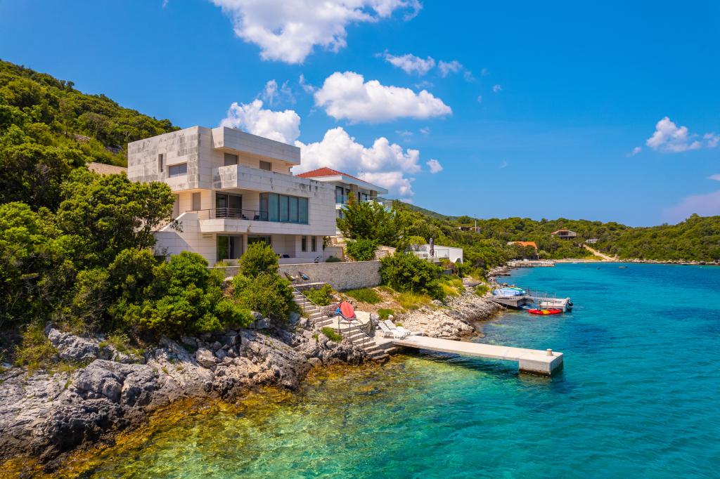 Villa Avantgarde - apartmán přímo u moře pro 4 osoby - velmi klidná zátoka - ostrov Korčula - Chorvatsko Je dílem slavného chorvatského a světově uznávaného architekta. Nachází se v klidné zátoce, cca. 4 km od centra města. Ve vile máte k dispozici pohodlný apartmán o velikosti cca. 100 m2, který se skládá ze 2 ložnic, koupelny a obývacího pokoje s dobře vybavenou kuchyní, jídelnou a obývacím pokojem, ze kterého je vstup na prostornou terasu s přímým vstupem na soukromou pláž. Pláž je 9 m od apartmánu. Ve vile je k pronájmu pouze jeden byt. Obklopují ho upravené trávníky, zeleň, ptačí zpěv a moře. Hostům je k dispozici uzavřené soukromé parkoviště. Ložnice, obývací pokoj, jídelna a terasa jsou orientovány přímo na moře. Lze jej využívat po celý rok, jelikož je vybaven ústředním topením.