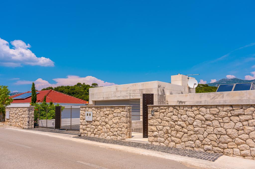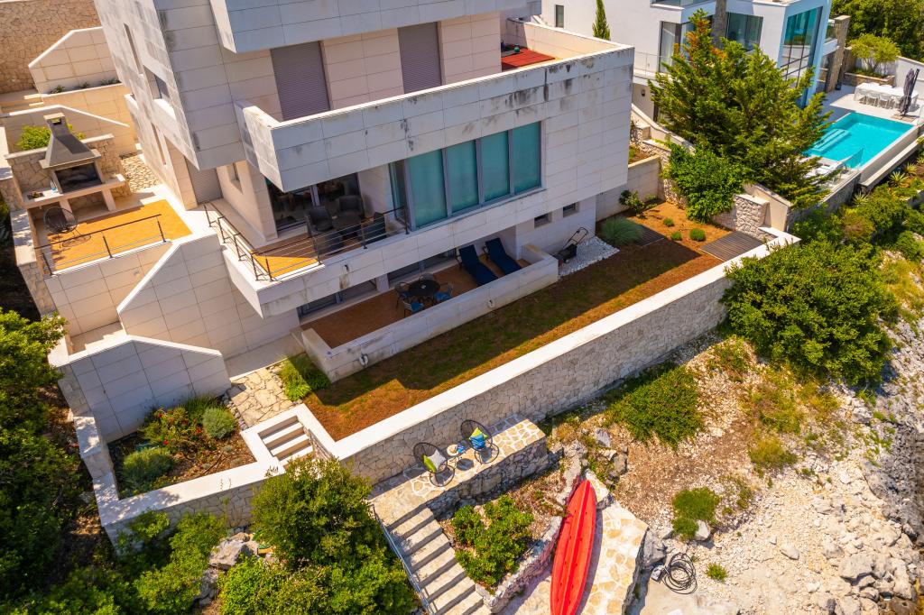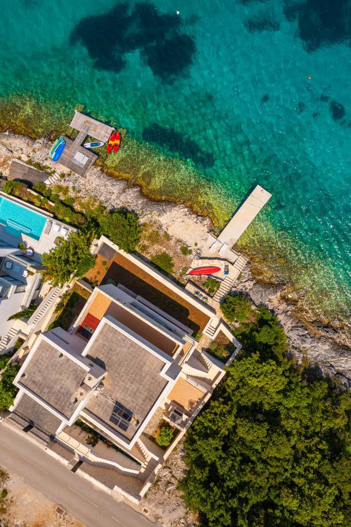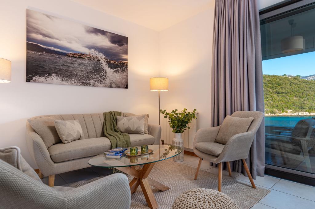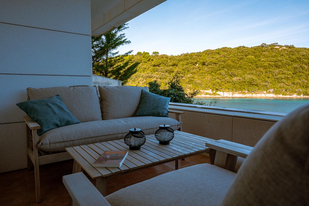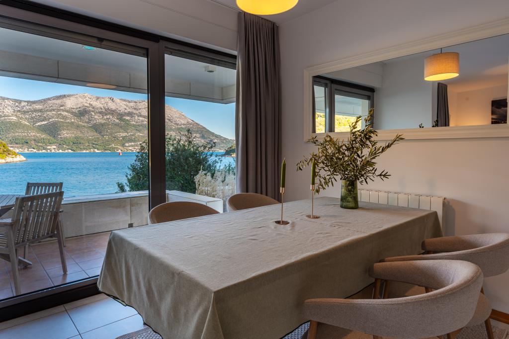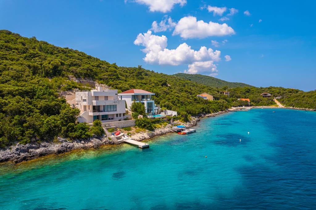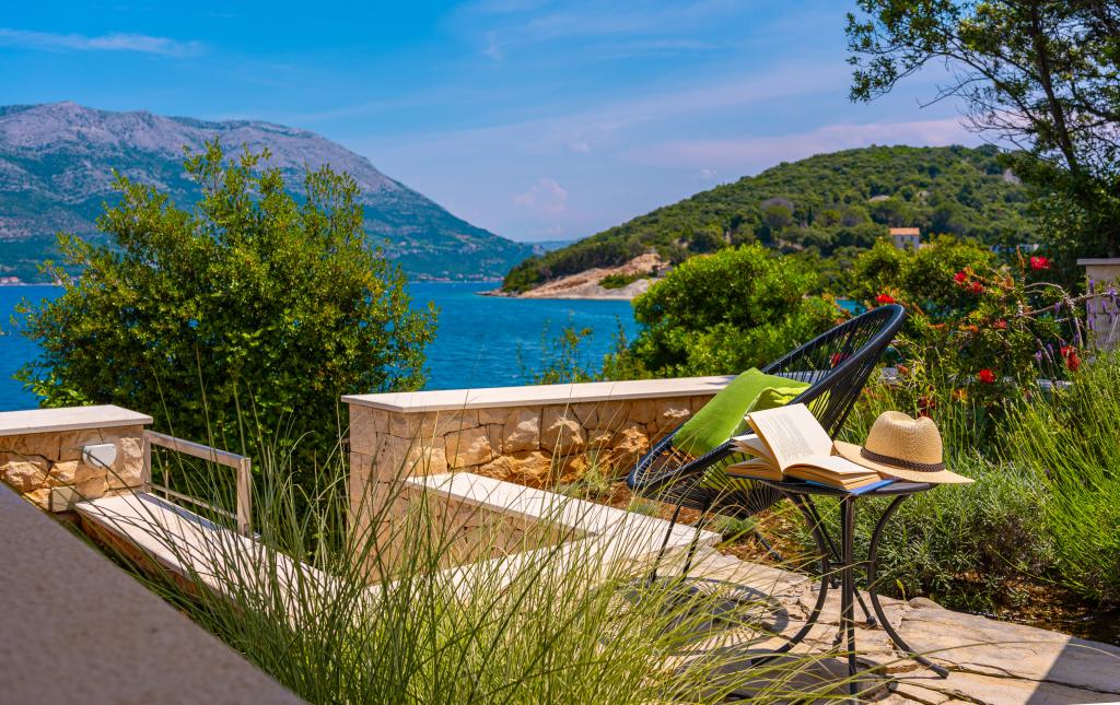 Villa Avantgarde - apartmán přímo u moře pro 4 osoby - velmi klidná zátoka - ostrov Korčula - Chorvatsko Je dílem slavného chorvatského a světově uznávaného architekta. Nachází se v klidné zátoce, cca. 4 km od centra města. Ve vile máte k dispozici pohodlný apartmán o velikosti cca. 100 m2, který se skládá ze 2 ložnic, koupelny a obývacího pokoje s dobře vybavenou kuchyní, jídelnou a obývacím pokojem, ze kterého je vstup na prostornou terasu s přímým vstupem na soukromou pláž. Pláž je 9 m od apartmánu. Ve vile je k pronájmu pouze jeden byt. Obklopují ho upravené trávníky, zeleň, ptačí zpěv a moře. Hostům je k dispozici uzavřené soukromé parkoviště. Ložnice, obývací pokoj, jídelna a terasa jsou orientovány přímo na moře. Lze jej využívat po celý rok, jelikož je vybaven ústředním topením.