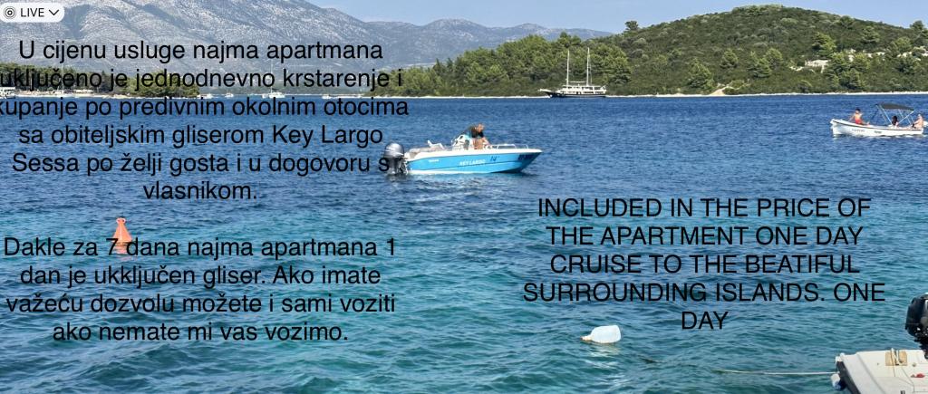 V ceně ubytování je zahrnuto: V ceně služby pronájmu apartmánu je na přání hosta a po dohodě s majitelem jednodenní plavba a koupání na krásných okolních ostrovech s rodinným motorovým člunem Key Largo Sessa. . Takže na 7 dní pronájmu bytu 1 den zahrnuje motorový člun. Pokud máte platný řidičský průkaz, můžete řídit sami, pokud jej nemáte, dovezeme vás Voda Elektřina SUP stravování Používání klimatizace Používání kol Používání dětského koutku se skluzavkou a domečkem Stolní tenis Wi-Fi Parkování zdarma Ložní prádlo a ručníky Čištění apartmánu Pobytová taxa 1 láhev extra panenského olivového oleje Moderní lehátka se slunečníkem Žádné dodatečné poplatky...