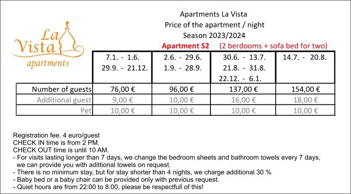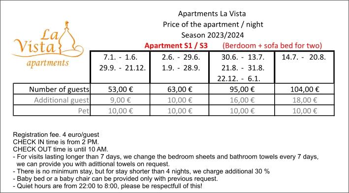 Přečtěte si více Ubytovací jednotkyPro všechny dotazy a rezervace nás kontaktujte e-mailem. Registrace hosta - 4,00 EUR / osoba. Ekologická daň - 0,15 EUR osoba/den, děti do 12 let ekologickou daň neplatí. Pro hosty s pobytem kratším než 4 noci se cena ubytování zvyšuje o 30%. Závěrečný úklid apartmánu a pobytová (turistická) taxa jsou zahrnuty v ceně ubytování.