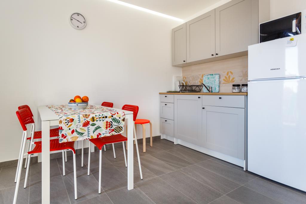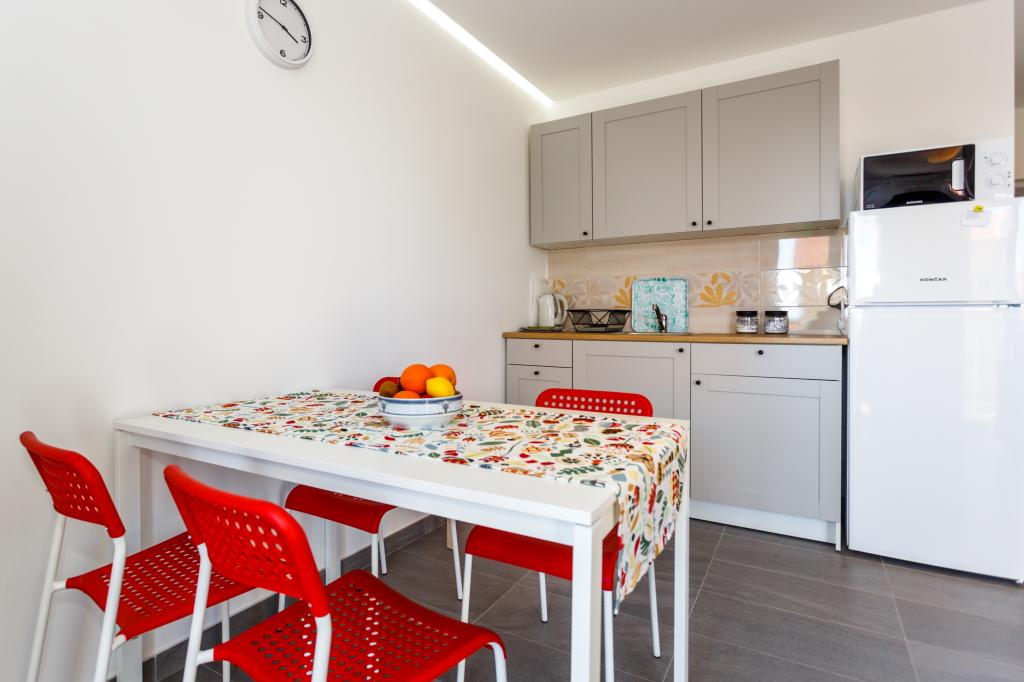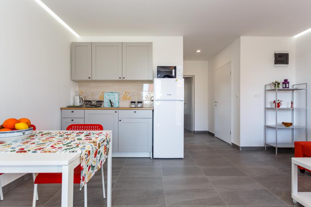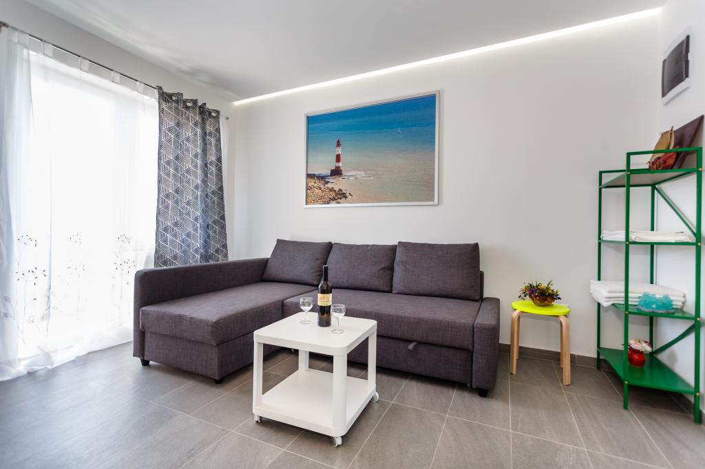 Pozdrav! :) Toto je náš zbrusu nový byt v blízkosti centra Krku (asi 5 minut chůze). Byt má jednu ložnici s manželskou postelí, obývací pokoj s pohovkou, kterou lze rozložit na dvoulůžko, kuchyň a koupelnu s potřebným příslušenstvím. Má také balkon, kde si můžete užívat slunce kdykoli během dne. Nabízíme bezplatné parkovací místo ve stínu, bezplatnou klimatizaci, smart TV s Netflixem, gril na zahradě u apartmánu a bezplatné WiFi.