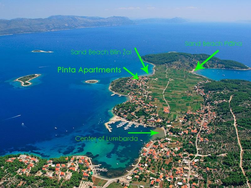 Apartmány Pinta se nacházejí ve staré a klidné části městečka Lumbarda na ostrově Korčula. Jsou 5-10 minut chůze od písečných pláží Bilin žal a Pržina a 10 minut od centra Lumbardy. Naše rodina má dlouhou tradici dělat cestovatele šťastnými. V roce 1928 naši předkové otevřeli první penzion v Lumbardě pod názvem PINTA. V 80. letech 20. století byl dům přestavěn na byty a v roce 2012 byl dům kompletně zrekonstruován, čímž vynikla krása staré zástavby. Dostupné kapacity a velké terasy svým propojením v jednom domě představují možnost společné dovolené pro větší skupinu hostů, kteří mají zároveň v každém apartmánu svůj komfort. K dispozici: Apartmány pro dva - se nachází v prvním patře (s velkou terasou), Apartmán pro pět - přízemí a první patro domu (terasa a balkon); Apartmán pro čtyři - v prvním patře s vlastním velkým balkonem.