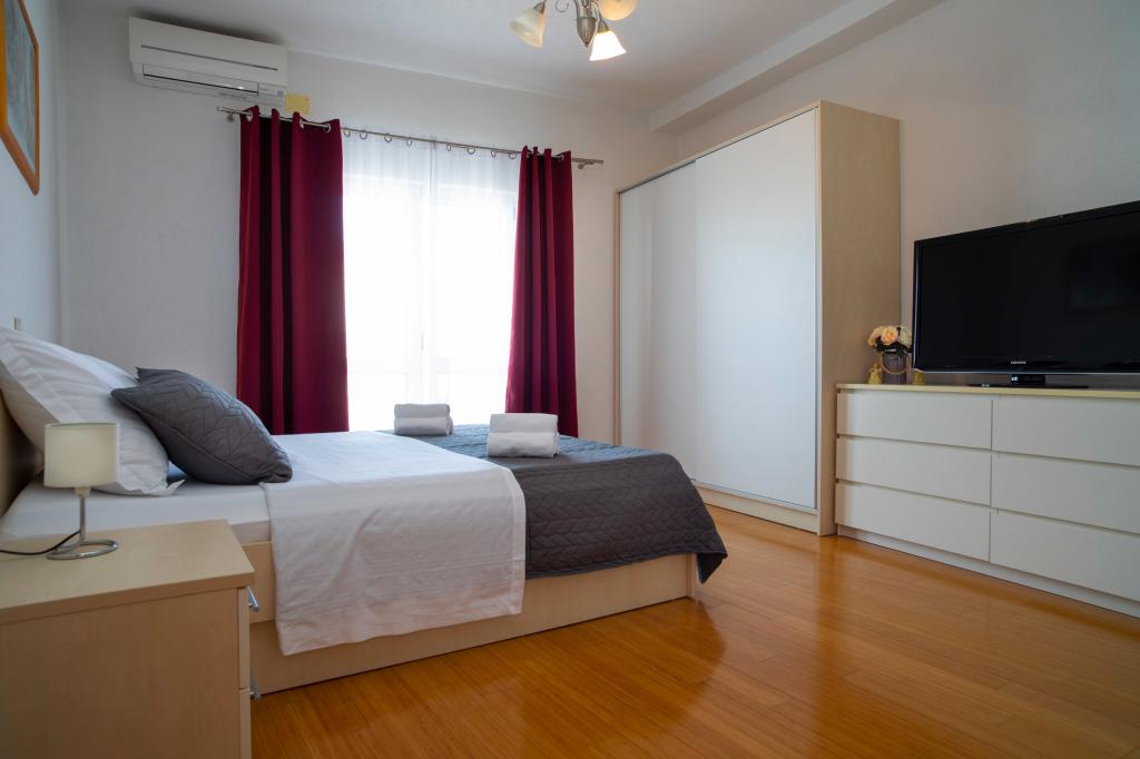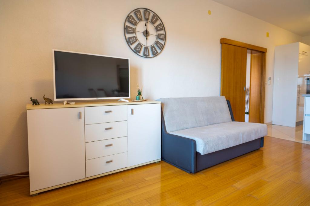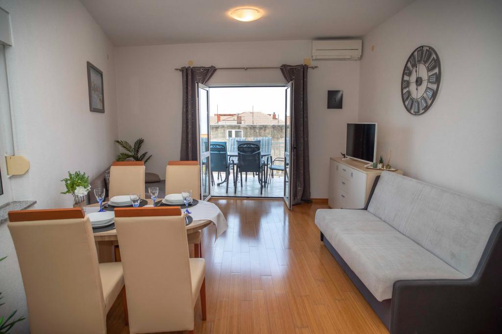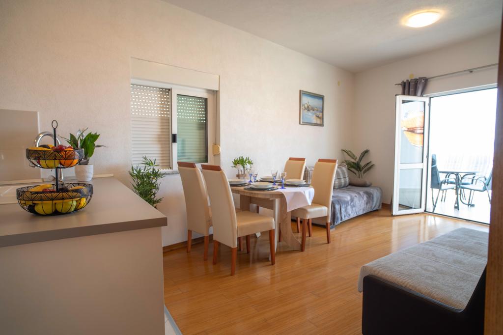 Vítejte v apartmánu "Ivana" s výhledem na moře a garáží. Ideální pro 2 dospělé a 4 děti. Skládá se z ložnice, koupelny, obývacího pokoje se 2 rozkládacími pohovkami a plně vybavené kuchyně. V obývacím pokoji a ložnici jsou klimatizace.