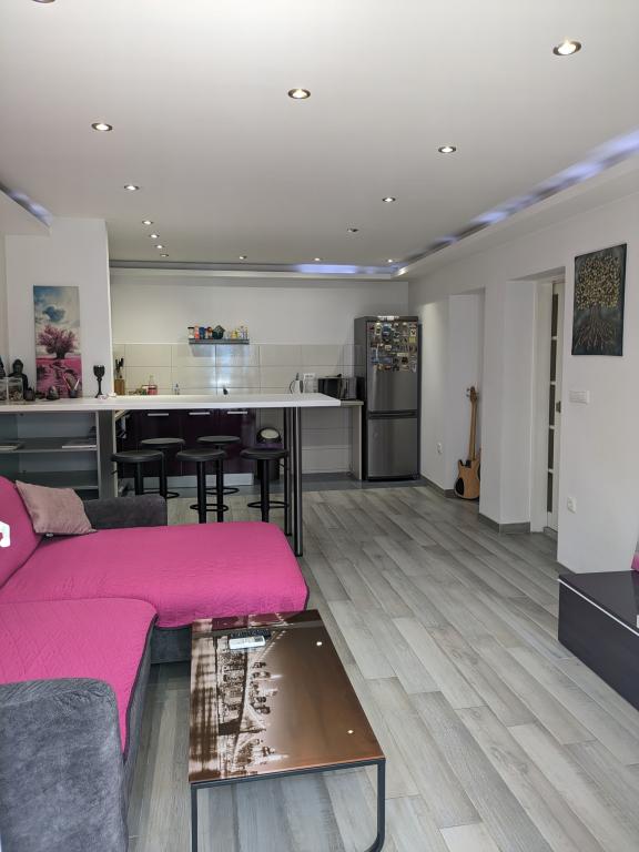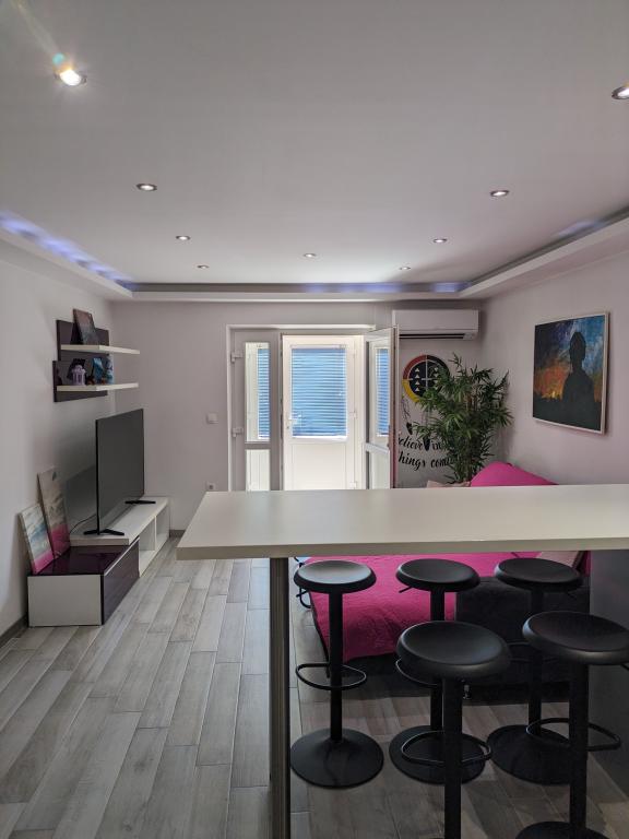 Vítejte v našem moderním, nově zařízeném apartmánu v centru Makarské na nejstarší ulici Kalalarga, hned vedle hlavního náměstí. Apartmán má dvě ložnice, dvě koupelny, dvě klimatizace, 160cm TV, Netflix, myčku nádobí, pračku, plně vybavenou kuchyň a posezení s velkými okny. Apartmán se nachází v přízemí a má dva samostatné vchody. Zcela oddělený od zbytku domu. Naprosté soukromí. Domácí mazlíčci vítáni.