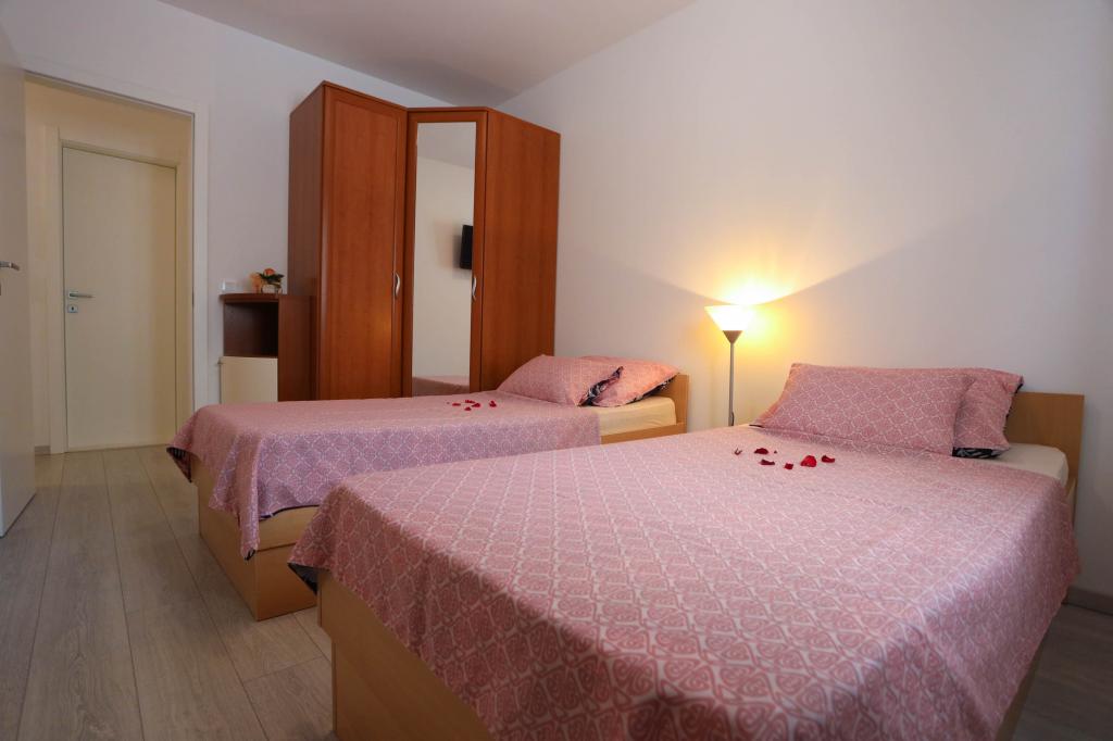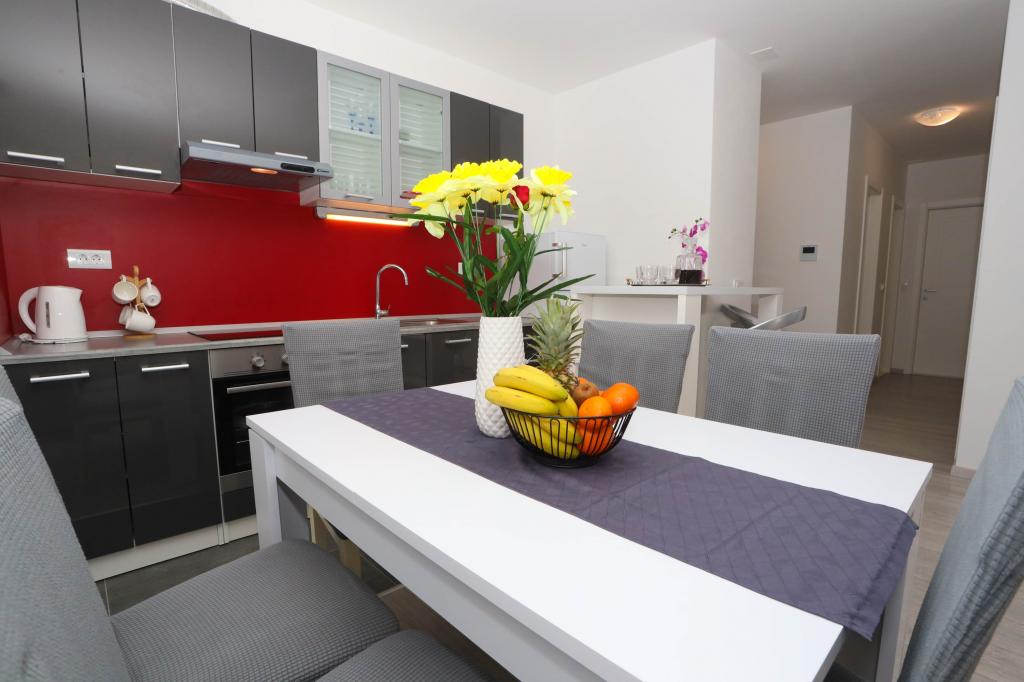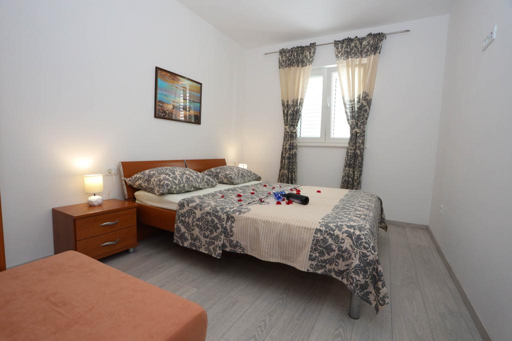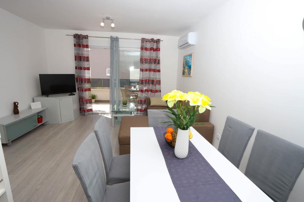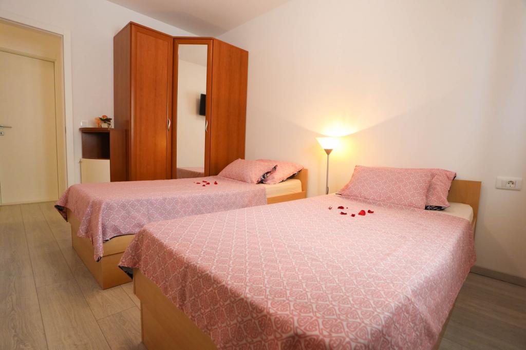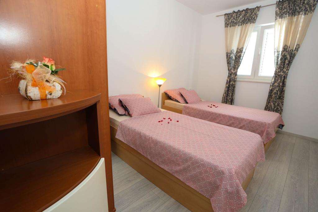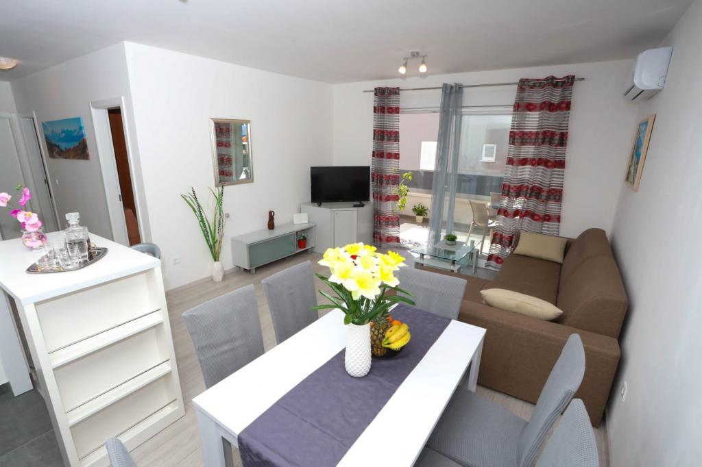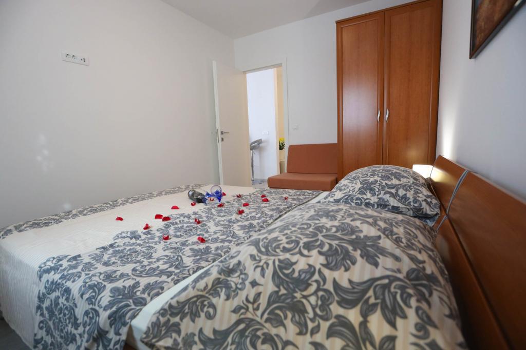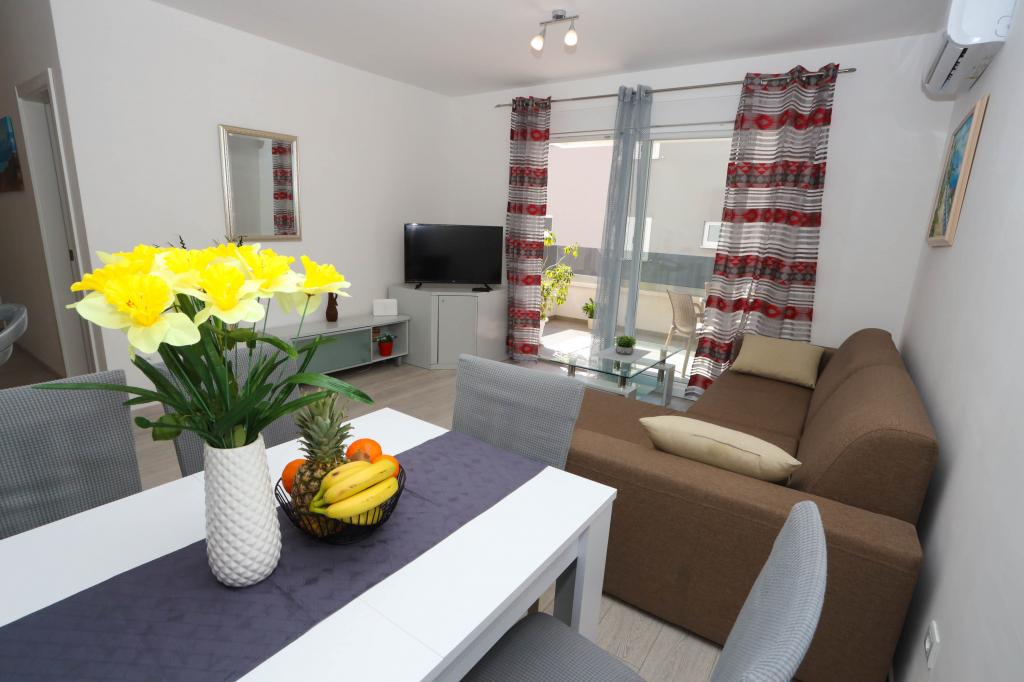 Moderně vybavený apartmán v prvním patře novostavby s výtahem. Apartmán má vše, co potřebujete pro příjemný pobyt na dovolené. Apartmán Petra se skládá z jídelny s vybavenou kuchyní, obývacího pokoje s rozkládací pohovkou, která slouží jako přistýlka, koupelny a malé toalety a dvou ložnic. Jeden pokoj má manželskou postel a druhý má dvě lůžka, která lze v případě potřeby oddělit. Nemovitost se nachází 5 minut chůze od centra nebo nejbližší pláže. Nedaleko se nachází obchod a sportovní hřiště pro rekreaci.