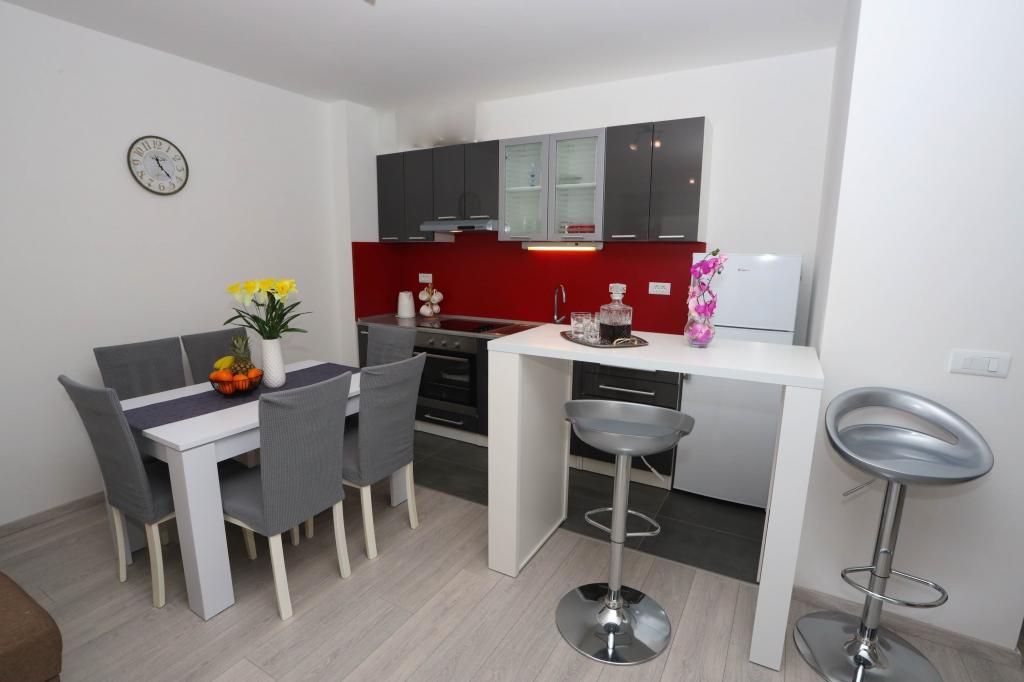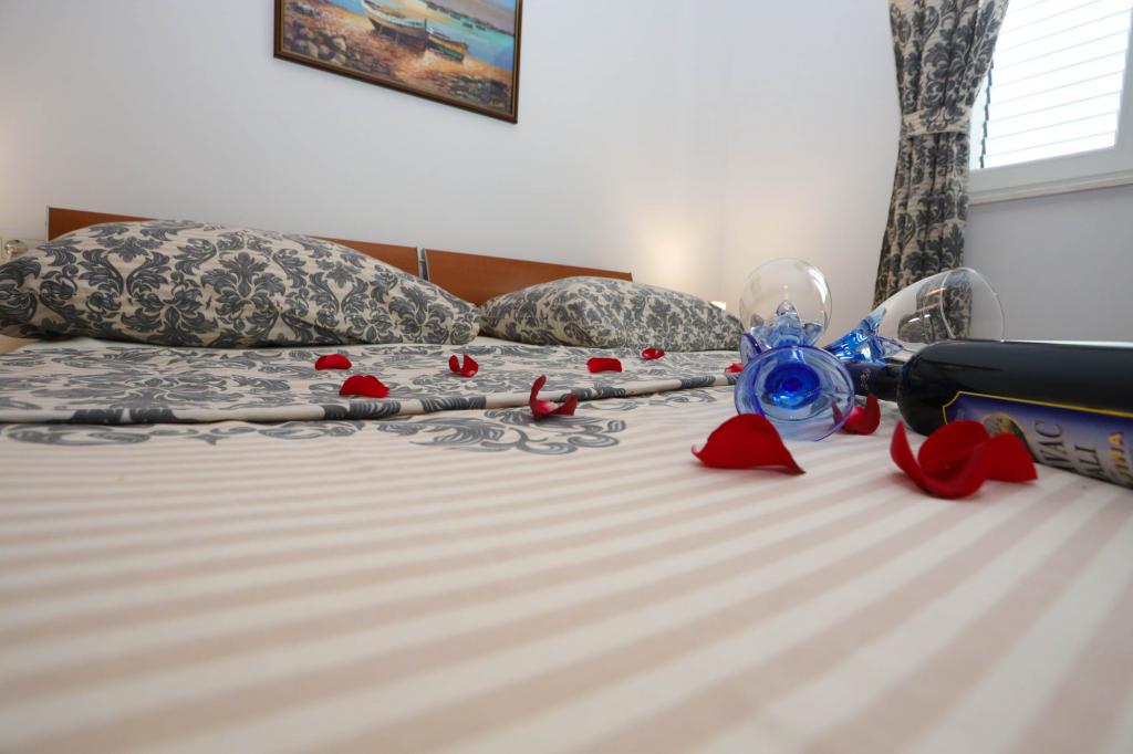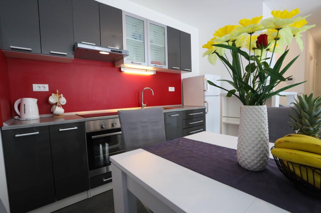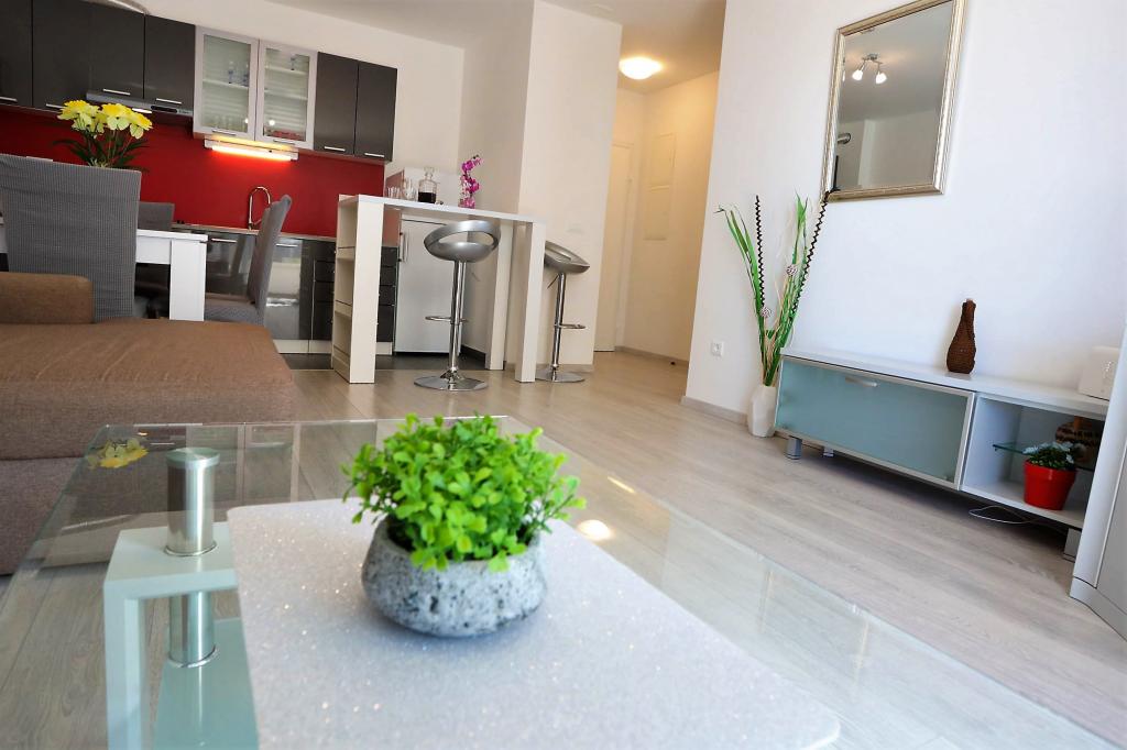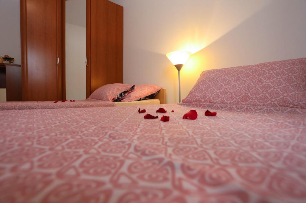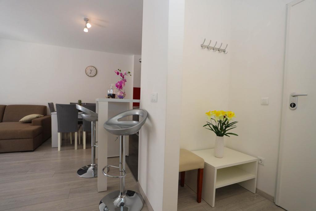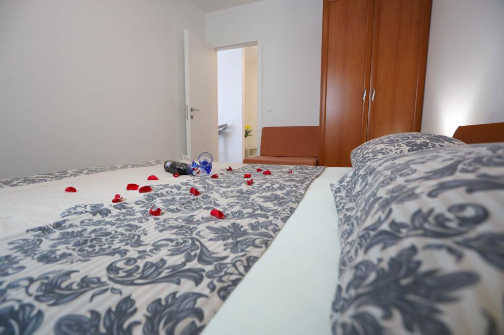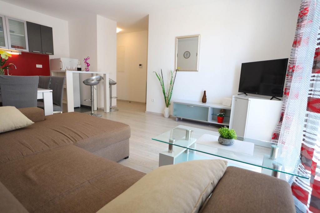 Moderně vybavený apartmán v prvním patře novostavby s výtahem. Apartmán má vše, co potřebujete pro příjemný pobyt na dovolené. Apartmán Petra se skládá z jídelny s vybavenou kuchyní, obývacího pokoje s rozkládací pohovkou, která slouží jako přistýlka, koupelny a malé toalety a dvou ložnic. Jeden pokoj má manželskou postel a druhý má dvě lůžka, která lze v případě potřeby oddělit. Nemovitost se nachází 5 minut chůze od centra nebo nejbližší pláže. Nedaleko se nachází obchod a sportovní hřiště pro rekreaci.