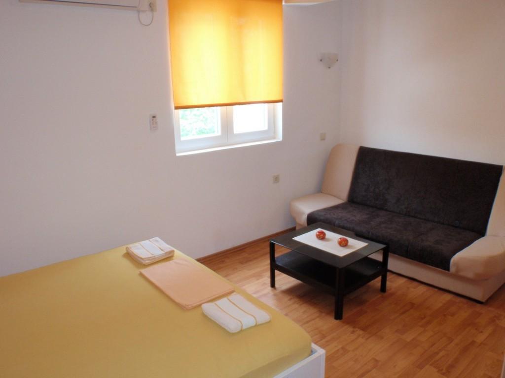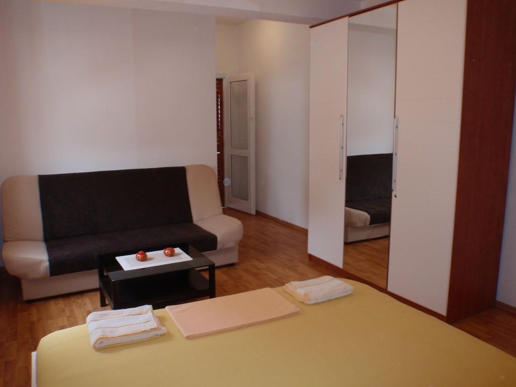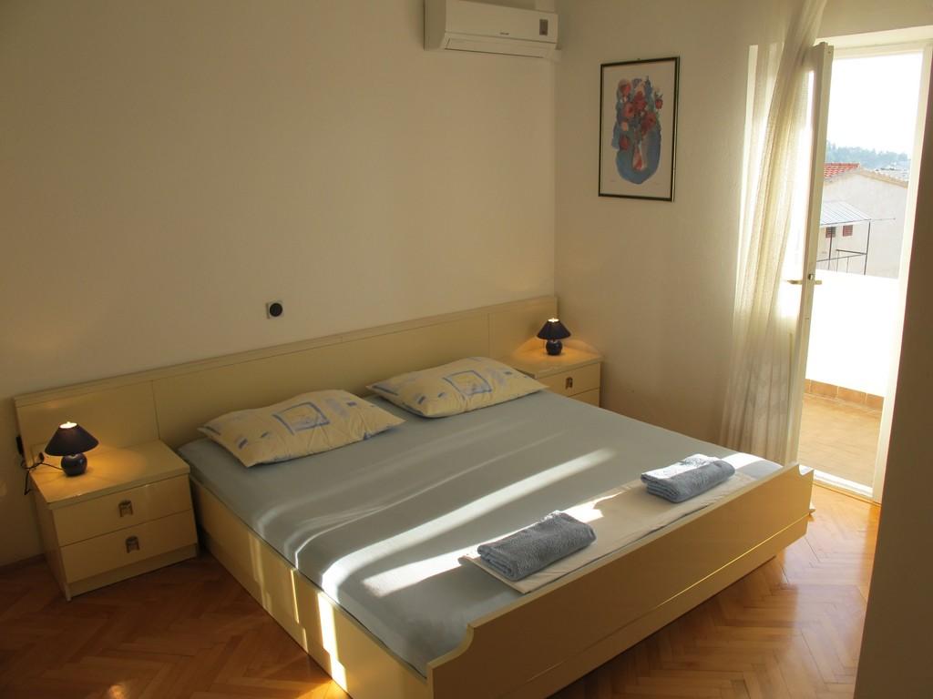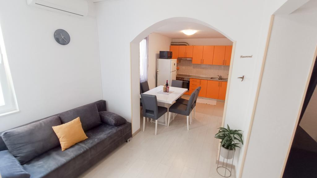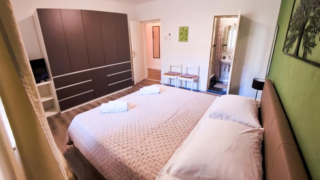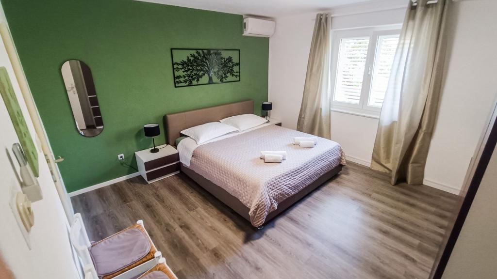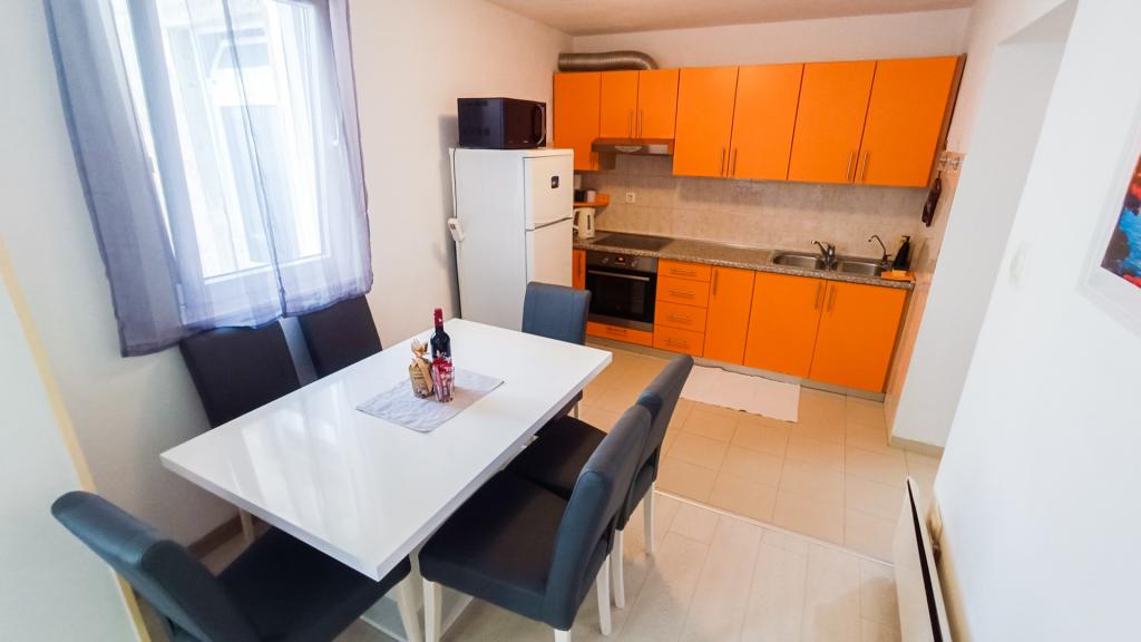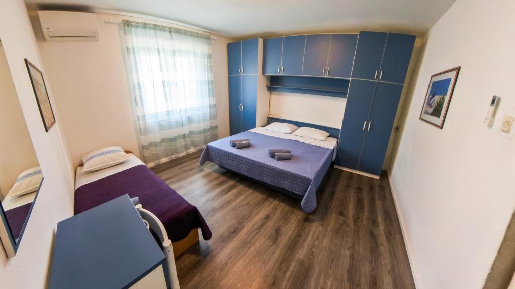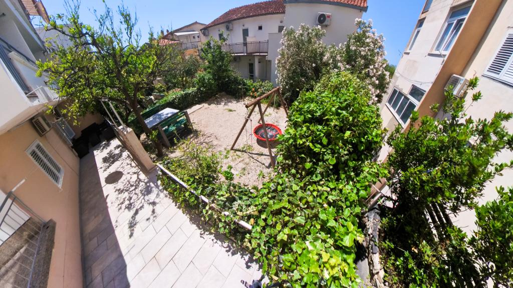 Byt 5 + 4 je ideální pro rodiny s dětmi. Má dvě ložnice (jedna pro 2 a jedna pro 3 osoby), dvě rozkládací pohovky v obývacím pokoji, 3 koupelny, kuchyň a velký dvůr s posezením, grilem a hřištěm pro děti. Menší apartmány a pokoje v objektu jsou vhodné pro 2 až 3 osoby. Objekt je vzdálen od pláže do 5 minut chůze a 10 minut do centra.