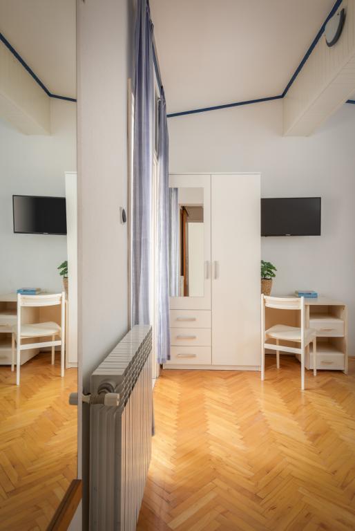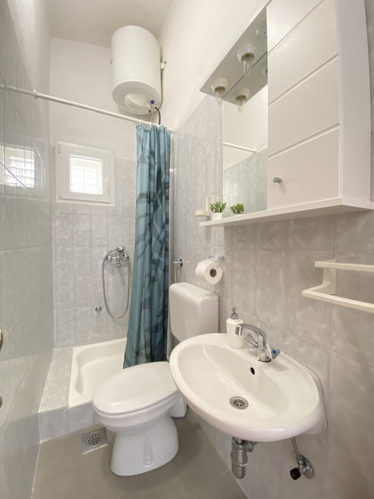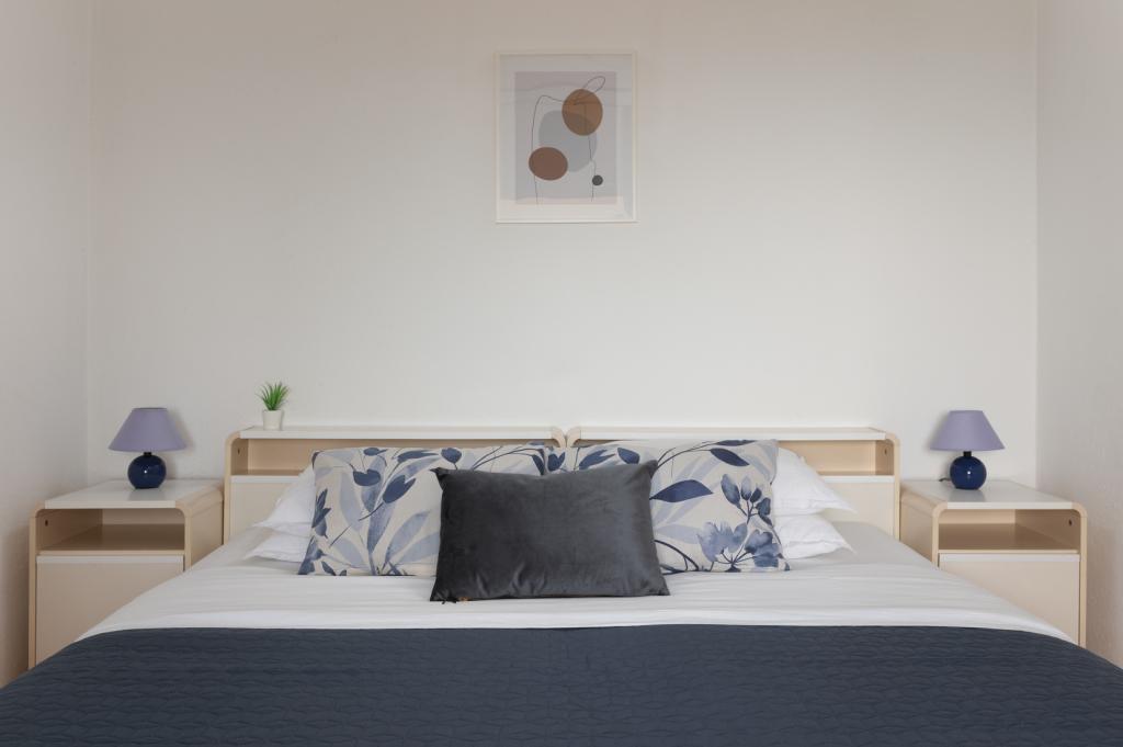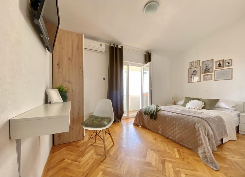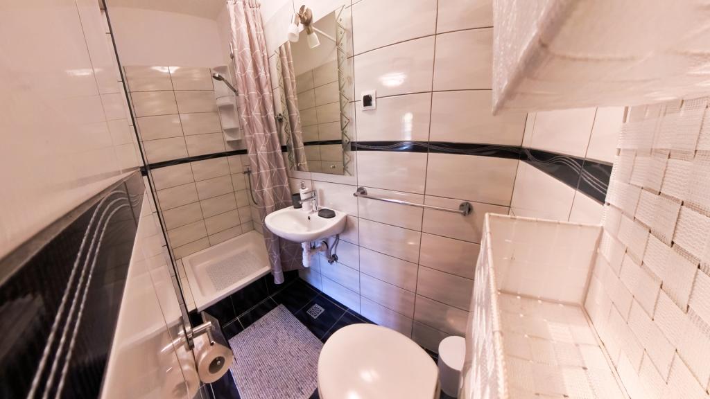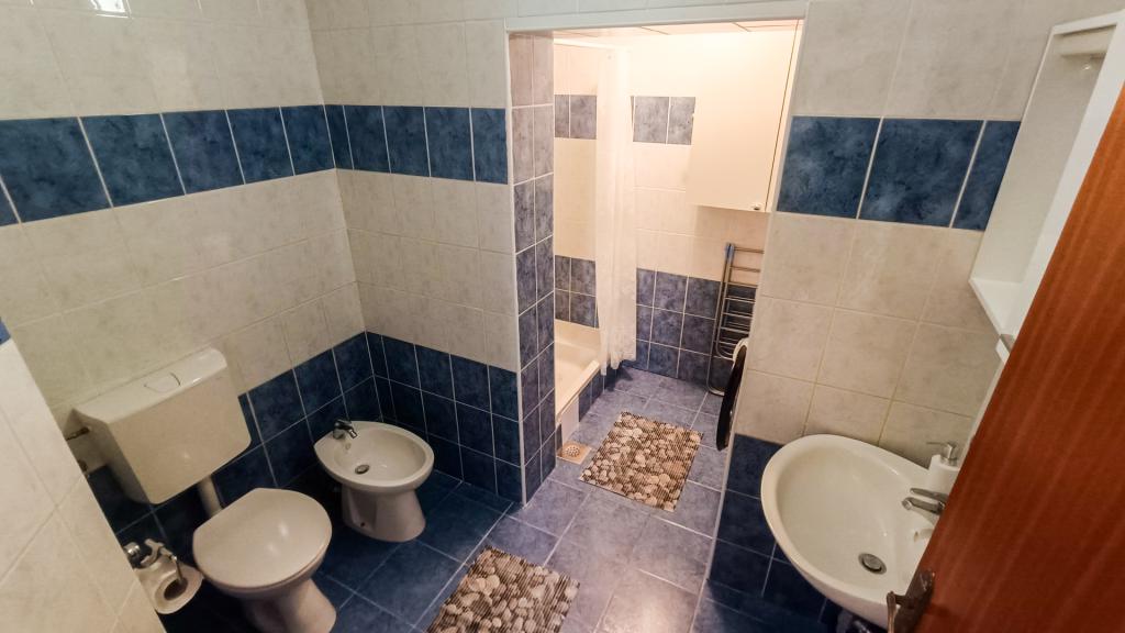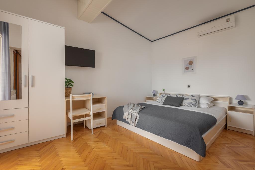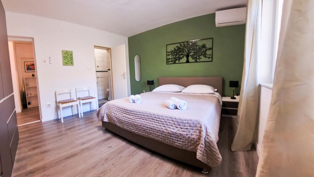Byt 5 + 4 je ideální pro rodiny s dětmi. Má dvě ložnice (jedna pro 2 a jedna pro 3 osoby), dvě rozkládací pohovky v obývacím pokoji, 3 koupelny, kuchyň a velký dvůr s posezením, grilem a hřištěm pro děti. Menší apartmány a pokoje v objektu jsou vhodné pro 2 až 3 osoby. Objekt je vzdálen od pláže do 5 minut chůze a 10 minut do centra.