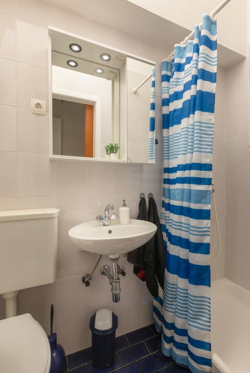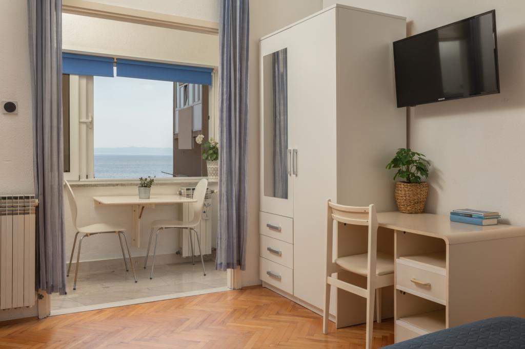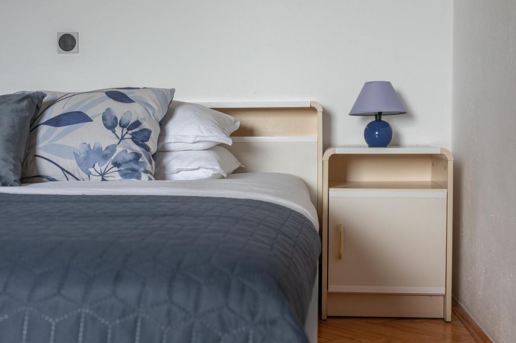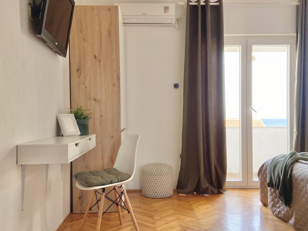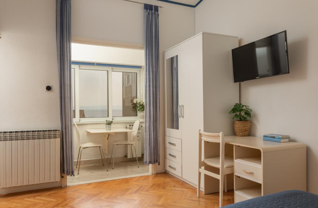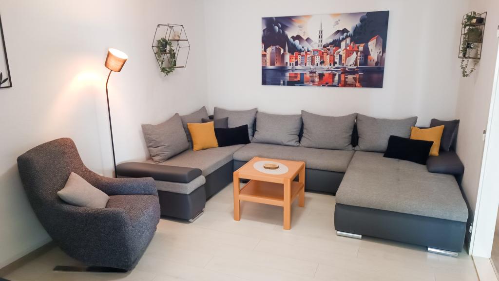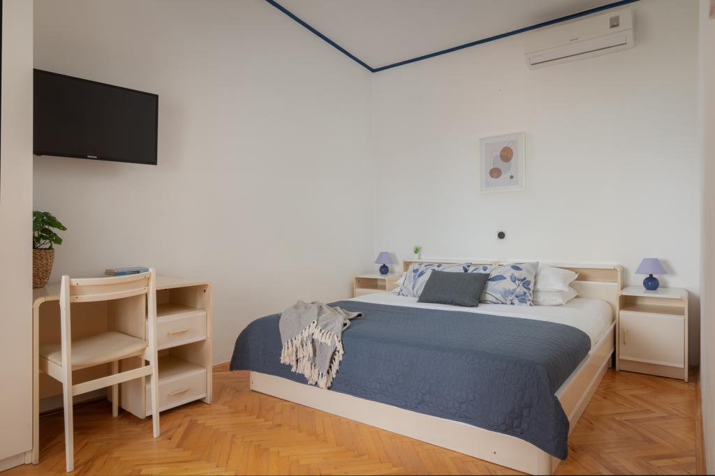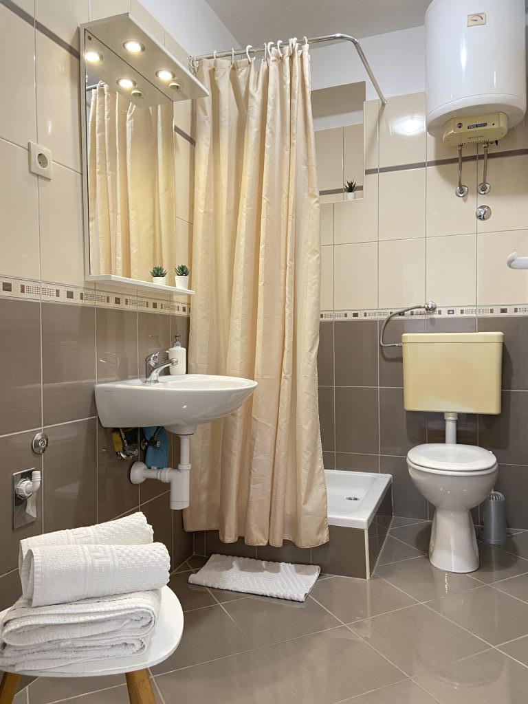 Byt 5 + 4 je ideální pro rodiny s dětmi. Má dvě ložnice (jedna pro 2 a jedna pro 3 osoby), dvě rozkládací pohovky v obývacím pokoji, 3 koupelny, kuchyň a velký dvůr s posezením, grilem a hřištěm pro děti. Menší apartmány a pokoje v objektu jsou vhodné pro 2 až 3 osoby. Objekt je vzdálen od pláže do 5 minut chůze a 10 minut do centra.