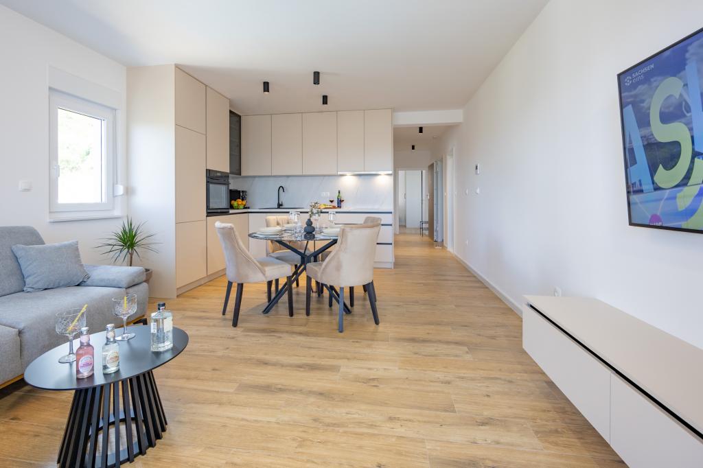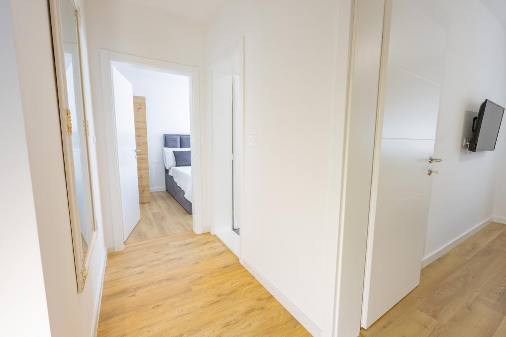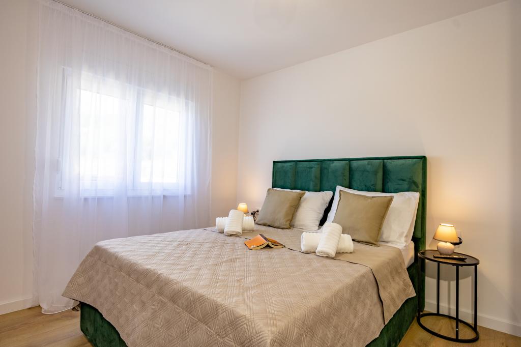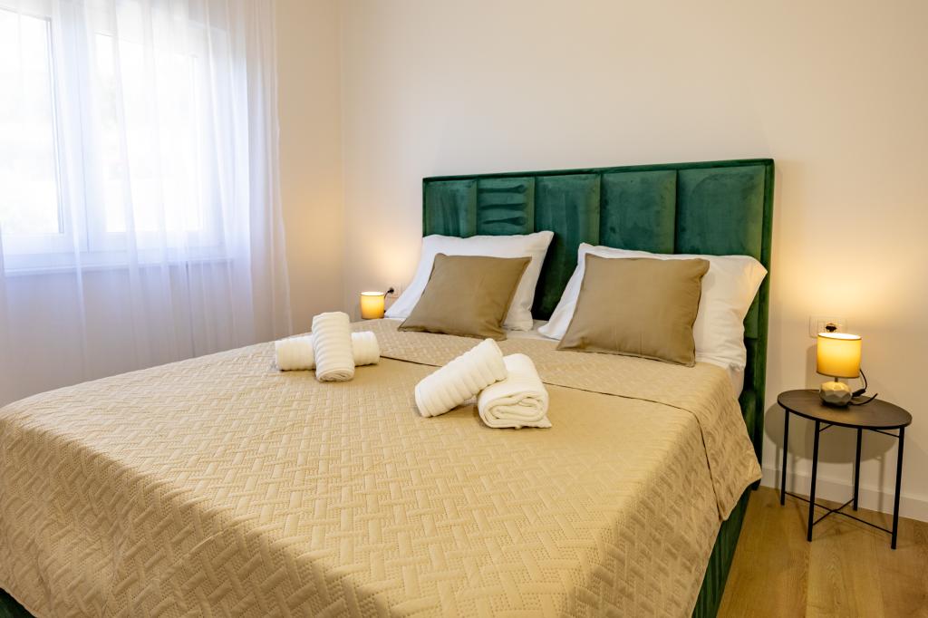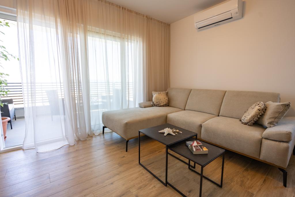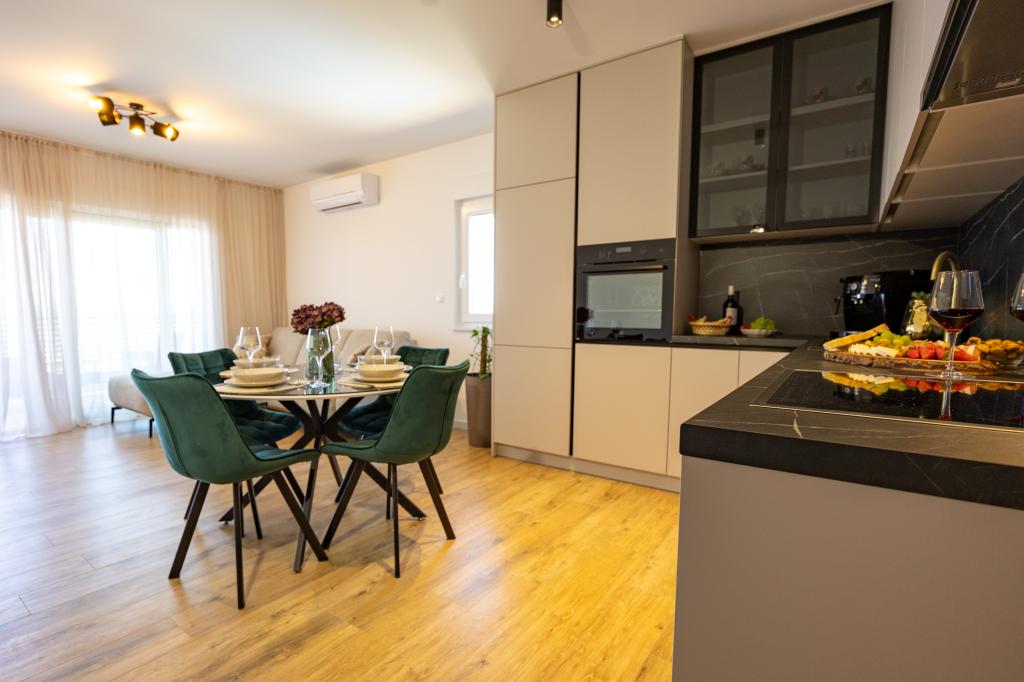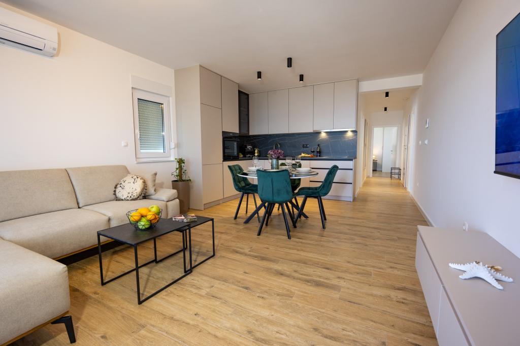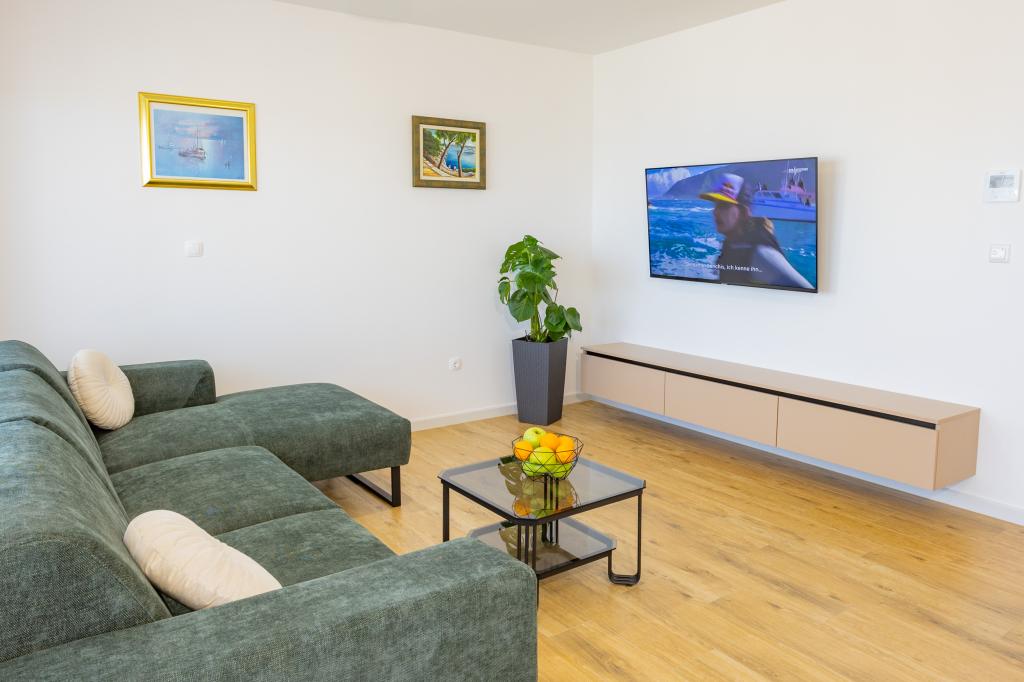 Každý apartmán vyzařuje moderní design a nově zrekonstruovaný interiér. V prostorném obývacím pokoji, zařízeném vkusným nábytkem a moderními detaily, se budete cítit jako doma. Otevřený koncept přirozeně propojuje obývací pokoj s plně vybavenou kuchyní, kde na vás čekají elegantní pracovní desky, kvalitní spotřebiče a veškerý prostor potřebný k přípravě vašich oblíbených jídel. Obývací část se otevírá na příjemný balkon - ideální místo pro ranní kávu nebo večerní relaxaci se sklenkou vína a nezapomenutelným západem slunce nad Jadranem. Každý apartmán má dvě pohodlné ložnice s manželskými postelemi, vybavené měkkým ložním prádlem a dostatkem úložného prostoru, jednu moderní koupelnu a další toaletu. Apartmány jsou klimatizované a plně vybavené: TV/SAT, internet, pračka, myčka nádobí, kávovar a vše, co potřebujete pro pohodlný a bezstarostný pobyt. Bezplatné parkování v blízkosti pláže je zahrnuto v ceně pronájmu!
