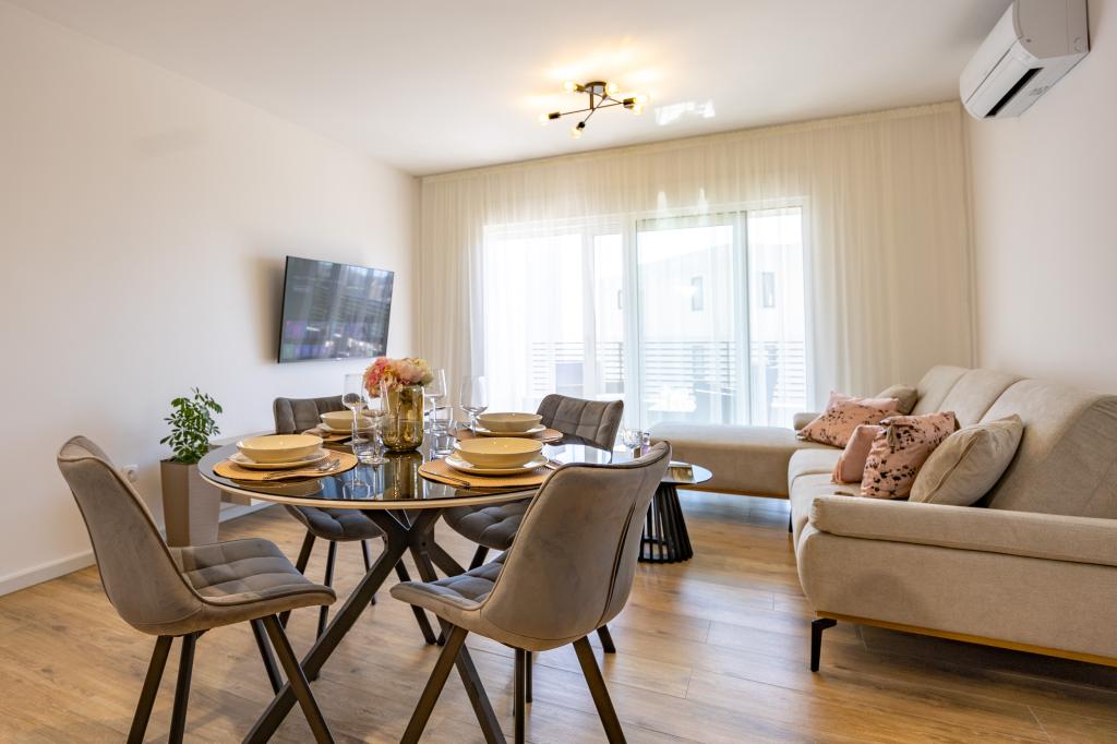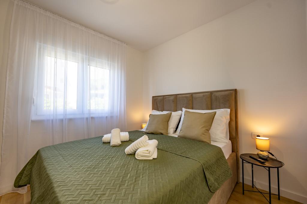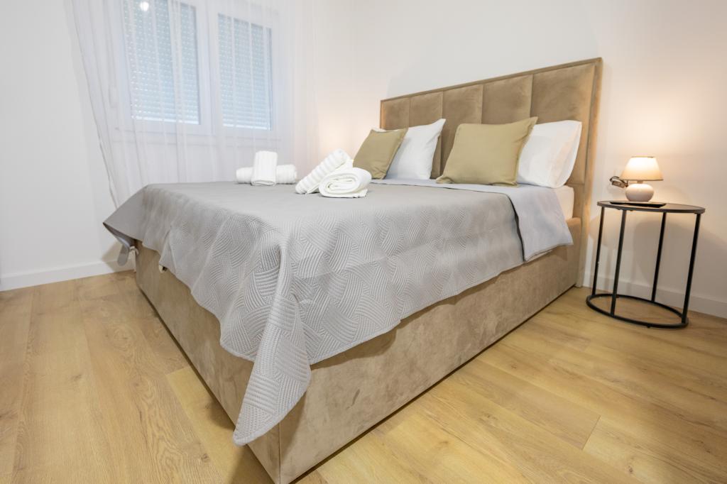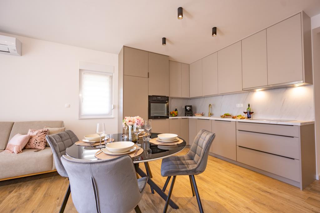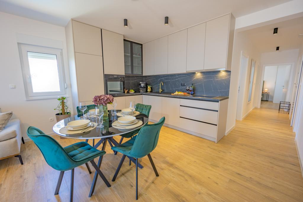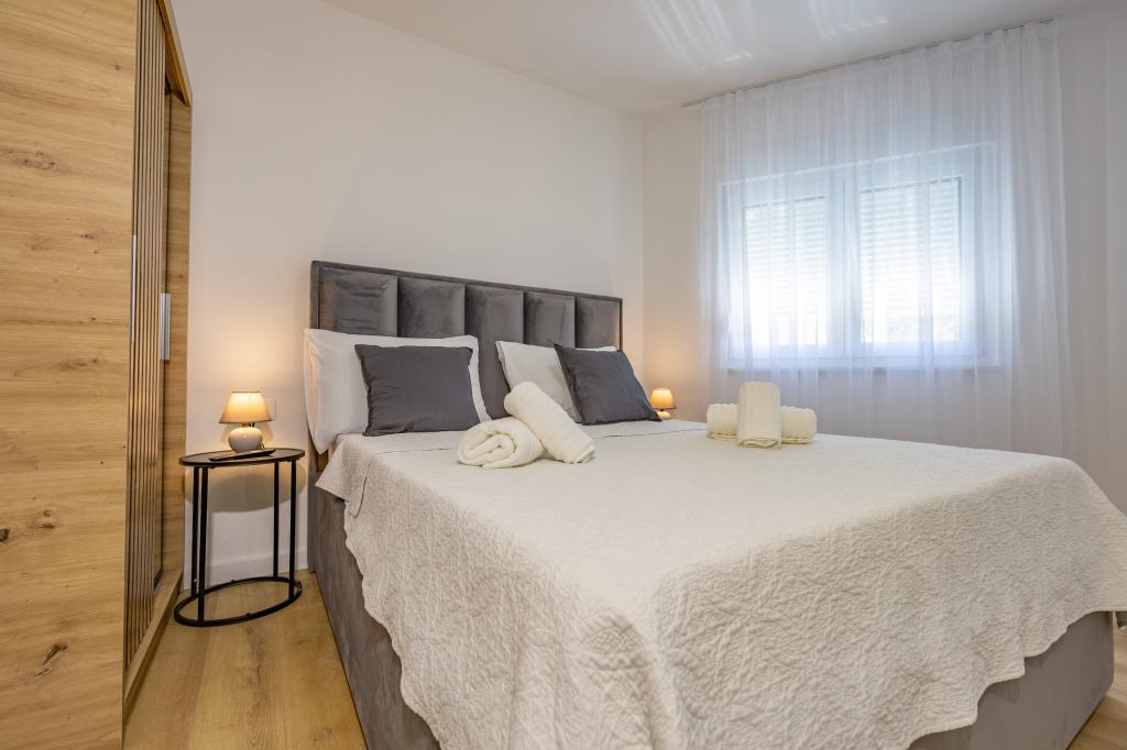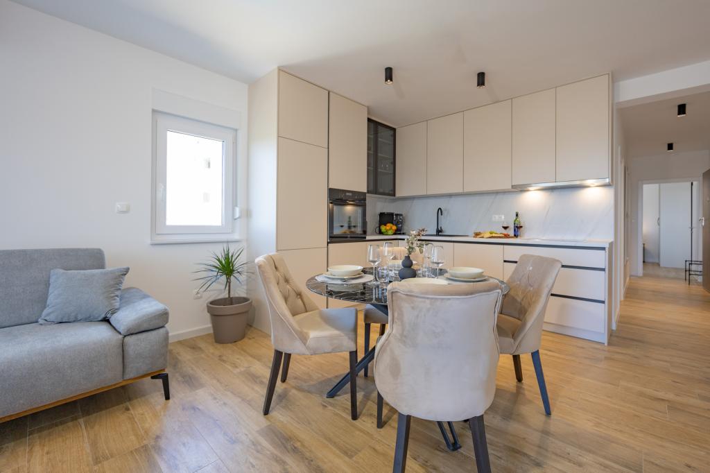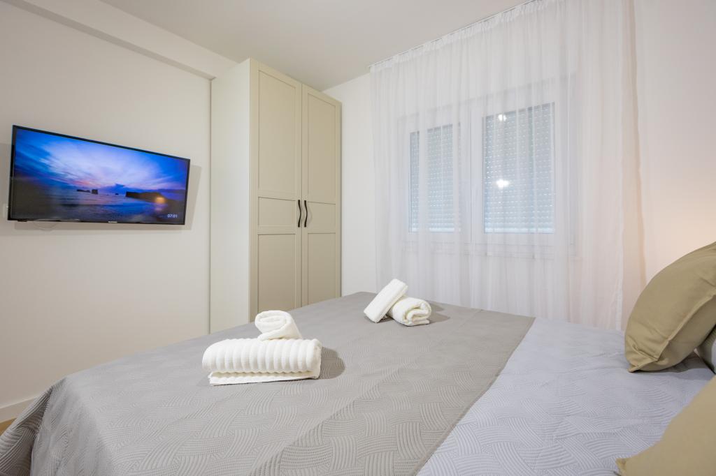 Každý apartmán vyzařuje moderní design a nově zrekonstruovaný interiér. V prostorném obývacím pokoji, zařízeném vkusným nábytkem a moderními detaily, se budete cítit jako doma. Otevřený koncept přirozeně propojuje obývací pokoj s plně vybavenou kuchyní, kde na vás čekají elegantní pracovní desky, kvalitní spotřebiče a veškerý prostor potřebný k přípravě vašich oblíbených jídel. Obývací část se otevírá na příjemný balkon - ideální místo pro ranní kávu nebo večerní relaxaci se sklenkou vína a nezapomenutelným západem slunce nad Jadranem. Každý apartmán má dvě pohodlné ložnice s manželskými postelemi, vybavené měkkým ložním prádlem a dostatkem úložného prostoru, jednu moderní koupelnu a další toaletu. Apartmány jsou klimatizované a plně vybavené: TV/SAT, internet, pračka, myčka nádobí, kávovar a vše, co potřebujete pro pohodlný a bezstarostný pobyt. Bezplatné parkování v blízkosti pláže je zahrnuto v ceně pronájmu!