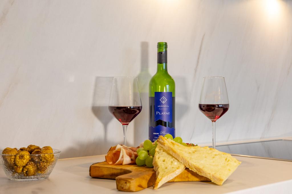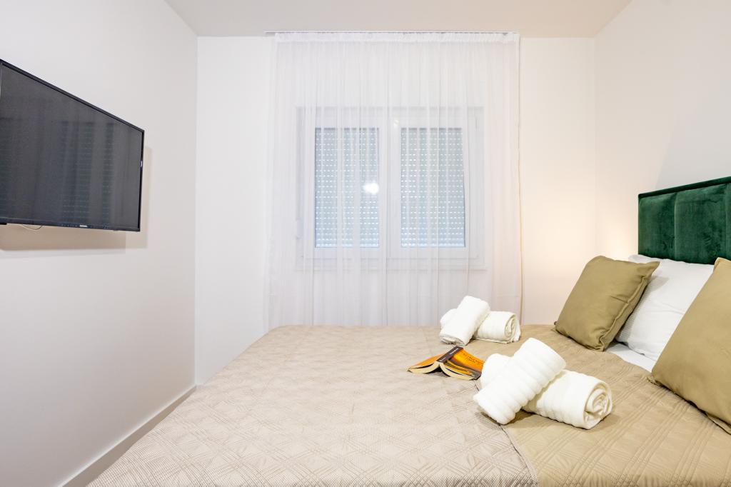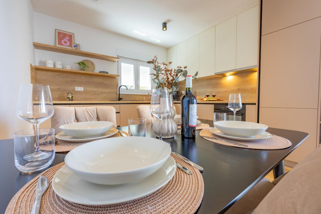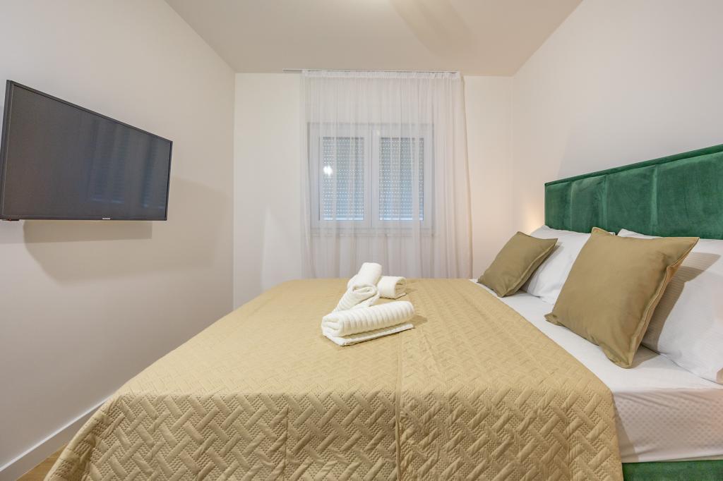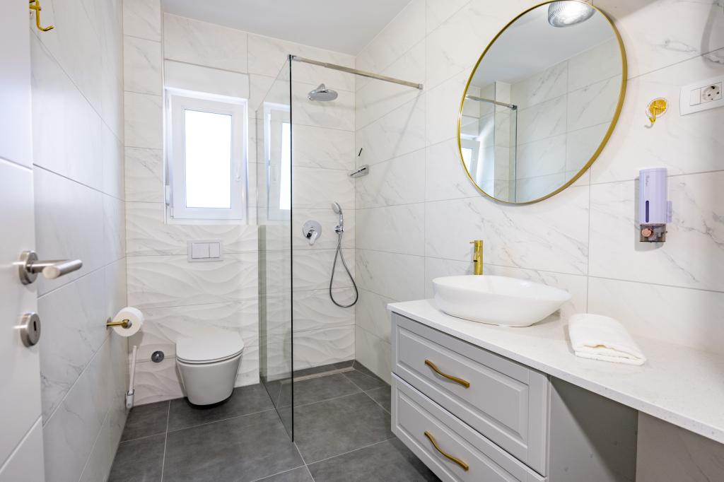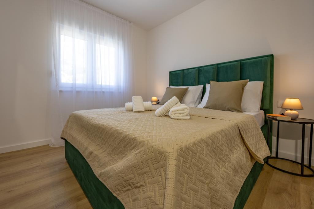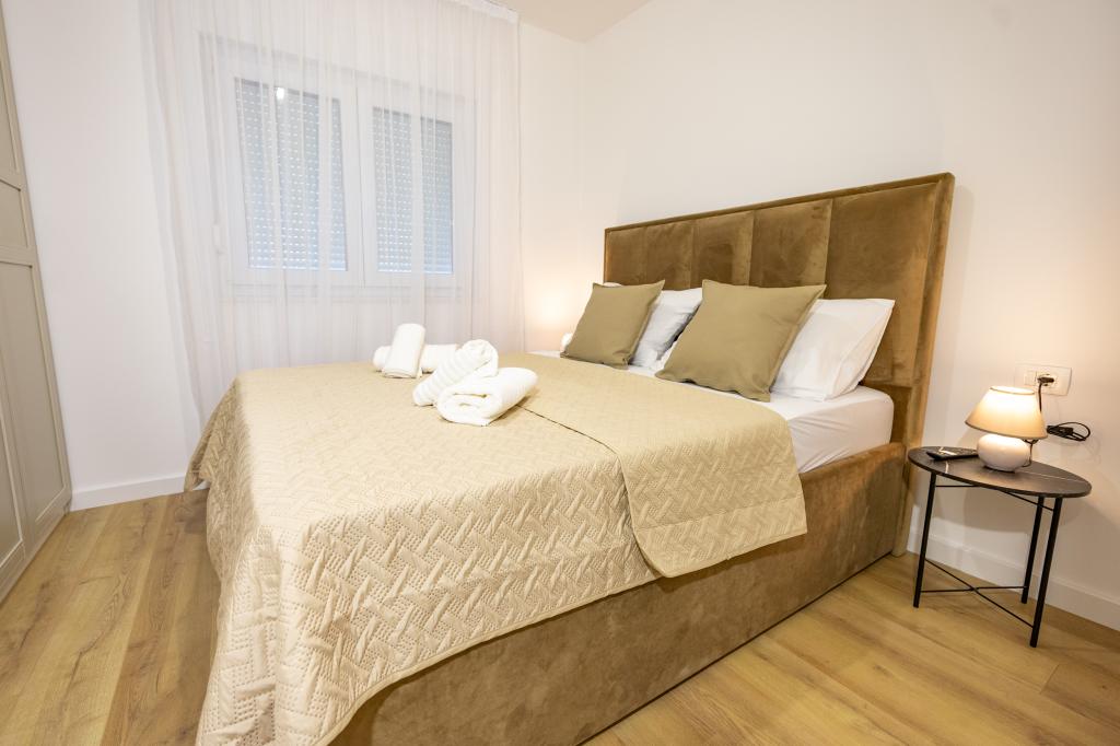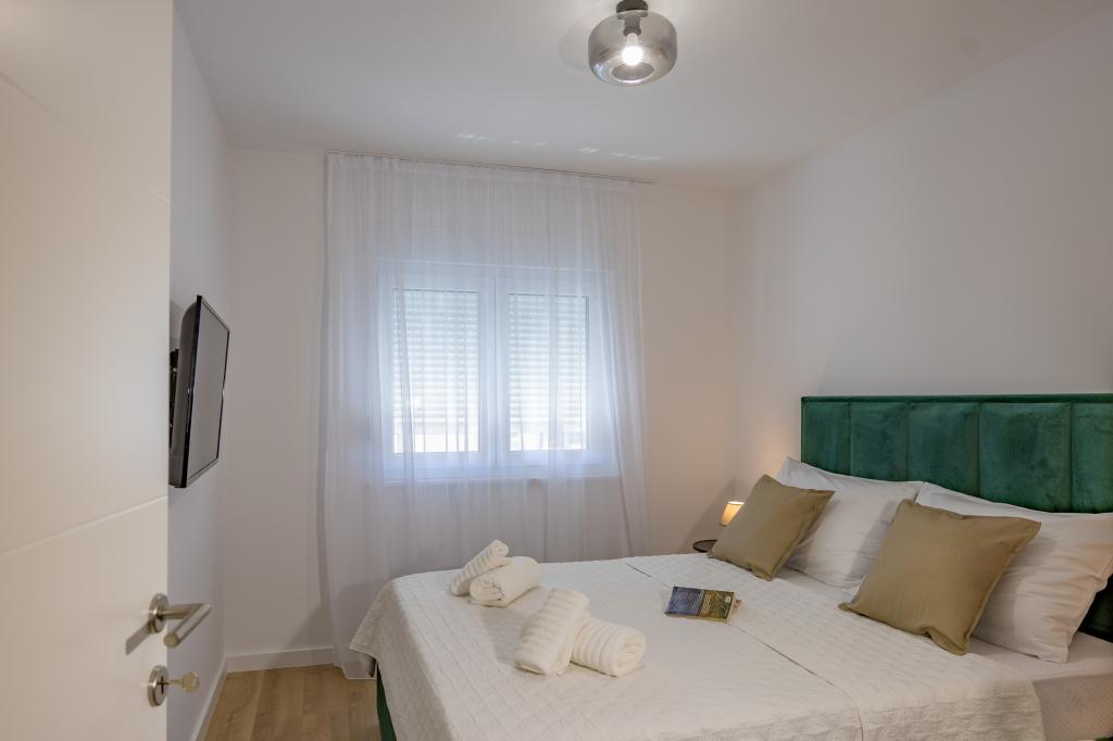 Každý apartmán vyzařuje moderní design a nově zrekonstruovaný interiér. V prostorném obývacím pokoji, zařízeném vkusným nábytkem a moderními detaily, se budete cítit jako doma. Otevřený koncept přirozeně propojuje obývací pokoj s plně vybavenou kuchyní, kde na vás čekají elegantní pracovní desky, kvalitní spotřebiče a veškerý prostor potřebný k přípravě vašich oblíbených jídel. Obývací část se otevírá na příjemný balkon - ideální místo pro ranní kávu nebo večerní relaxaci se sklenkou vína a nezapomenutelným západem slunce nad Jadranem. Každý apartmán má dvě pohodlné ložnice s manželskými postelemi, vybavené měkkým ložním prádlem a dostatkem úložného prostoru, jednu moderní koupelnu a další toaletu. Apartmány jsou klimatizované a plně vybavené: TV/SAT, internet, pračka, myčka nádobí, kávovar a vše, co potřebujete pro pohodlný a bezstarostný pobyt. Bezplatné parkování v blízkosti pláže je zahrnuto v ceně pronájmu!