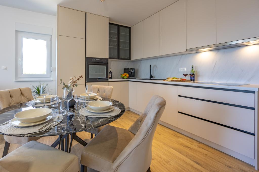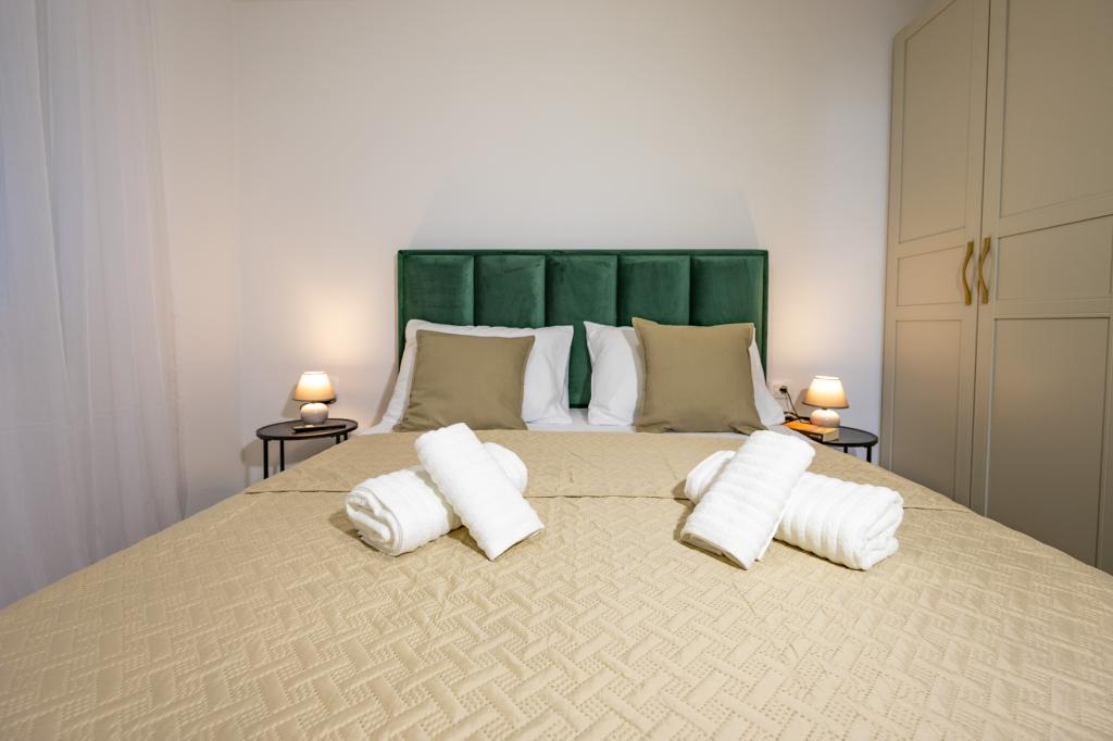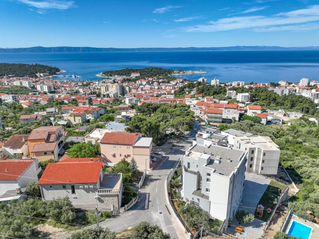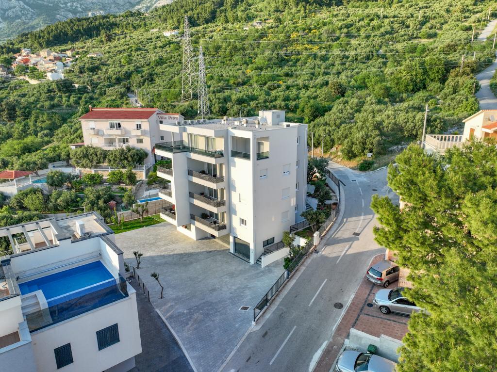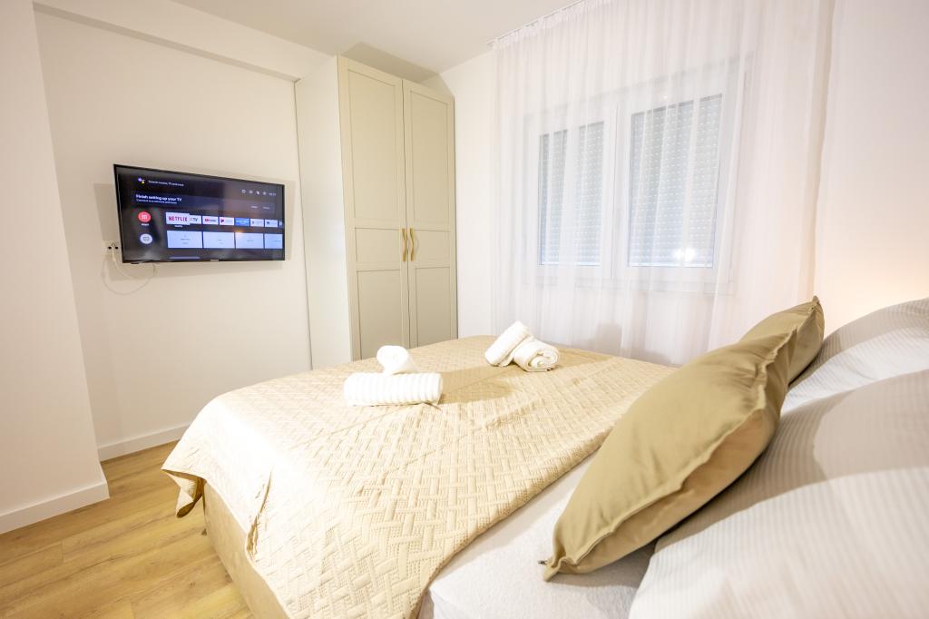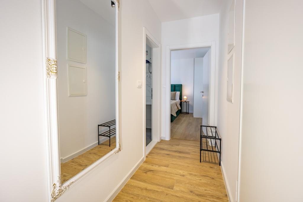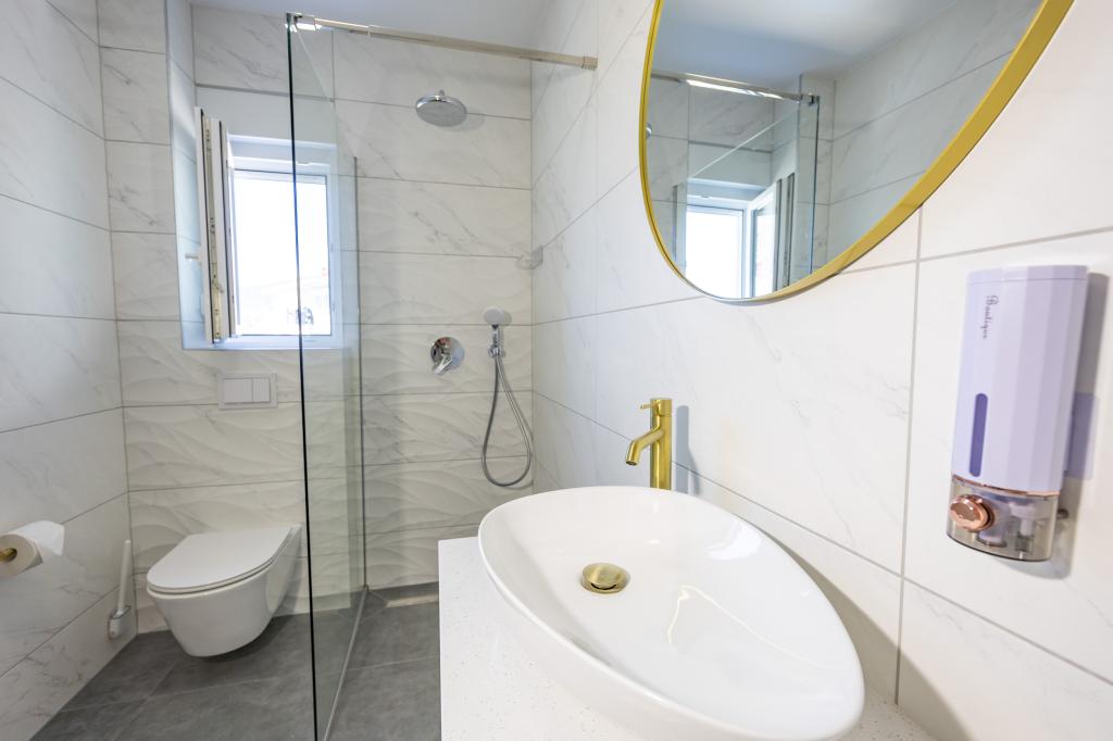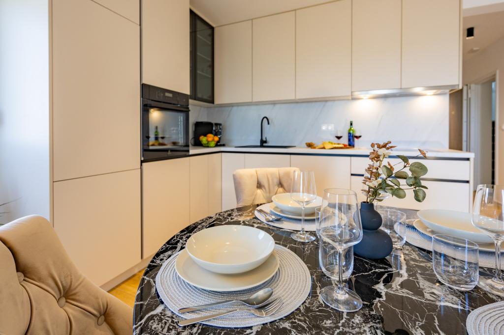Každý apartmán vyzařuje moderní design a nově zrekonstruovaný interiér. V prostorném obývacím pokoji, zařízeném vkusným nábytkem a moderními detaily, se budete cítit jako doma. Otevřený koncept přirozeně propojuje obývací pokoj s plně vybavenou kuchyní, kde na vás čekají elegantní pracovní desky, kvalitní spotřebiče a veškerý prostor potřebný k přípravě vašich oblíbených jídel. Obývací část se otevírá na příjemný balkon - ideální místo pro ranní kávu nebo večerní relaxaci se sklenkou vína a nezapomenutelným západem slunce nad Jadranem. Každý apartmán má dvě pohodlné ložnice s manželskými postelemi, vybavené měkkým ložním prádlem a dostatkem úložného prostoru, jednu moderní koupelnu a další toaletu. Apartmány jsou klimatizované a plně vybavené: TV/SAT, internet, pračka, myčka nádobí, kávovar a vše, co potřebujete pro pohodlný a bezstarostný pobyt. Bezplatné parkování v blízkosti pláže je zahrnuto v ceně pronájmu!