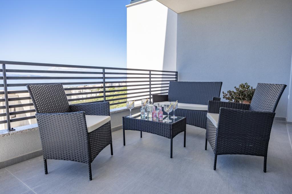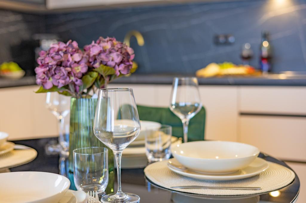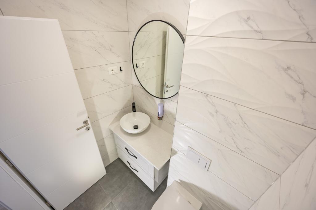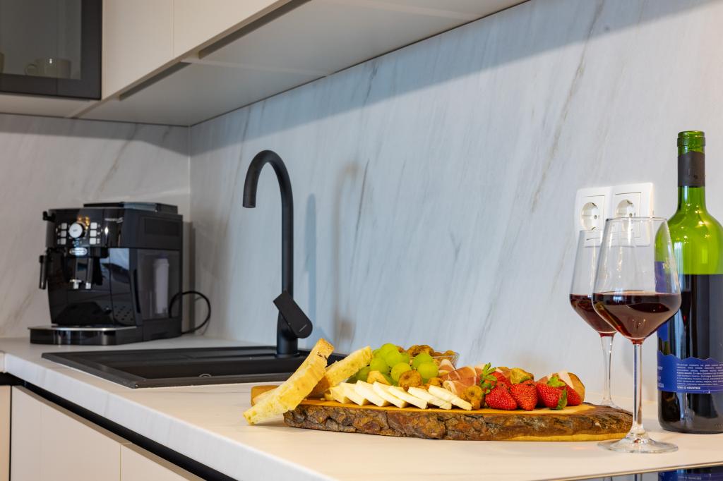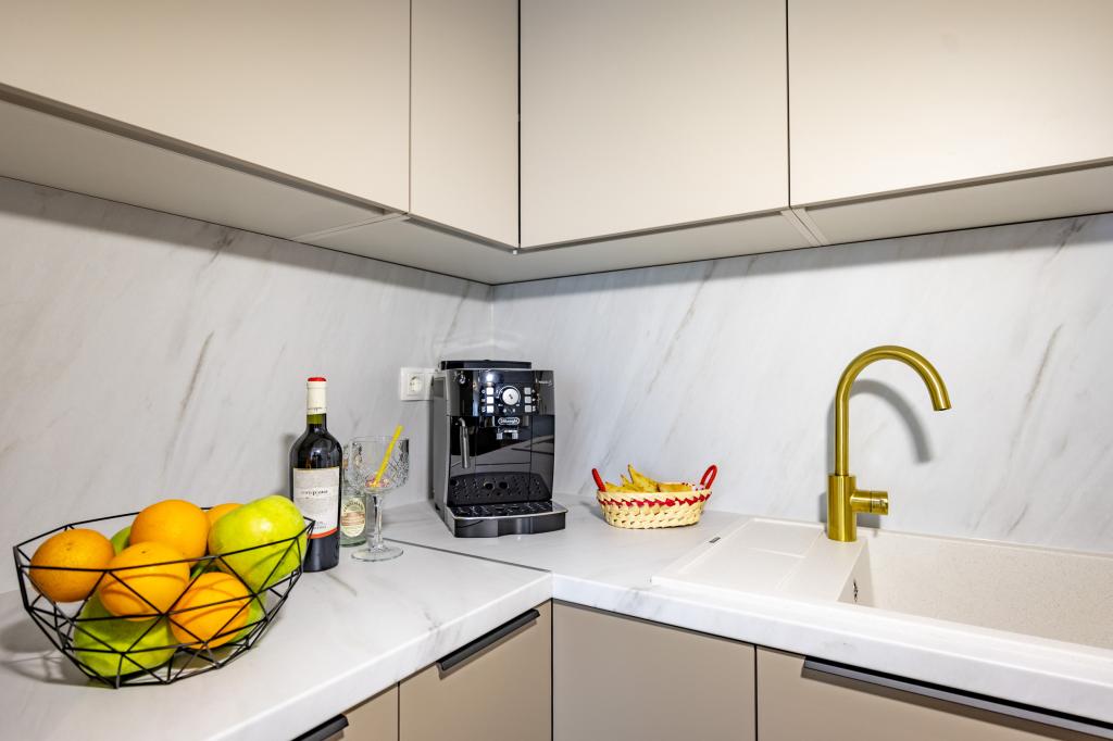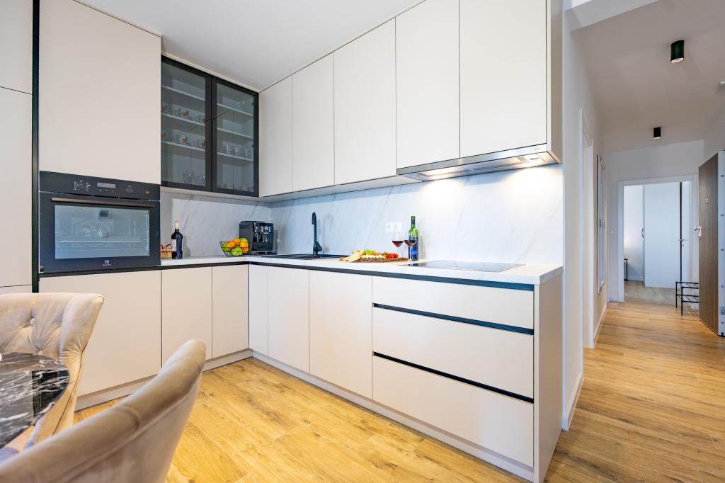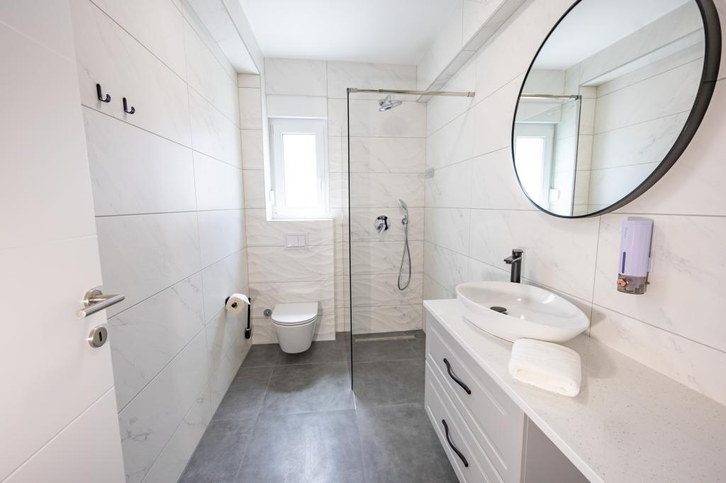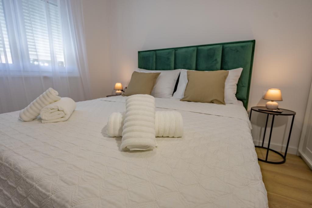 Každý apartmán vyzařuje moderní design a nově zrekonstruovaný interiér. V prostorném obývacím pokoji, zařízeném vkusným nábytkem a moderními detaily, se budete cítit jako doma. Otevřený koncept přirozeně propojuje obývací pokoj s plně vybavenou kuchyní, kde na vás čekají elegantní pracovní desky, kvalitní spotřebiče a veškerý prostor potřebný k přípravě vašich oblíbených jídel. Obývací část se otevírá na příjemný balkon - ideální místo pro ranní kávu nebo večerní relaxaci se sklenkou vína a nezapomenutelným západem slunce nad Jadranem. Každý apartmán má dvě pohodlné ložnice s manželskými postelemi, vybavené měkkým ložním prádlem a dostatkem úložného prostoru, jednu moderní koupelnu a další toaletu. Apartmány jsou klimatizované a plně vybavené: TV/SAT, internet, pračka, myčka nádobí, kávovar a vše, co potřebujete pro pohodlný a bezstarostný pobyt. Bezplatné parkování v blízkosti pláže je zahrnuto v ceně pronájmu!