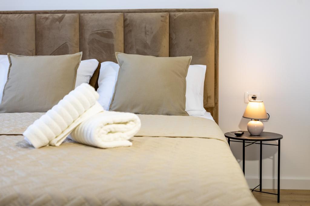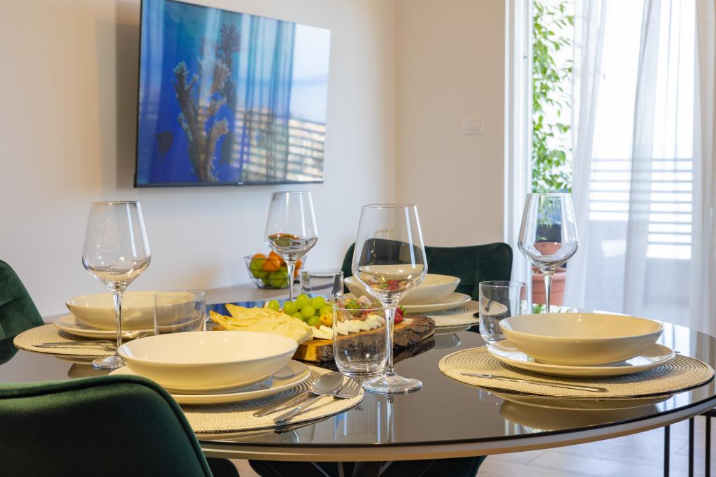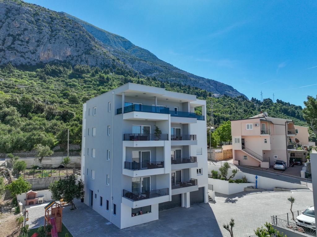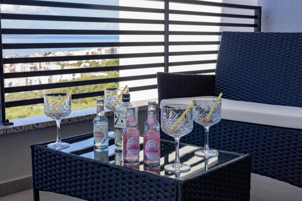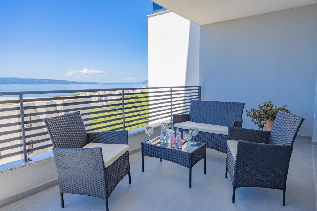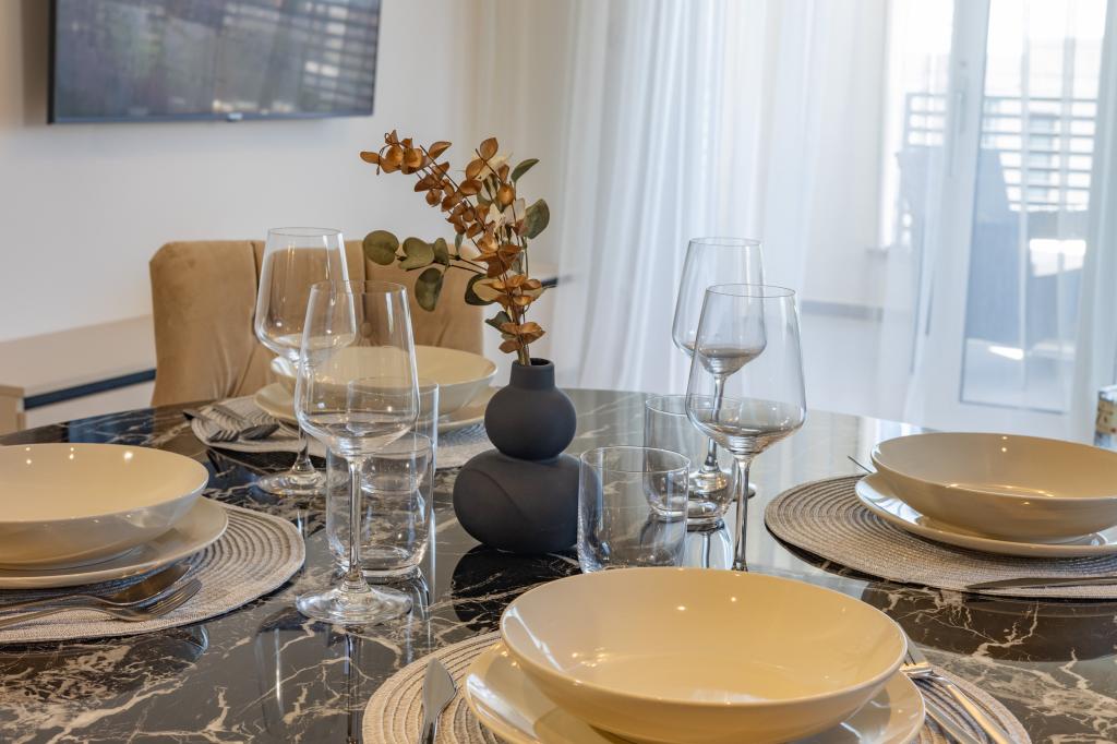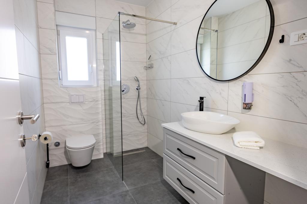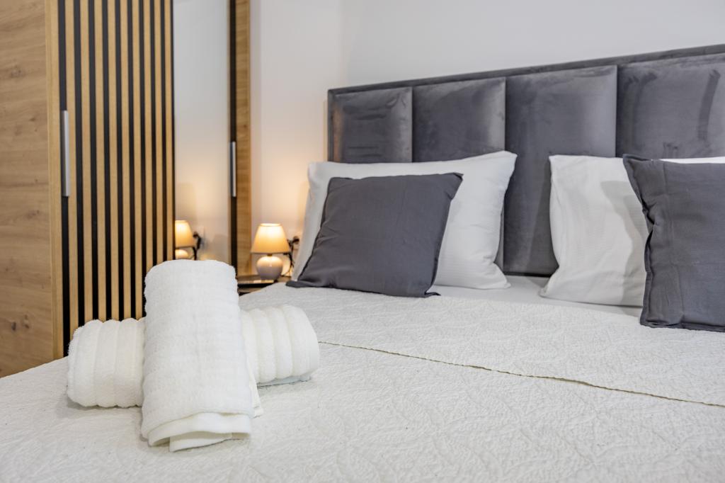 Každý apartmán vyzařuje moderní design a nově zrekonstruovaný interiér. V prostorném obývacím pokoji, zařízeném vkusným nábytkem a moderními detaily, se budete cítit jako doma. Otevřený koncept přirozeně propojuje obývací pokoj s plně vybavenou kuchyní, kde na vás čekají elegantní pracovní desky, kvalitní spotřebiče a veškerý prostor potřebný k přípravě vašich oblíbených jídel. Obývací část se otevírá na příjemný balkon - ideální místo pro ranní kávu nebo večerní relaxaci se sklenkou vína a nezapomenutelným západem slunce nad Jadranem. Každý apartmán má dvě pohodlné ložnice s manželskými postelemi, vybavené měkkým ložním prádlem a dostatkem úložného prostoru, jednu moderní koupelnu a další toaletu. Apartmány jsou klimatizované a plně vybavené: TV/SAT, internet, pračka, myčka nádobí, kávovar a vše, co potřebujete pro pohodlný a bezstarostný pobyt. Bezplatné parkování v blízkosti pláže je zahrnuto v ceně pronájmu!