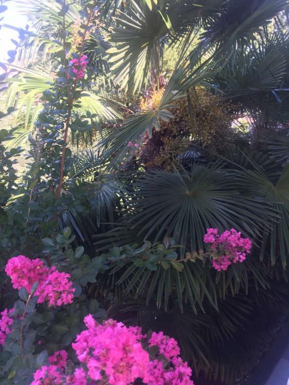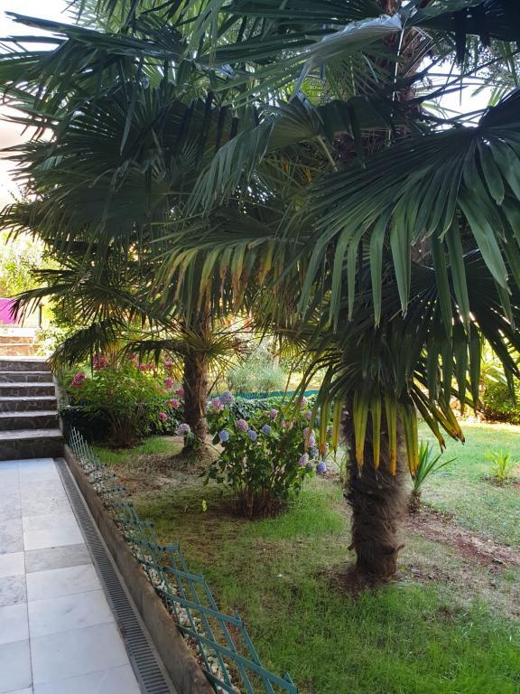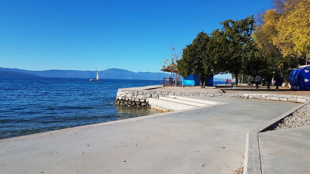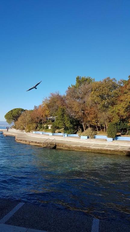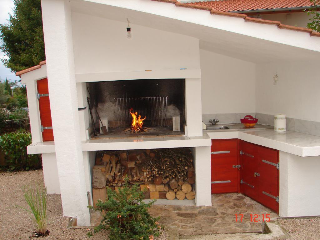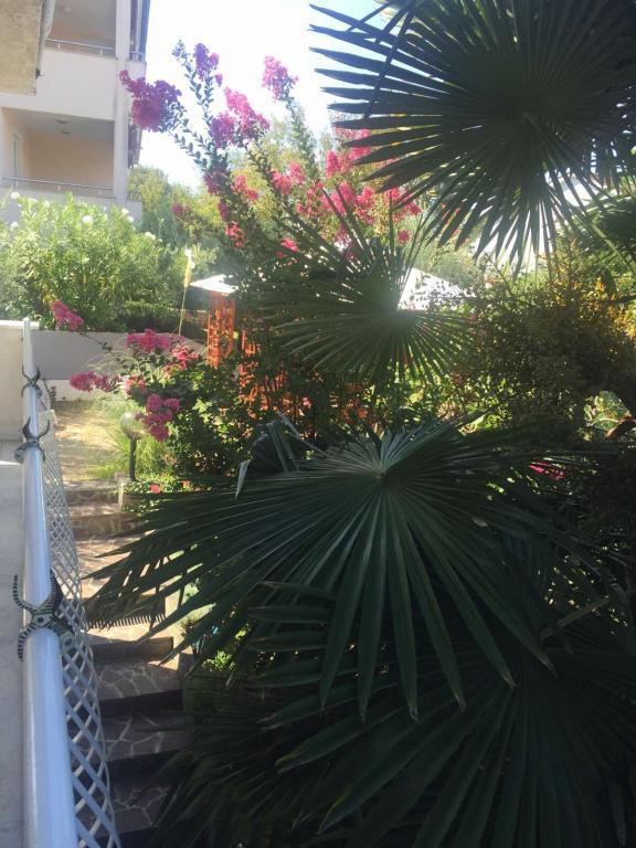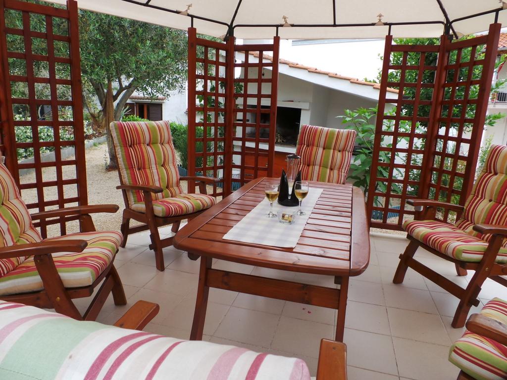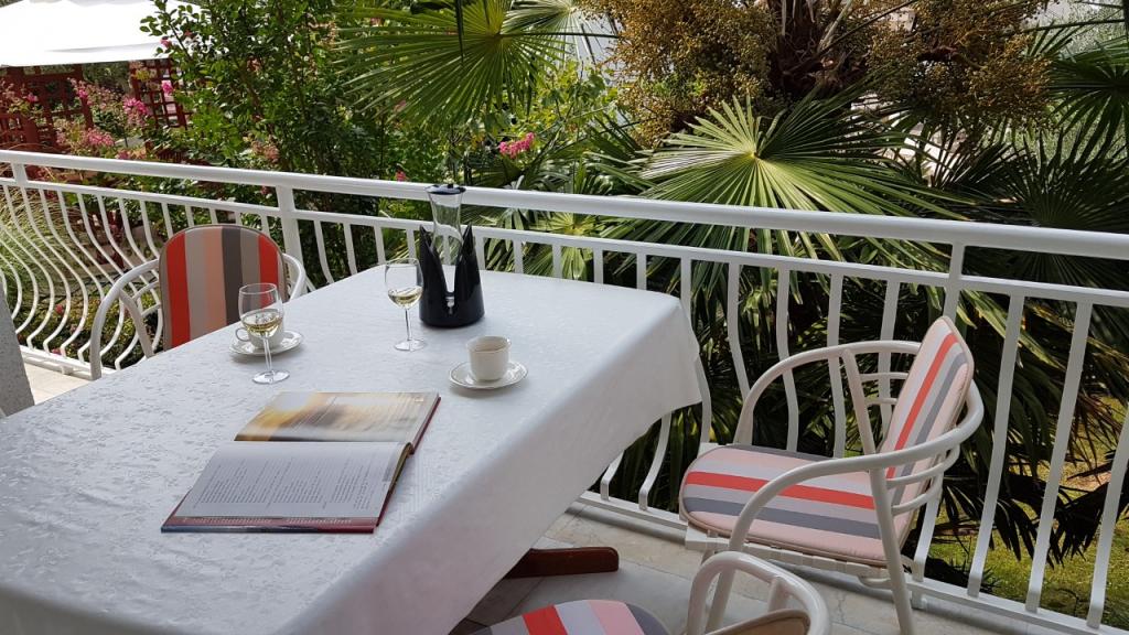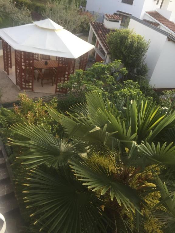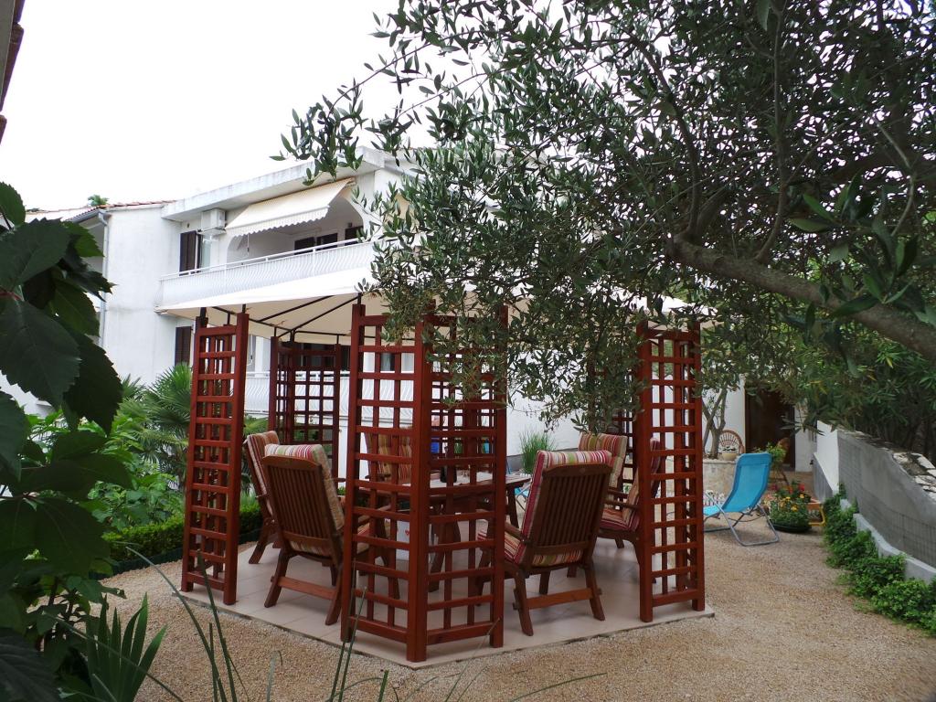 Pohled do zahrady a pavilonu, kde si hosté večer užívají romantické prostředí diskrétního osvětlení a květin se sklenkou dobrého vína a grilovanými pochoutkami. Vůně místních rybích specialit vychází z nedaleké rybí restaurace / 200 m od bytu /. Další zařízení v okolí: bowling, jízda na koni, různé vodní sporty, půjčovna kol, lodě, organizované výlety, dlouhé a krásné promenády jsou možnosti, které toto místo poskytuje.