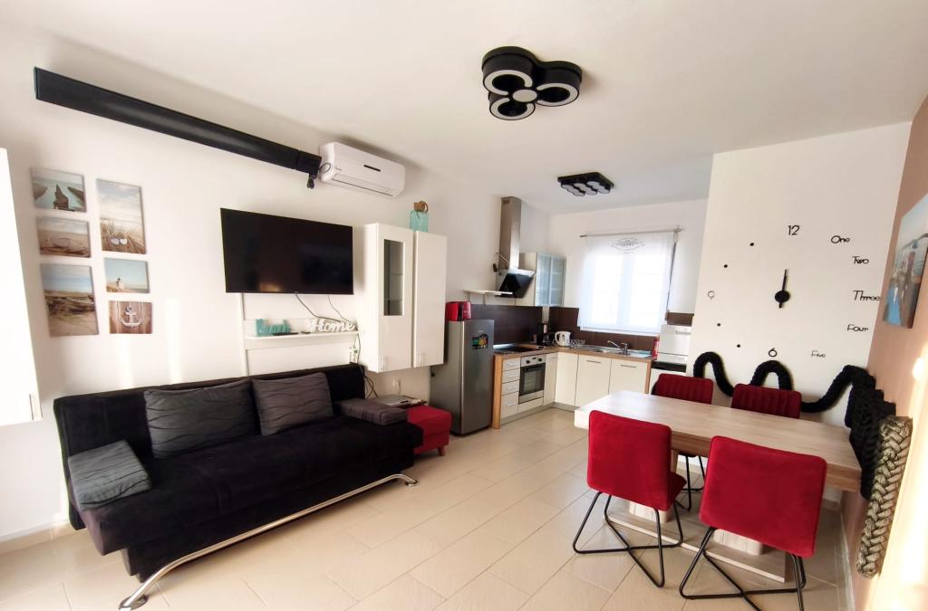 Plně zařízený apartmán se nachází v přízemí. Skládá se z jedné ložnice s manželskou postelí, kuchyně s jídelnou, jedné toalety a obývacího pokoje se dvěma pohovkami, z nichž jednu lze rozložit jako přistýlku. Za poplatek je možné se ubytovat s domácími mazlíčky a máme k dispozici kotviště/bóji, které mohou naši hosté využít k ukotvení své menší lodi.