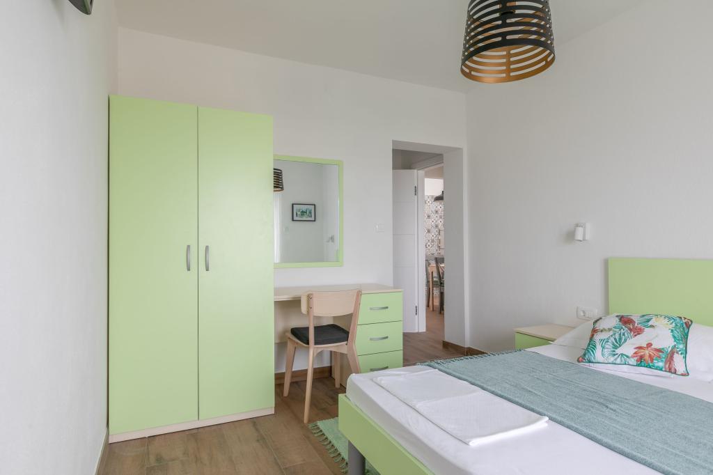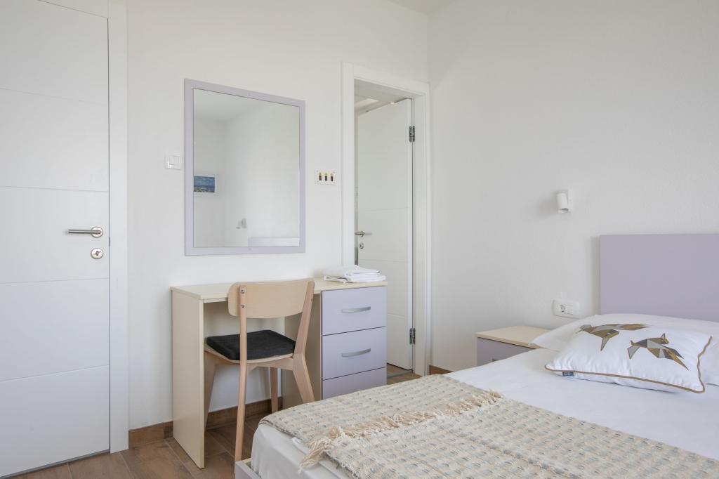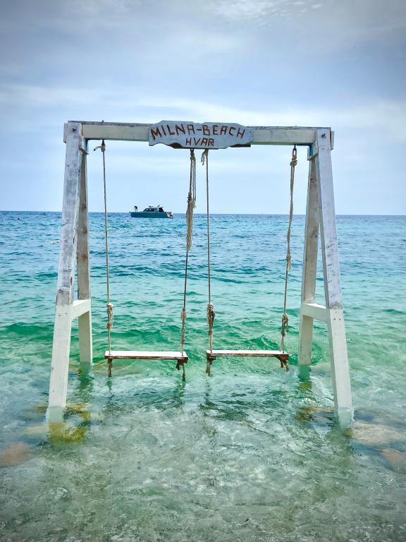 Dvoulůžkové a čtyřlůžkové apartmány a apartmán s velkou terasou se nacházejí v klidné části Milna. Nachází se 5 minut od centra a první pláže. Vhodné pro rodiny s dětmi. Blízkost města Hvar (3 km) je vhodná i pro mladé lidi, kde si přes den užívají výhod městečka Milna a skrytých zátok ke koupání a v noci jim město Hvar poskytuje nezapomenutelnou noční zábavu .