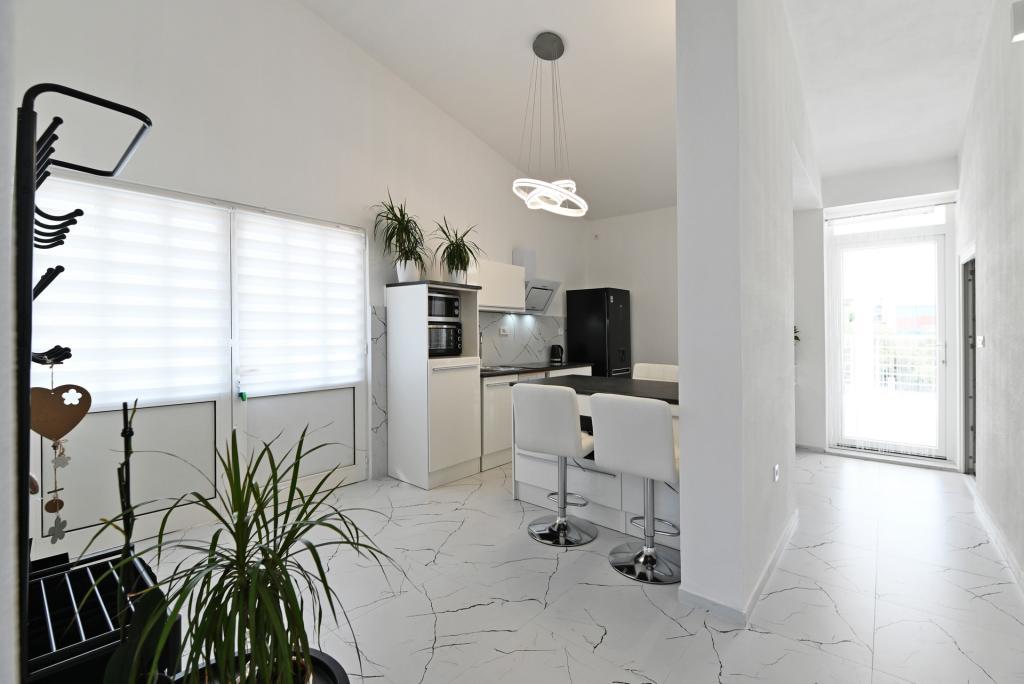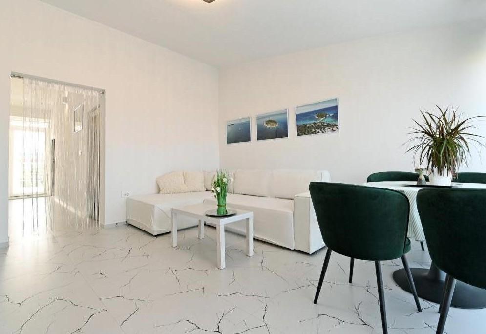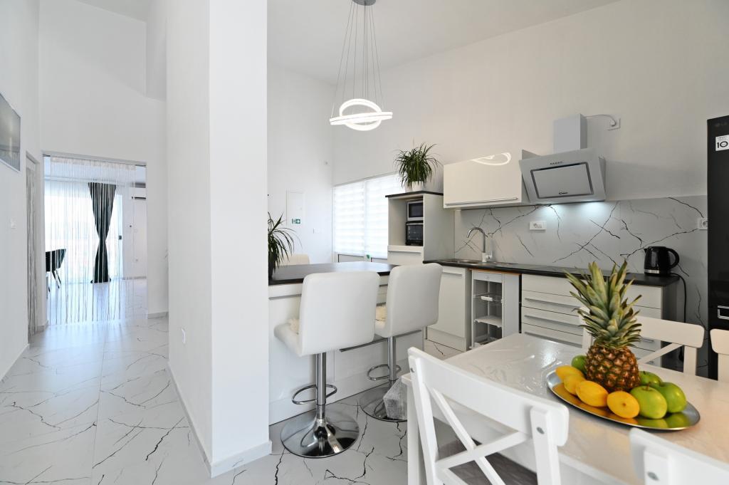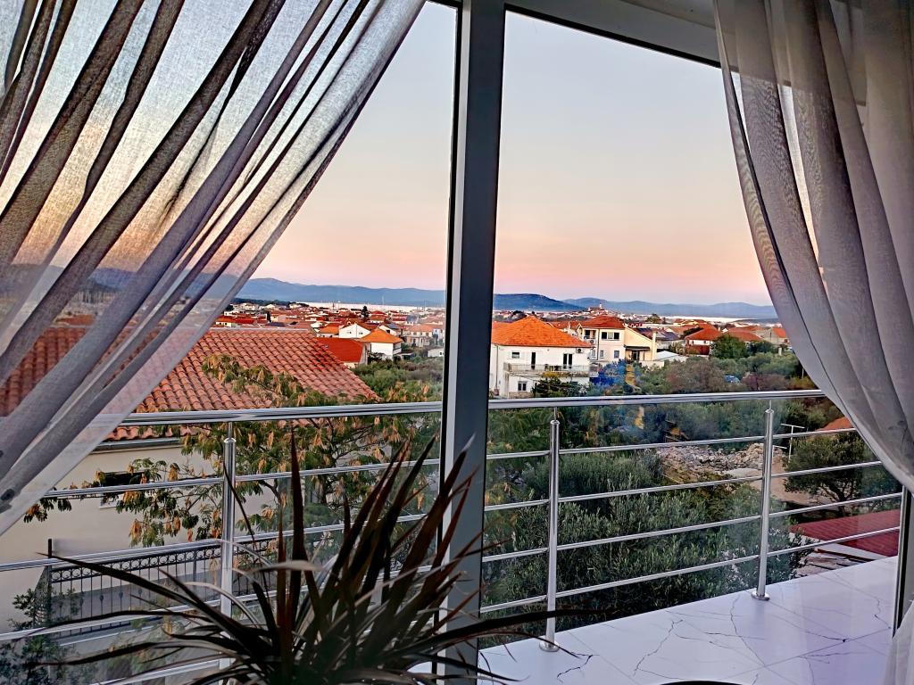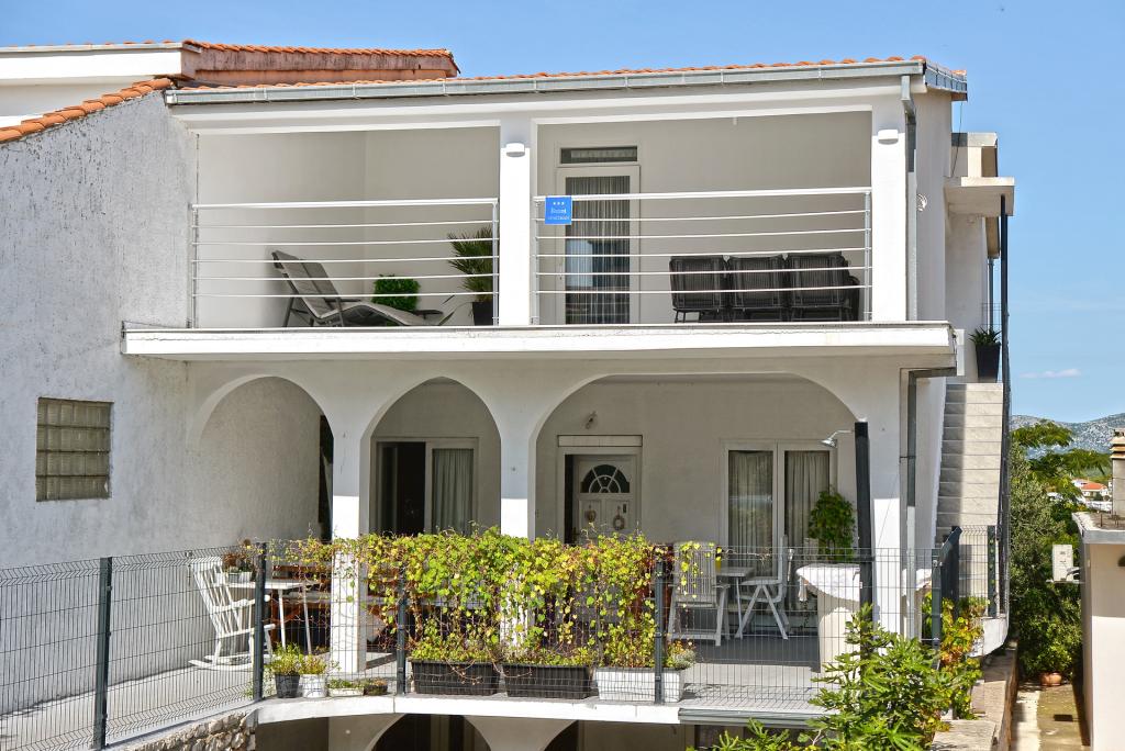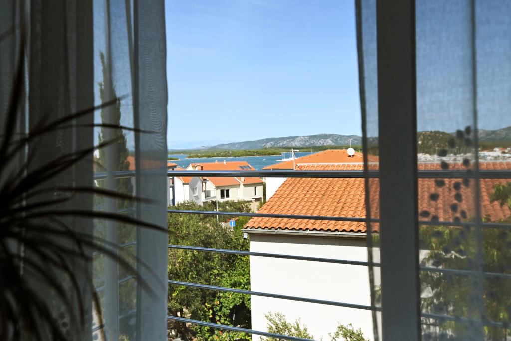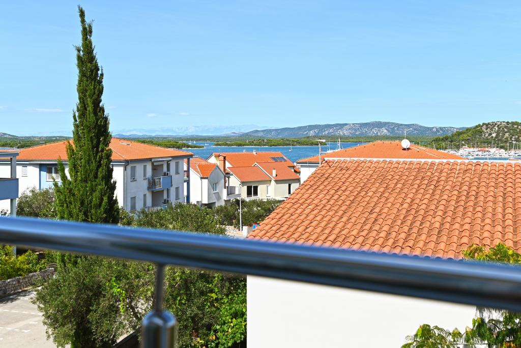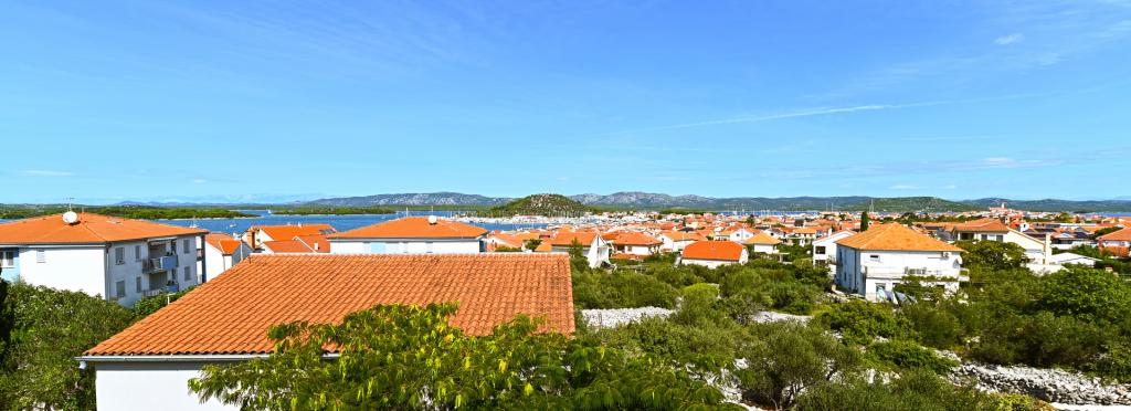 Nově kompletně zařízený a moderně vybavený apartmán o rozloze 70 m2 v prvním patře rodinného domu. Apartmán má samostatný vchod a výhled na moře z malé terasy, která se propojuje s obývacím pokojem otevřením velké prosklené stěny téměř po celé délce obývacího pokoje. Při popíjení ranní kávy ve své oáze klidu se můžete dívat na ostrovy Murter a moře, panorama města a v dálce Velebit, Betinu a moře kolem Betiny, protože celé patro je jen vaše. Z jídelny máte přístup na velkou terasu o rozloze 30 m2, kde si můžete u velkého zahradního proskleného stolu vychutnat snídani, oběd nebo večeři. Nabízíme přenosný elektrický gril, se kterým si můžete na terase připravovat například mořské plody, které si můžete denně čerstvé pořídit z rybářské lodi nebo na rybím trhu v centru Murteru. Koupelna je velká se systémem walk-in. Celý apartmán má galerijní výšku. Parkování k apartmánu je zdarma a nachází se před domem. K dispozici je také Wi-Fi připojení zdarma.