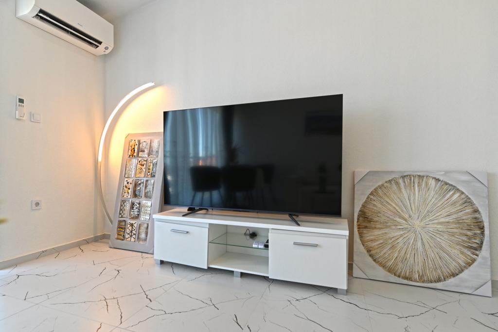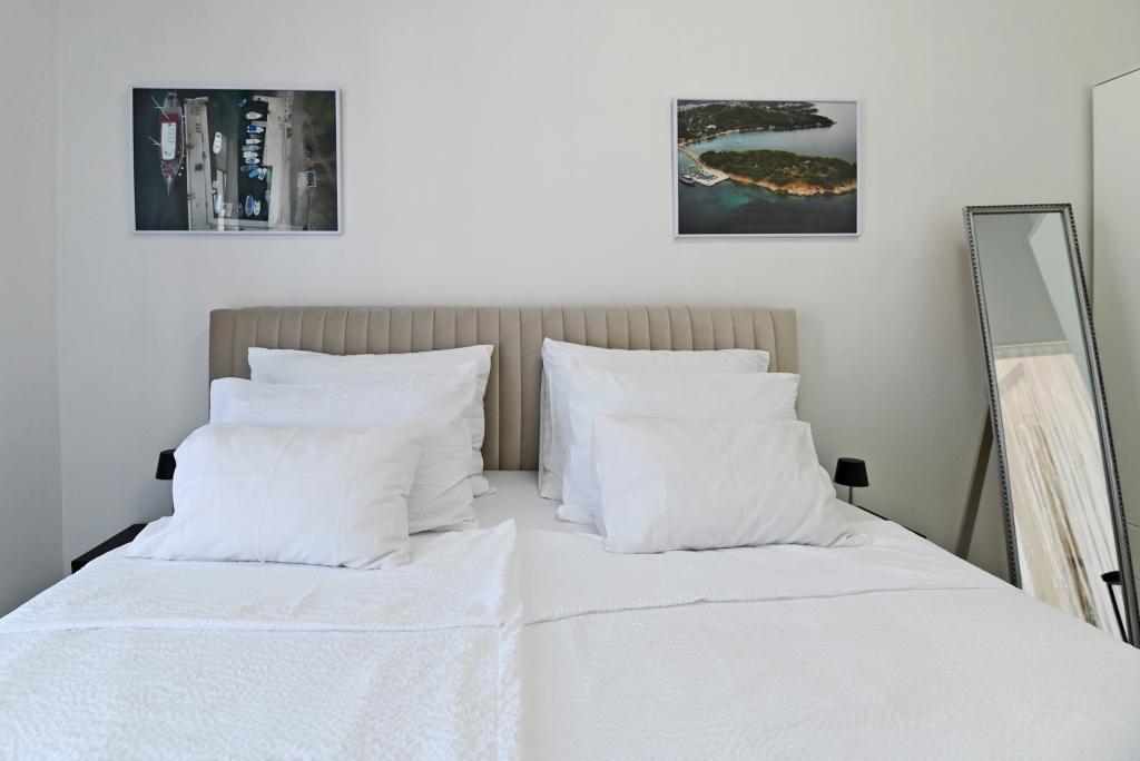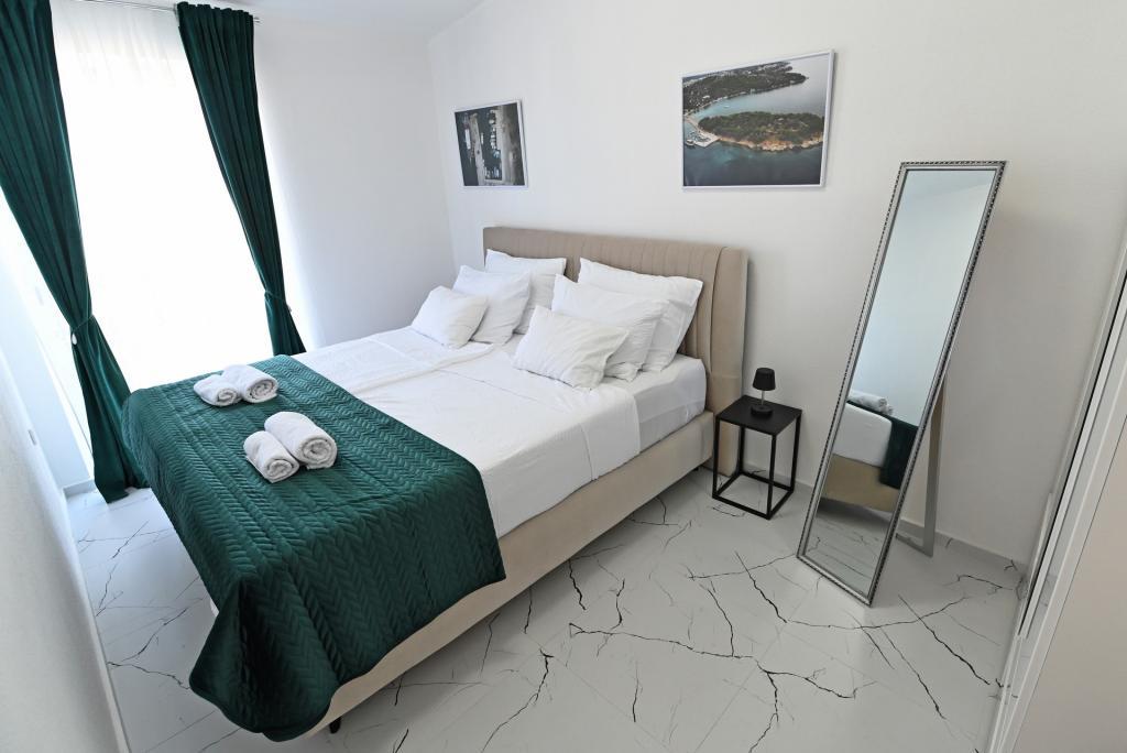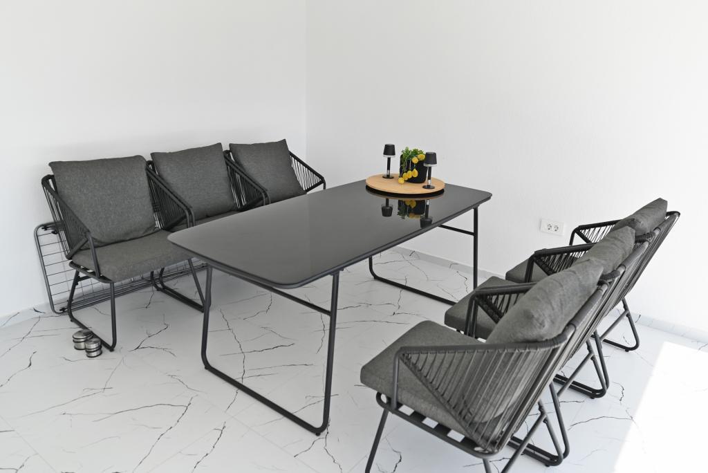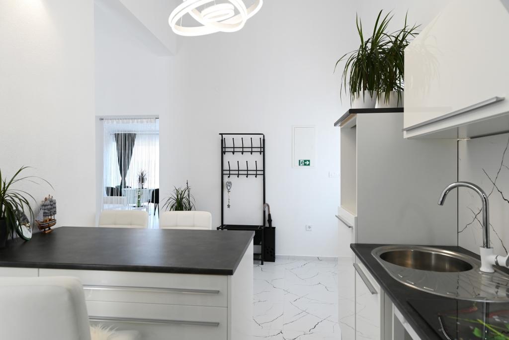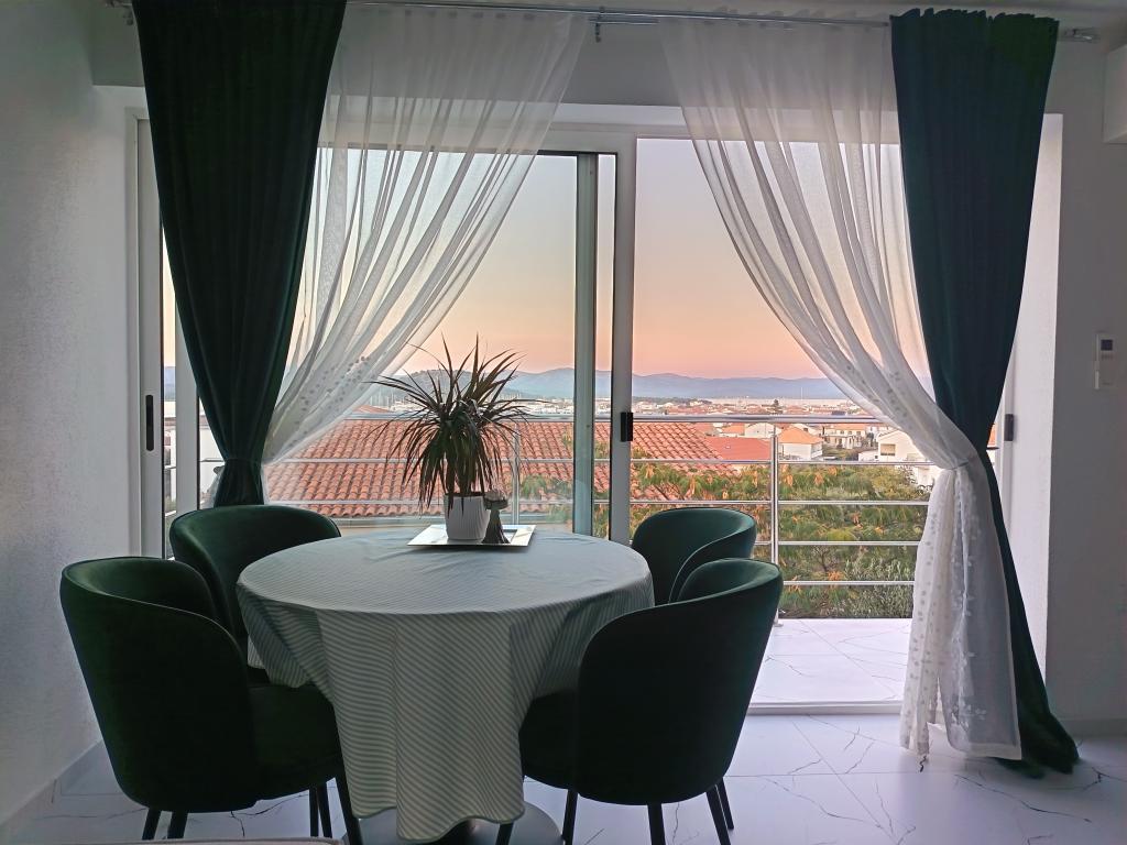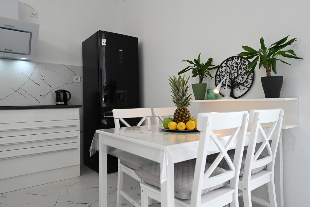 Nově kompletně zařízený a moderně vybavený apartmán o rozloze 70 m2 v prvním patře rodinného domu. Apartmán má samostatný vchod a výhled na moře z malé terasy, která se propojuje s obývacím pokojem otevřením velké prosklené stěny téměř po celé délce obývacího pokoje. Při popíjení ranní kávy ve své oáze klidu se můžete dívat na ostrovy Murter a moře, panorama města a v dálce Velebit, Betinu a moře kolem Betiny, protože celé patro je jen vaše. Z jídelny máte přístup na velkou terasu o rozloze 30 m2, kde si můžete u velkého zahradního proskleného stolu vychutnat snídani, oběd nebo večeři. Nabízíme přenosný elektrický gril, se kterým si můžete na terase připravovat například mořské plody, které si můžete denně čerstvé pořídit z rybářské lodi nebo na rybím trhu v centru Murteru. Koupelna je velká se systémem walk-in. Celý apartmán má galerijní výšku. Parkování k apartmánu je zdarma a nachází se před domem. K dispozici je také Wi-Fi připojení zdarma.
