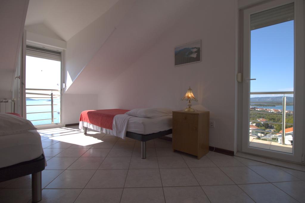 Apartmán s krásným výhledem na moře se nachází ve výborné lokalitě pouhých 300 metrů od moře. Byt má rozlohu 75 m2. Má dvě ložnice, kde se může ubytovat 5 dospělých. Má obývací pokoj. Má přistýlku pro jednu osobu. Má koupelnu se sprchovým koutem. Plocha balkonu/terasy je 12 m2. Byt se nachází ve druhém patře domu. Byt je vybaven TV, satelitem, troubou. Parkování je zajištěno a zahrnuto v ceně. K dispozici je venkovní gril, který lze použít. Byt je asi 1000 m od centra města a 300 m od moře nebo první pláže v Murteru. Byt má krásný výhled na moře, písečnou zátoku Slanica a ostrovy Kornati.