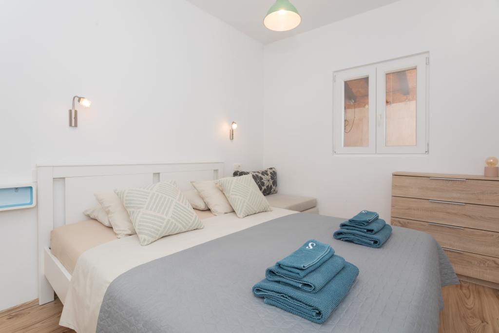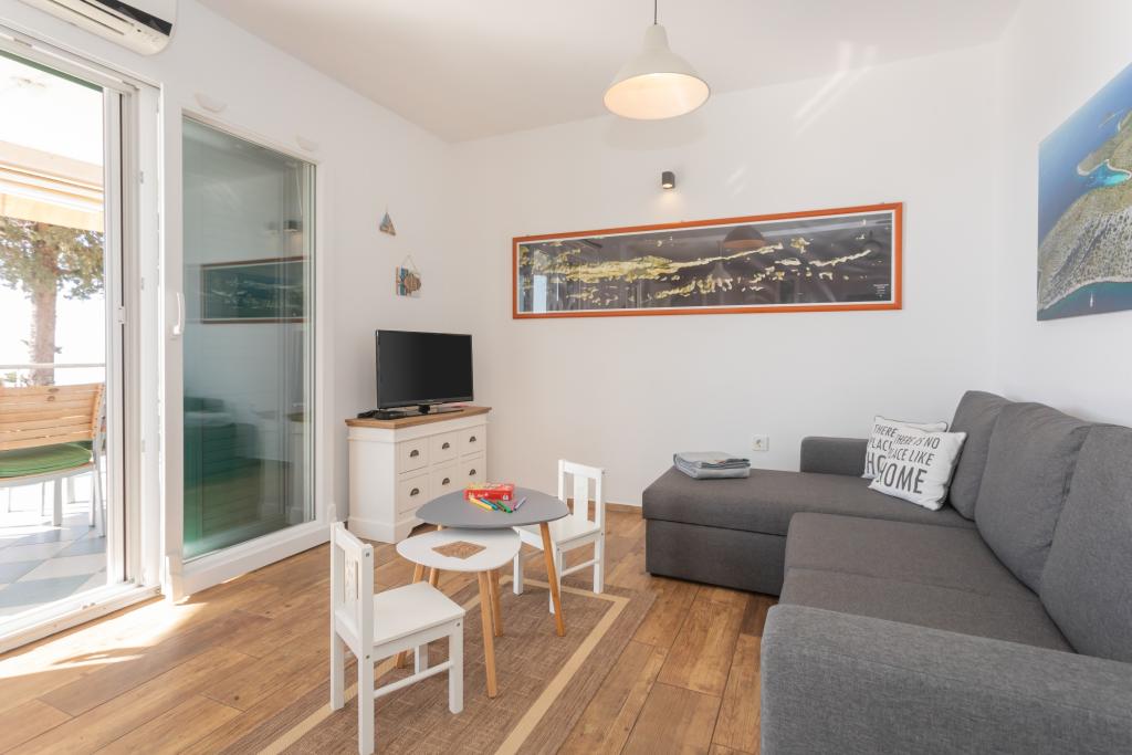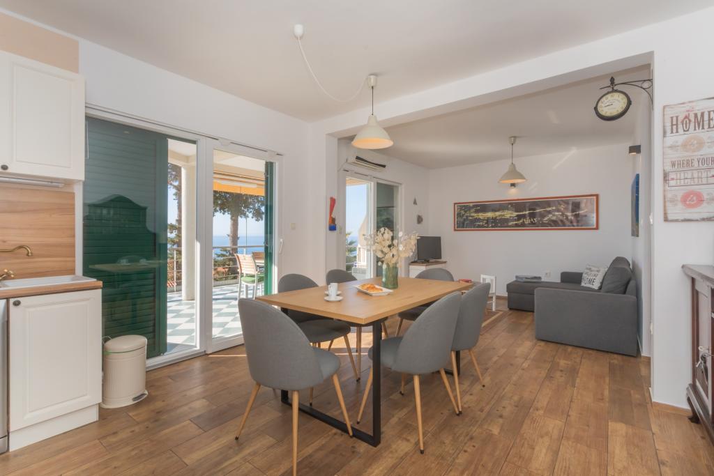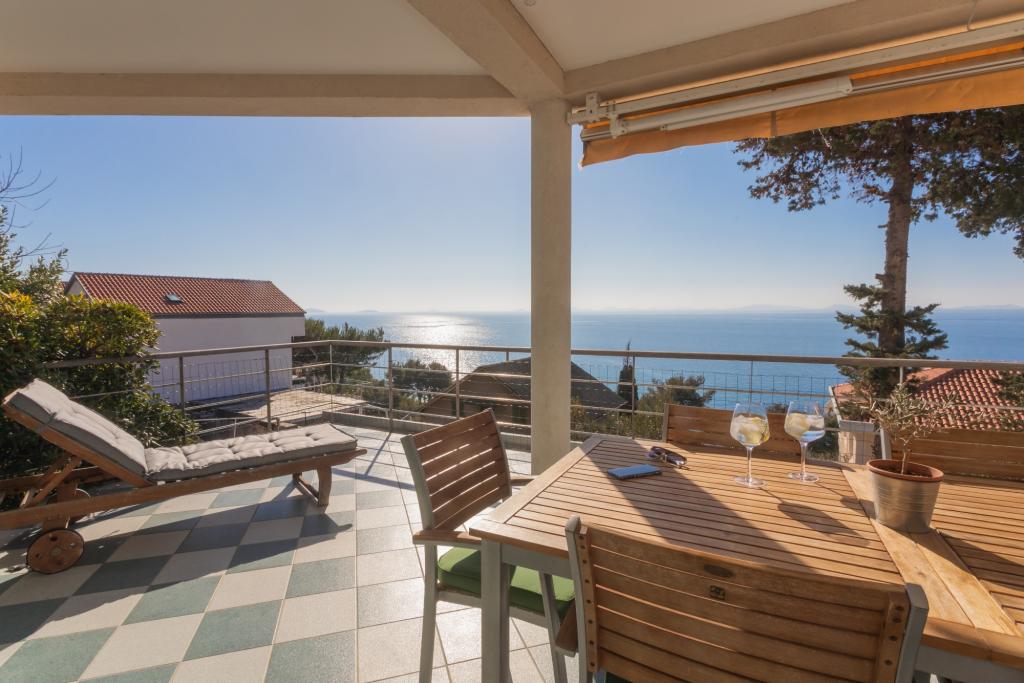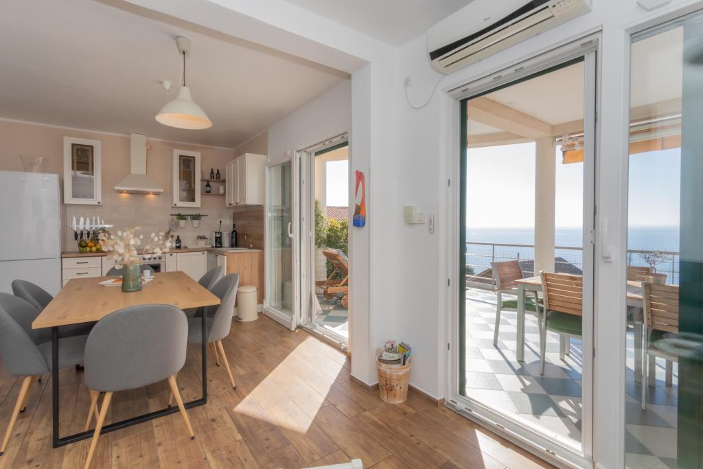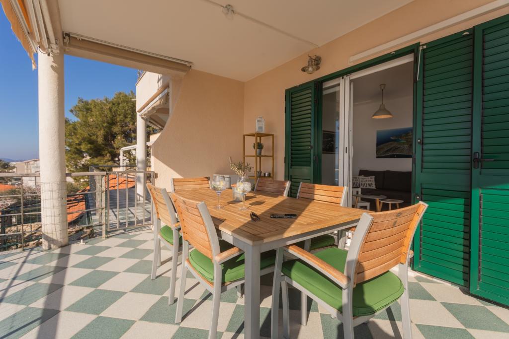 Moderně zařízený apartmán s krásným výhledem na moře, pouhých 40 m od moře, o rozloze 65 m2. Apartmán má dvě ložnice pro 4 osoby plus přistýlku pro jednu osobu, koupelnu, obývací pokoj, kuchyň s jídelnou a krásnou terasu o rozloze téměř 25 m2. Apartmán se nachází v prvním patře domu a je vybaven TV/sat, PS 4, wi-fi, klimatizací, topením, troubou, varnou konvicí, kávovarem, myčkou nádobí a pračkou. Apartmán má gril a letní kuchyň před vchodem. Parkování je zajištěno a je zahrnuto v ceně. Samotný apartmán se nachází ve velmi klidné části Murteru, 1100 m od centra města, 40 m od moře a skalnaté pláže, 300 m od písečné a oblázkové pláže Čigrađa a přibližně 800 m od písečné pláže Slanica.