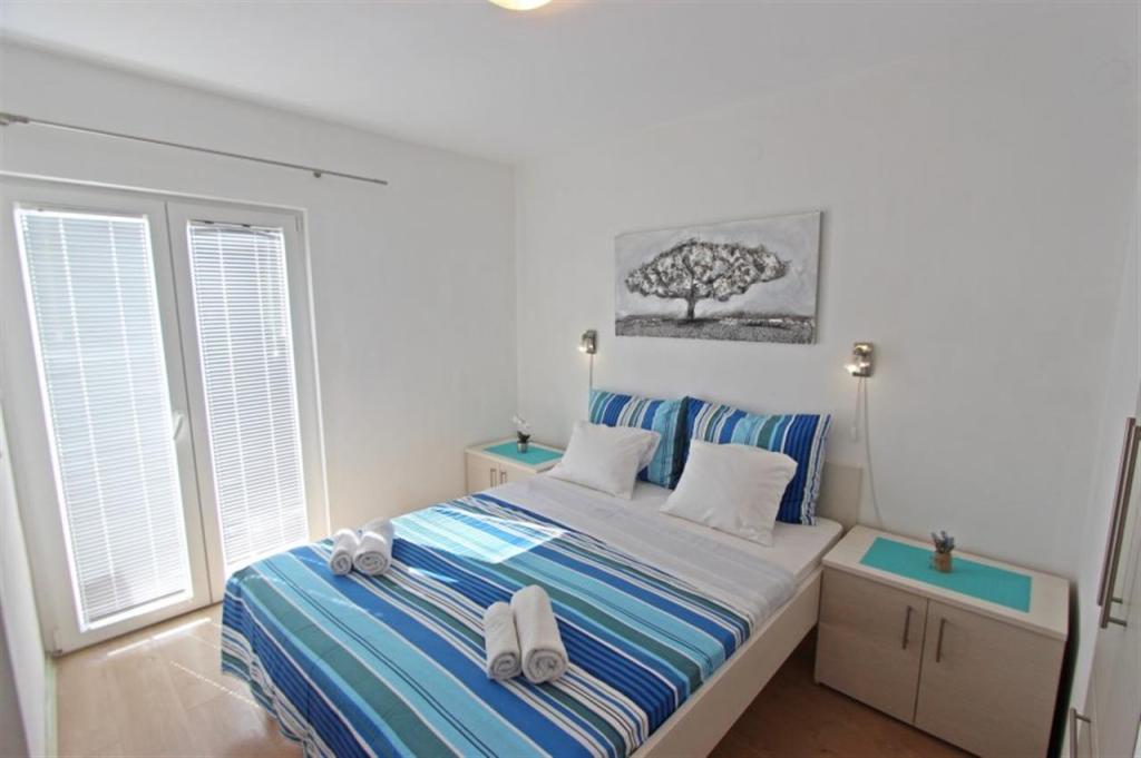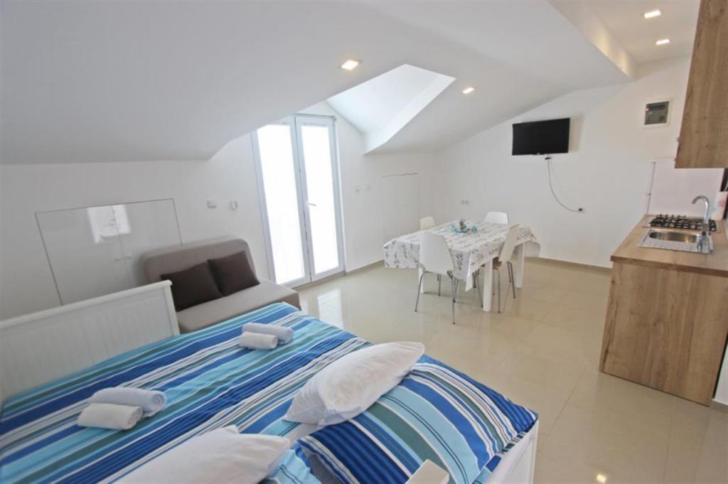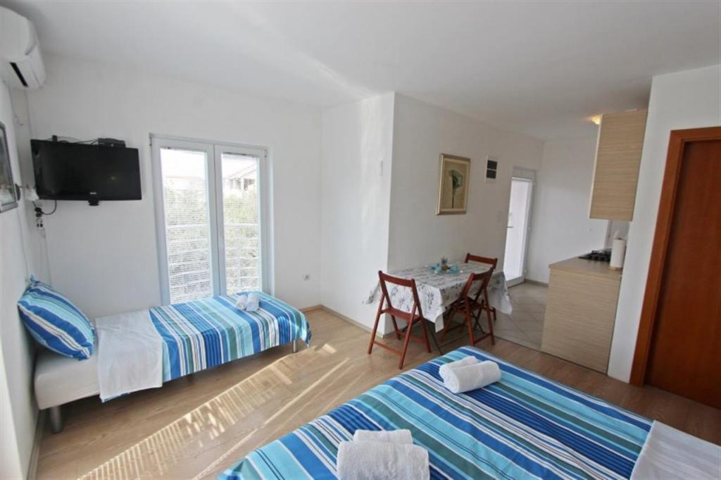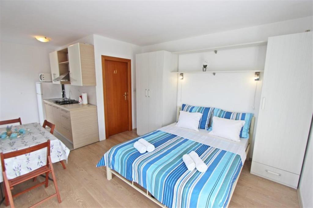 Apartmány pro čtyři osoby 2 + 2 nebo studio apartmány 2 + 1. Skládají se z ložnice (jedna manželská postel) a pokoje se dvěma samostatnými lůžky (rozměry 200x90) nebo ložnice a lůžka v obývacím pokoji, zatímco studiové apartmány se skládají z manželské postele s přistýlkou, kuchyně, koupelny a velké terasy. (15m2 / 18m2). V přízemí je také místnost s pračkou, kterou mohou hosté využívat. Apartmány jsou vybaveny TV a klimatizací, wi-fi, mikrovlnnou troubou a lednicí s mrazákem. Před apartmánem máme venkovní gril, který mohou hosté kdykoliv využít. Parkování je zajištěno a nachází se ve dvoře. Vzdálenost od první pláže a obchodů je 250 m, zatímco centrum je 1 km daleko