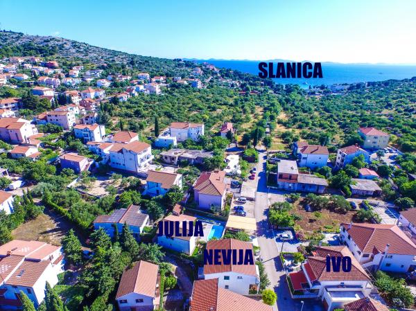 Nedaleko písečné pláže Slanica, na kterou se dostanete přes pěší zónu, nabízíme ubytování ve 2 apartmánech a domě s bazénem. Ideální pro rodiny s dětmi. V domě NEVIJA jsou k dispozici 2 dvoupokojové apartmány pro 4 osoby. Apartmány se nacházejí v prvním patře. Každý apartmán má vlastní balkon. K dispozici je parkování, klimatizace, TV a WI FI internet. Dům s bazénem JULIJA je krásně a moderně zařízený rekreační dům sestávající ze dvou pater, každé s jednou plně vybavenou ubytovací jednotkou, zatímco před domem se nachází prostor, kde budete trávit většinu času, u bazénu, grilování, terasa a společenské prostory. Poznámka: bazén je určen výhradně pro hosty domu JULIJA.
