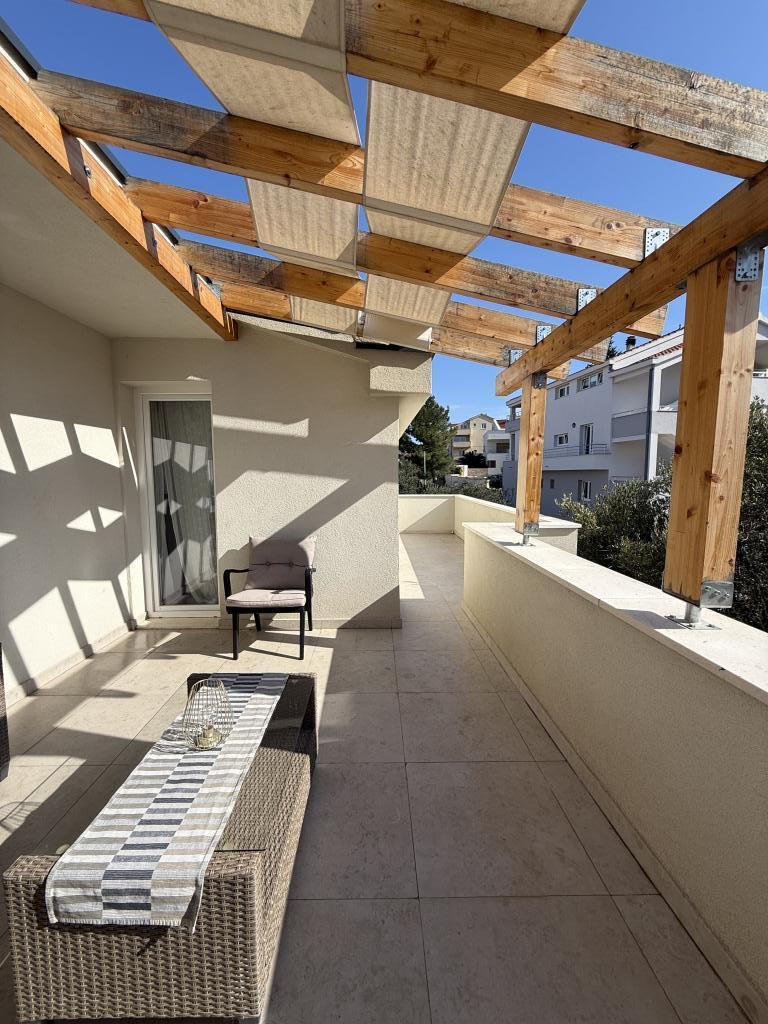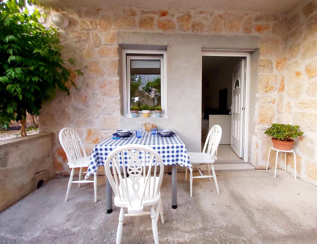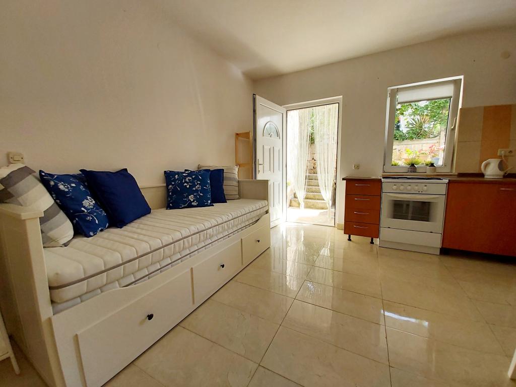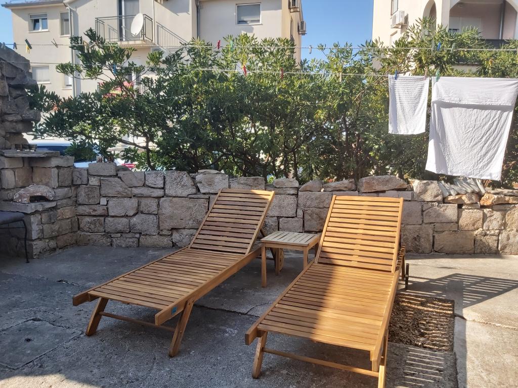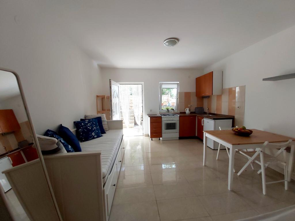 Studiový apartmán s terasou o rozloze 12 m2. Apartmán je určen pro 2 osoby. Velká manželská postel, plně vybavená kuchyň, jídelní stůl, koupelna. Terasa a jídelní stůl. Zajištěné parkovací místo před apartmánem pro jedno vozidlo. Blízko pláže. Apartmán se nachází 5 minut chůze od pláže Slanica a 7 minut chůze od centra Murteru.