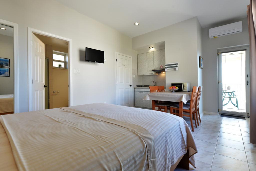 Budova je krásná, stejně jako na obrázku, umístění je vynikající, protože pláž je přímo přes silnici a poblíž je také zátoka s bary podávajícími jídlo a pití. Pro cestu do obchodu nebo města je nezbytné kolo nebo auto. Studio je vhodné pro dvě osoby, čisté a dobře udržované. V kuchyni chyběl sporák a prkénko, v koupelně mop a smeták. Nechyběl ani sušák na plavky a ručníky, dají se zavěsit na zábradlí balkónu. Balkon je společný se sousedním pokojem. Hostitel je přátelský a nenápadný. Doporučuji pronájem ateliéru!
