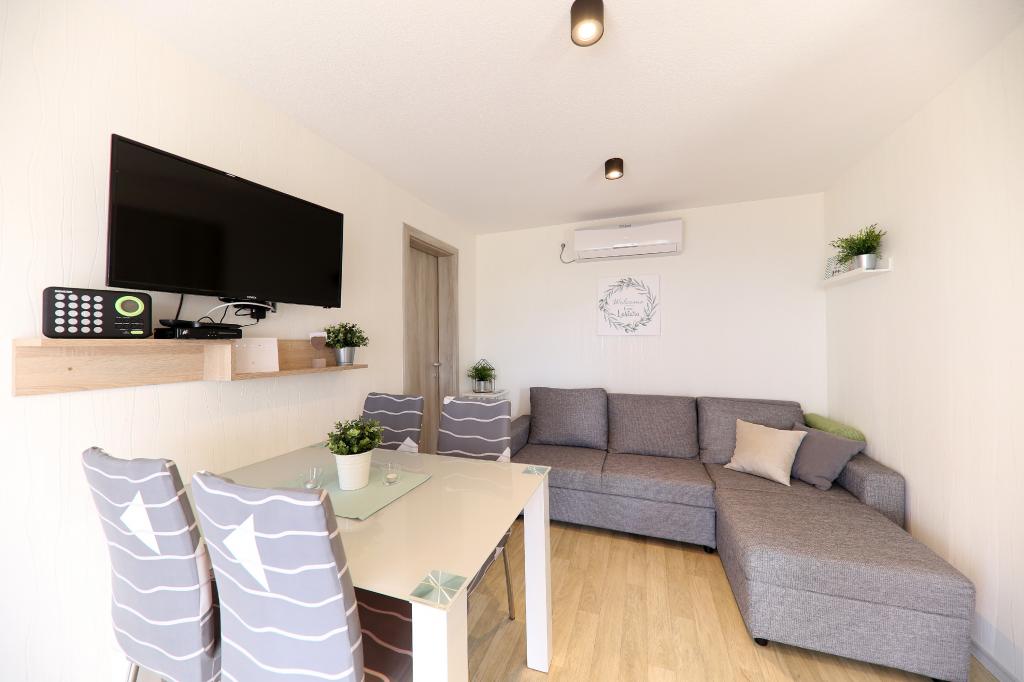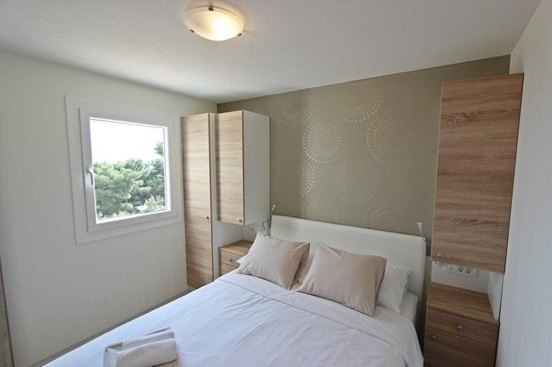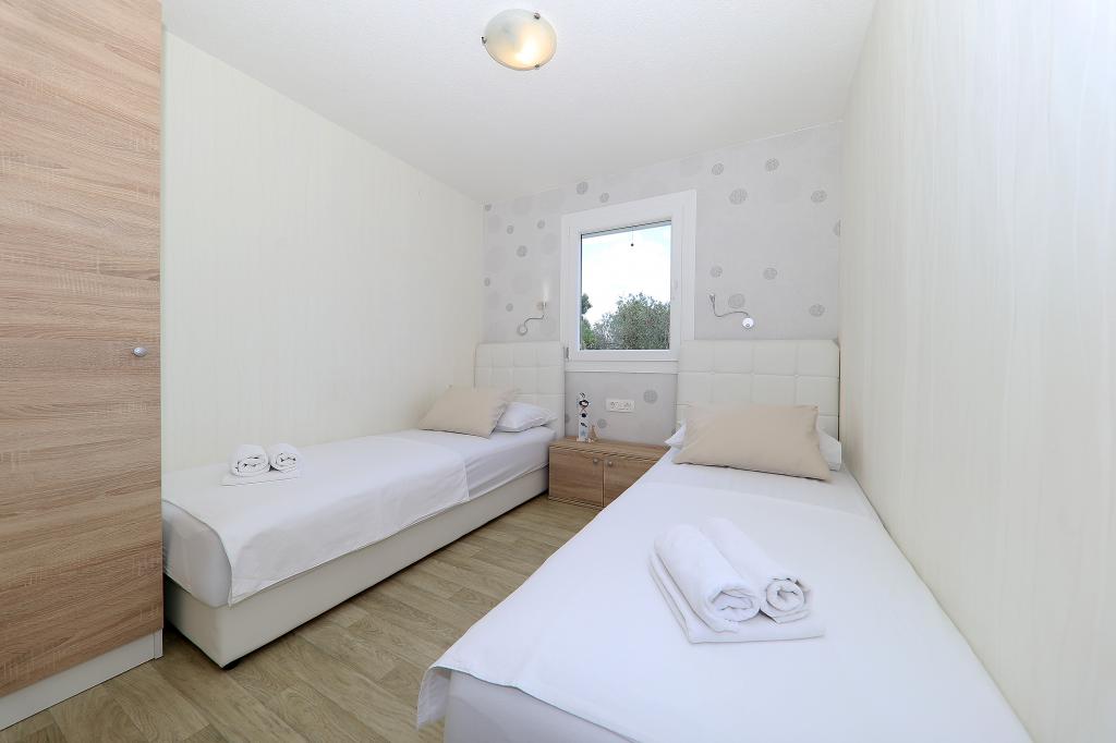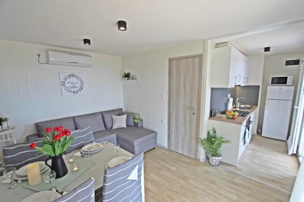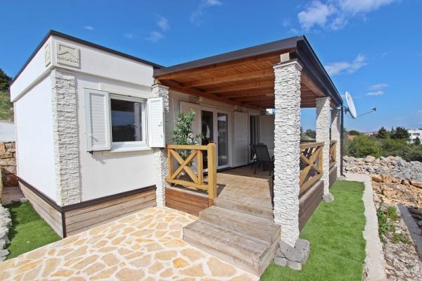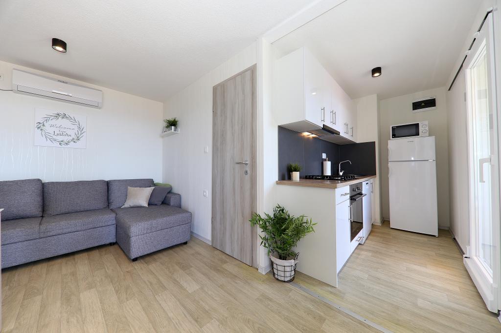 Mobilní domy v kempu Lostura se nacházejí v blízkosti jedné z nejkrásnějších pláží na Jadranu, Slanice! Mobilní dům se nachází jen 30m od moře a 200m od písečné pláže Slanica. Dům má 40m2 20m2 terasu. V domě jsou dvě ložnice, jedna s manželskou postelí (160x200) a místnost se dvěma samostatnými lůžky (80x200). V obývacím pokoji je úhlová souprava, kterou lze využít jako přistýlku pro jednu dospělou osobu nebo dvě malé děti. Kuchyň je plně vybavena všemi potřebnými spotřebiči (lednice s mrazákem, trouba, mikrovlnka, myčka, varná konvice, rychlovarná konvice, kávovar). Koupelna se sprchovým koutem, pračkou, fénem, toaletními potřebami. V obývacím pokoji je TV se satelitním příjmem, internet zdarma, klimatizace a topení. Na terase je jídelní stůl se židlemi a lehátko a nádherný výhled na ostrovy Kornati a pláž Slanica. Parkovací místo se nachází v blízkosti domu