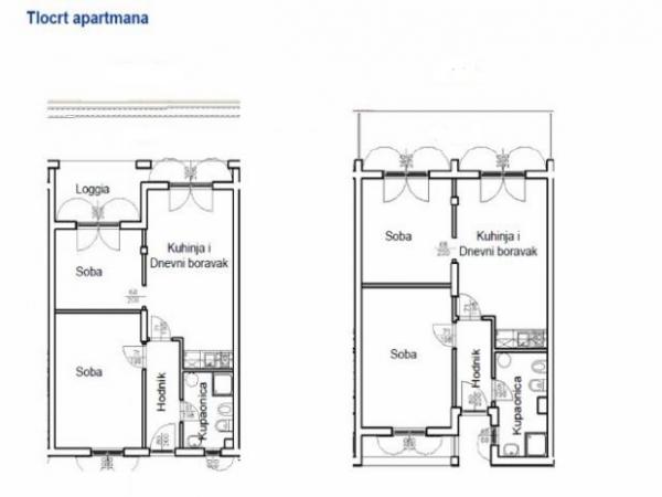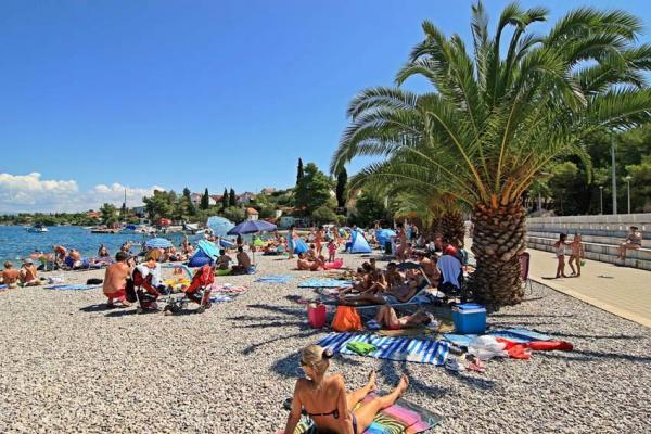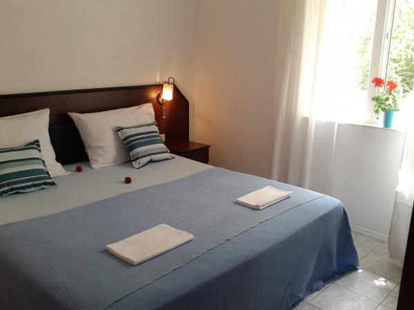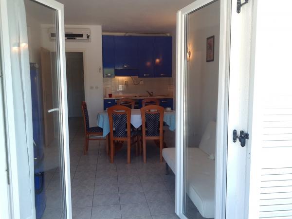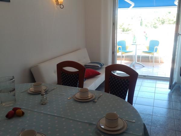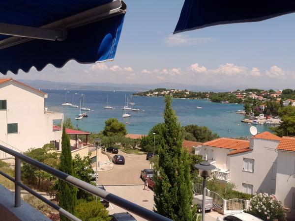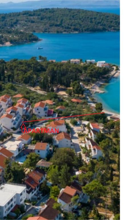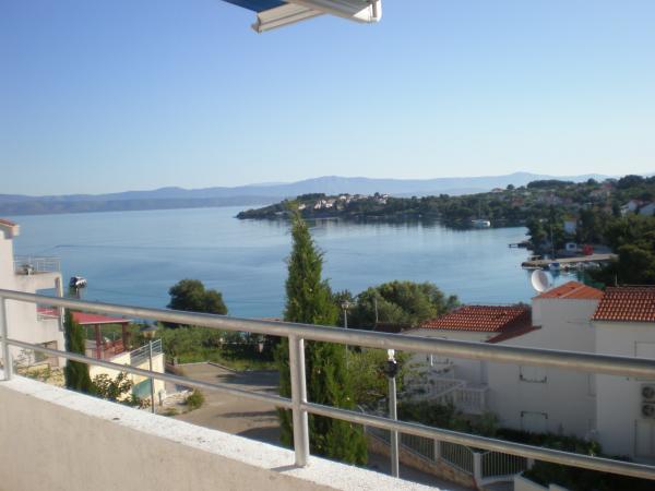 Plně a moderně vybavený apartmán v bezprostřední blízkosti oblázkové pláže. Zařízení se nachází 2 minuty chůze od pláže a centra města. Skládá se ze vstupní chodby, dvou ložnic, koupelny, obývacího pokoje s kuchyní a velkého balkonu. Z balkonu je výhled na pláž, borový les, záliv a v dálce na ostrov Čiovo a město Split. Ve větší ložnici jsou postele pro tři osoby: velká postel pro dvě osoby a postel pro jednu osobu. Menší pokoj je vybaven jedním lůžkem pro dvě osoby, jehož orientace umožňuje hostovi probudit se s výhledem na moře z postele. Kuchyň je vybavena všemi potřebnými domácími spotřebiči: lednice, trouba, sporák, myčka, pračka, varná konvice a další kuchyňské náčiní. Hostům jsou k dispozici elektrické grily a grily na dřevěné uhlí. V obývacím pokoji je velký kuchyňský stůl, sedací souprava a televize. U apartmánu je veřejné parkoviště, které je zdarma, ale rezervace není možná.