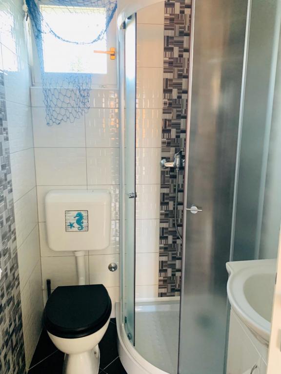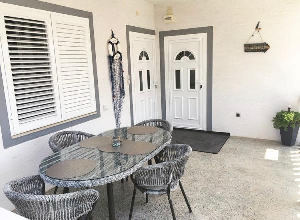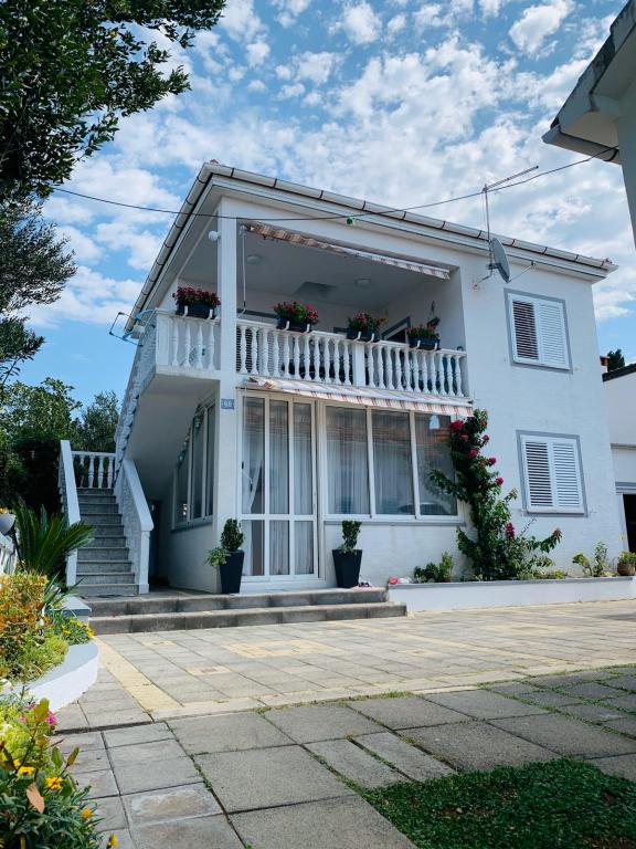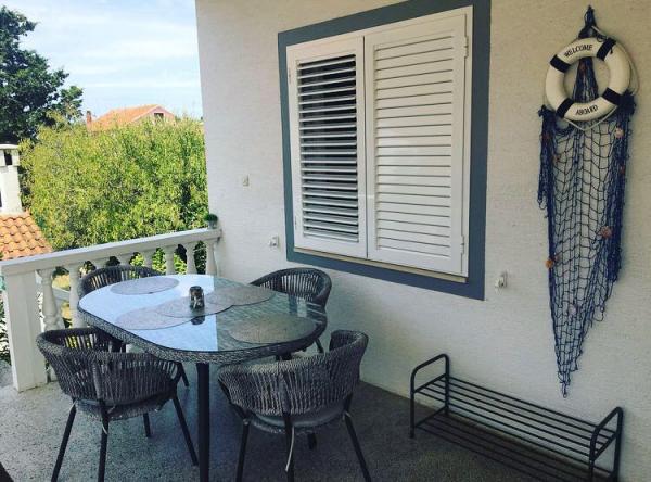 V rodinném domě pronajímáme horní patro (56 m2), které se skládá ze dvou ložnic, kuchyně, koupelny a prostorné zastřešené terasy. Hlídané parkoviště, satelitní TV, Wi-fi, využití grilu, lehátek, slunečníku a venkovní sprchy. Jsme 15 metrů od moře (nádvoří a silnice). Vedle pláže je krásná promenáda, cvičební zařízení, dětské hřiště, hřiště na plážový volejbal,