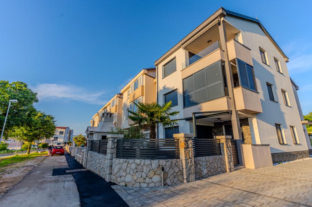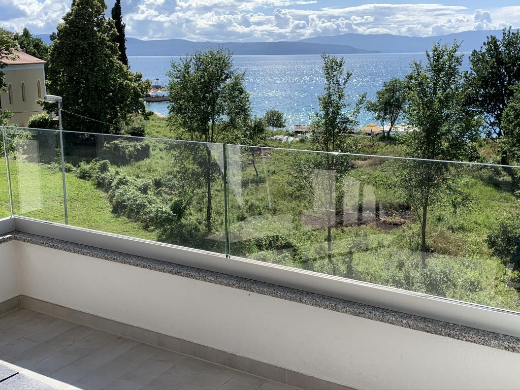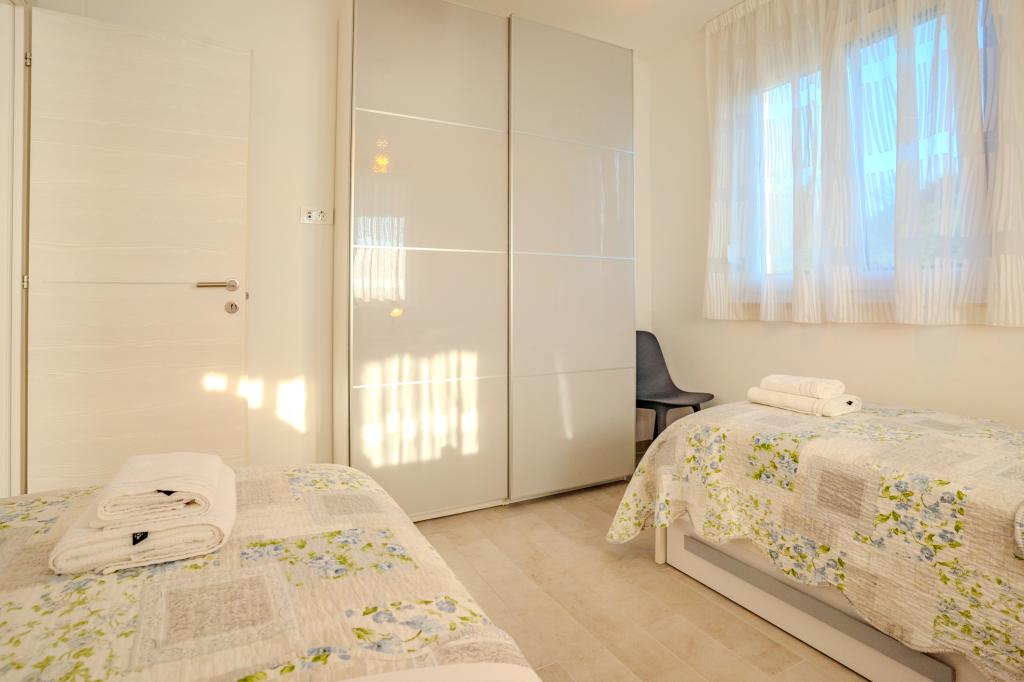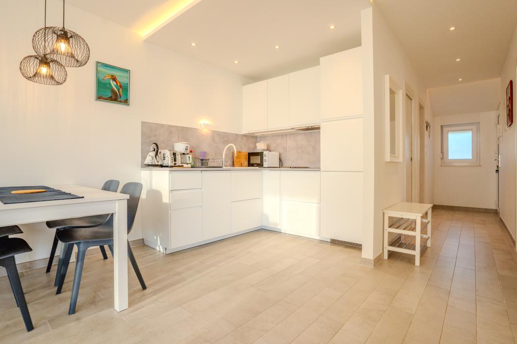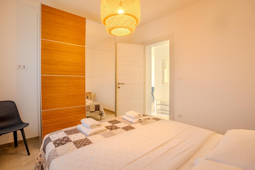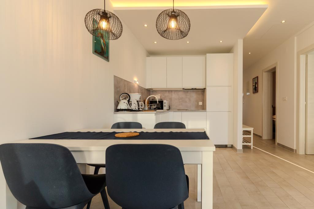 Moderně vybavený apartmán v klidné lokalitě, nacházející se v první řadě u moře. Nemovitost se nachází 2 minuty chůze od pláže, obchodů a centra. Apartmán je nový a vybavený novým nábytkem. Má dvě ložnice, koupelnu, obývací pokoj s kuchyní a jídelnou a krytou terasu. Celková plocha je 68 m2. Parkování pro tři auta se nachází ve dvoře nemovitosti a je zdarma.