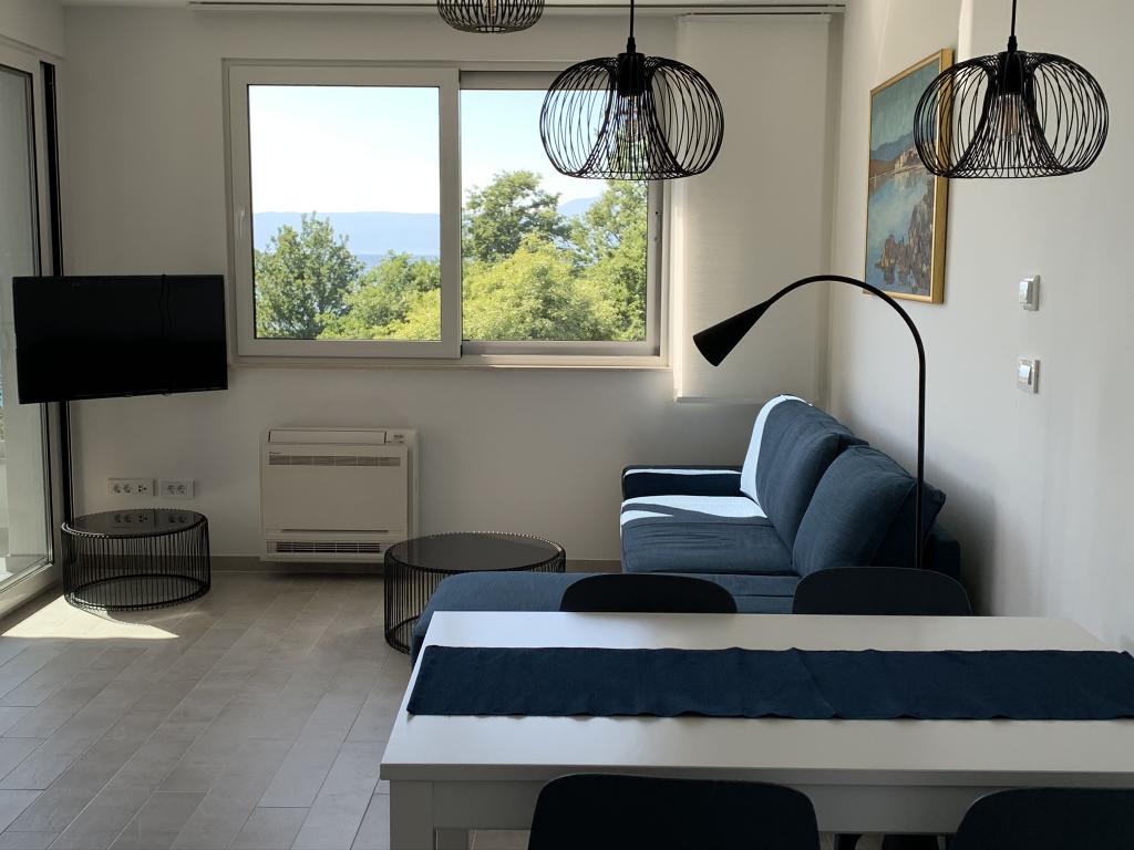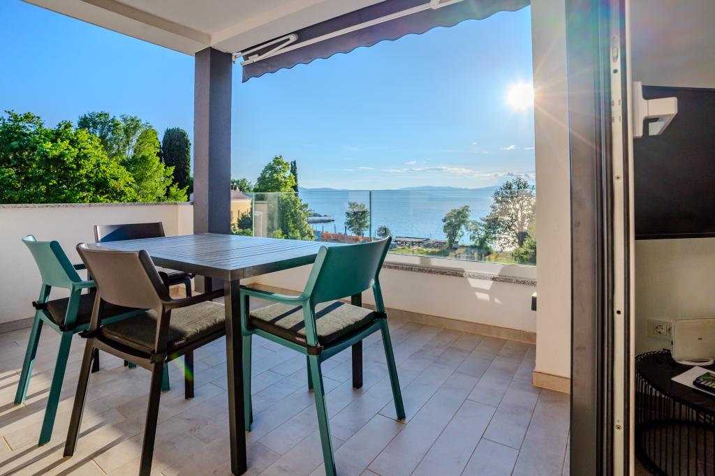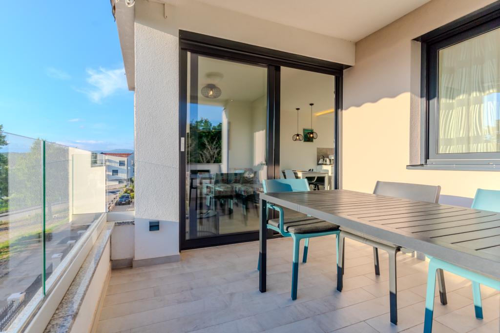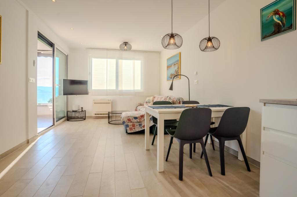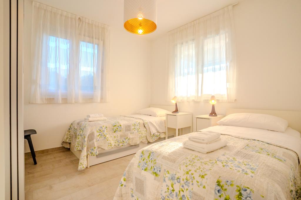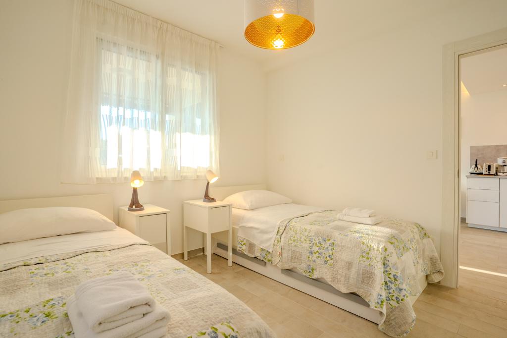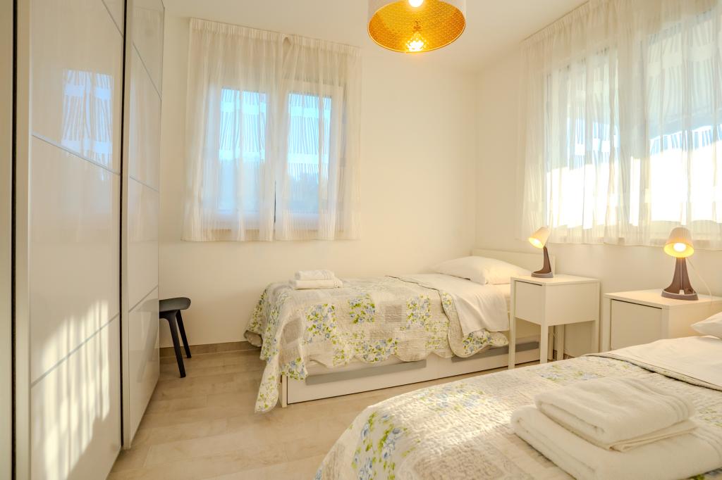 Moderně vybavený apartmán v klidné lokalitě, nacházející se v první řadě u moře. Nemovitost se nachází 2 minuty chůze od pláže, obchodů a centra. Apartmán je nový a vybavený novým nábytkem. Má dvě ložnice, koupelnu, obývací pokoj s kuchyní a jídelnou a krytou terasu. Celková plocha je 68 m2. Parkování pro tři auta se nachází ve dvoře nemovitosti a je zdarma.