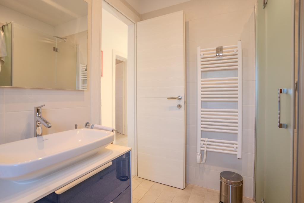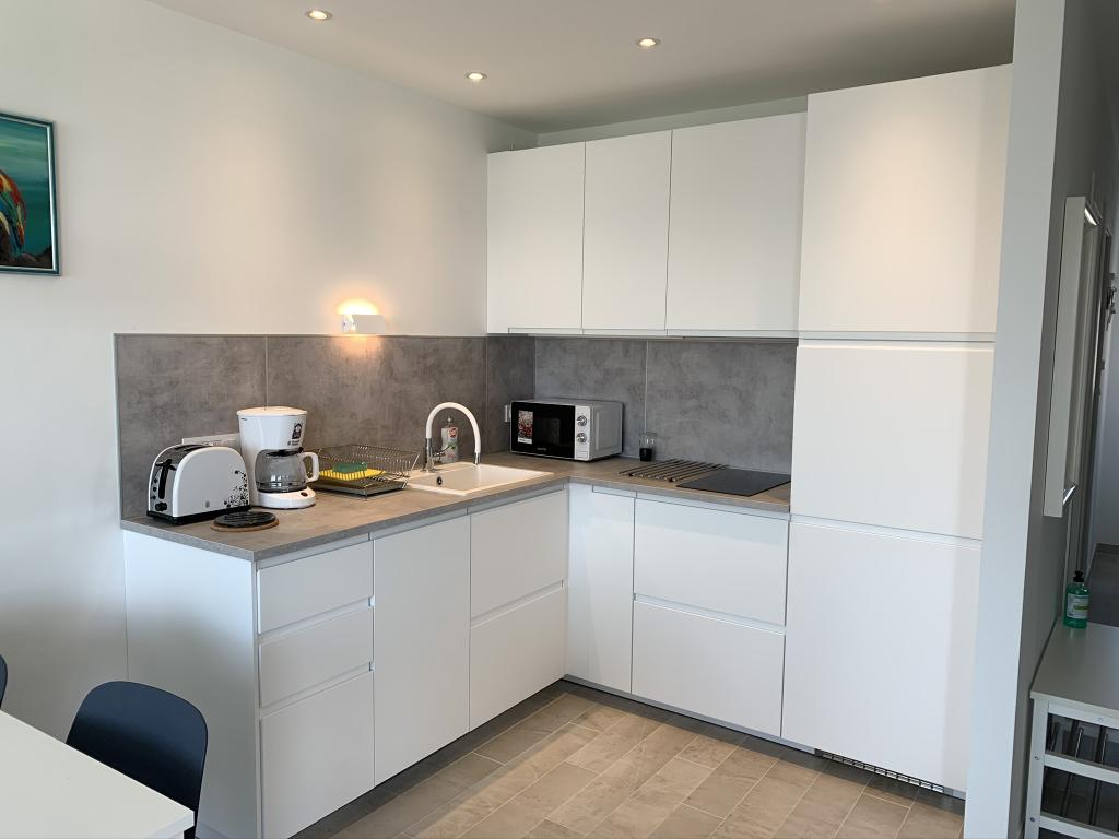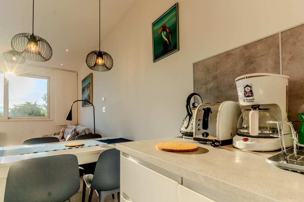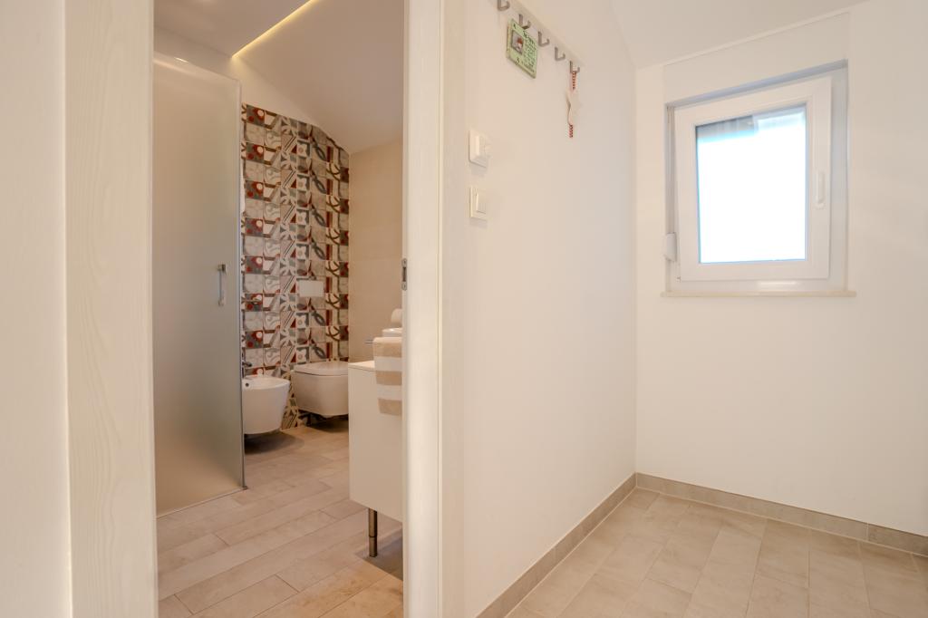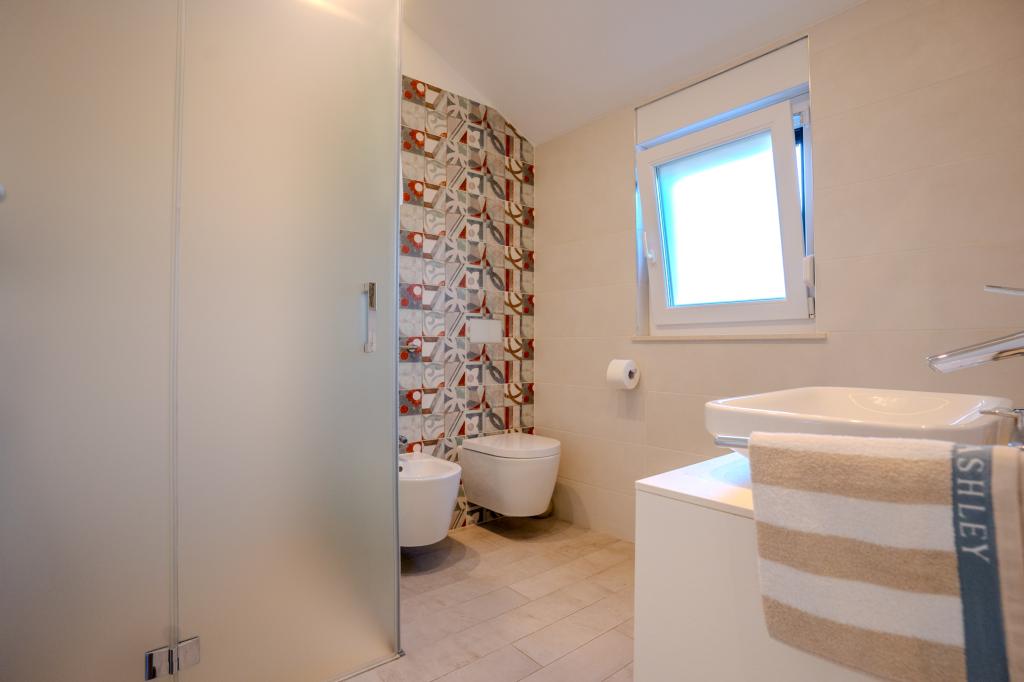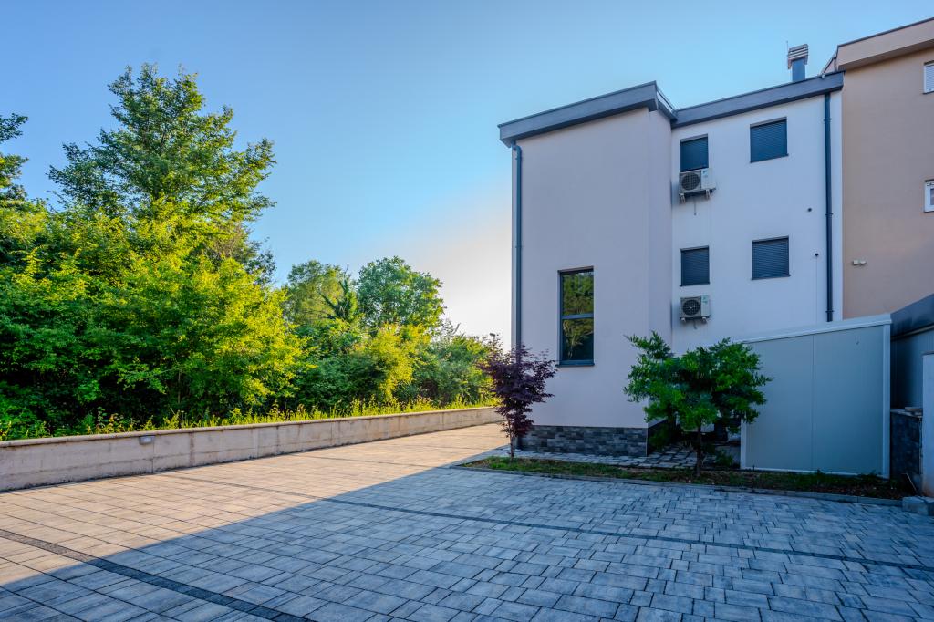 Moderně vybavený apartmán v klidné lokalitě, nacházející se v první řadě u moře. Nemovitost se nachází 2 minuty chůze od pláže, obchodů a centra. Apartmán je nový a vybavený novým nábytkem. Má dvě ložnice, koupelnu, obývací pokoj s kuchyní a jídelnou a krytou terasu. Celková plocha je 68 m2. Parkování pro tři auta se nachází ve dvoře nemovitosti a je zdarma.