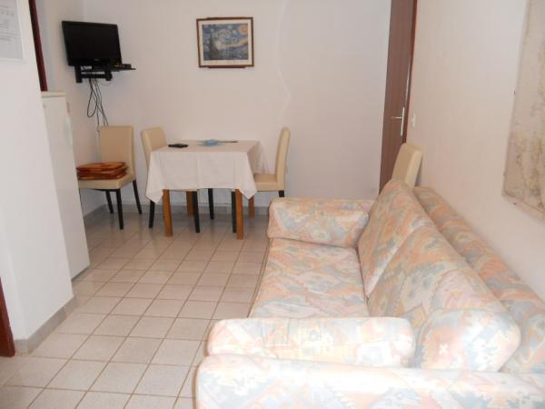 Velmi pěkný starší pár, byty velké, bez poskvrny čisté, velmi dobře vybavené. Lůžka velmi pohodlné. Spousta skříní. Velká lednice s mrazákem. Mikrovlnná trouba. Každý apartmán má zastíněnou terasu, která je velmi cool a pohodlné, si můžete vychutnat jídlo ve stínu. Velmi chladné místo velení, zejména s malými dětmi, kuchyň kompletně vybavená (může hrnce, pánve, příbory, talíře, pánve, krájecí desky-jeden připravovat jídlo sami). Neexistuje žádná klimatizace, což považuji za plus, a to zejména pro naše krku a apartmány je v pohodě, jste měli jen vzpomenout zavírat žaluzie. Výstupy z apartmánů v zahradě, pryč z ulice (důležité pro děti). Kryté parkování. Opravdu doporučuji všem!