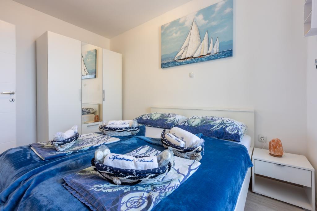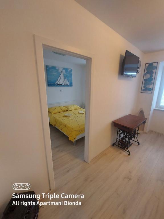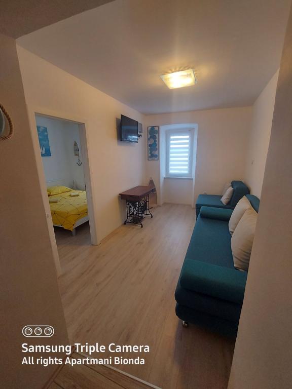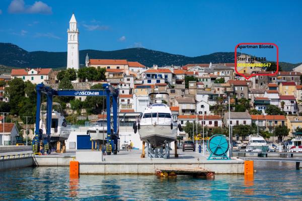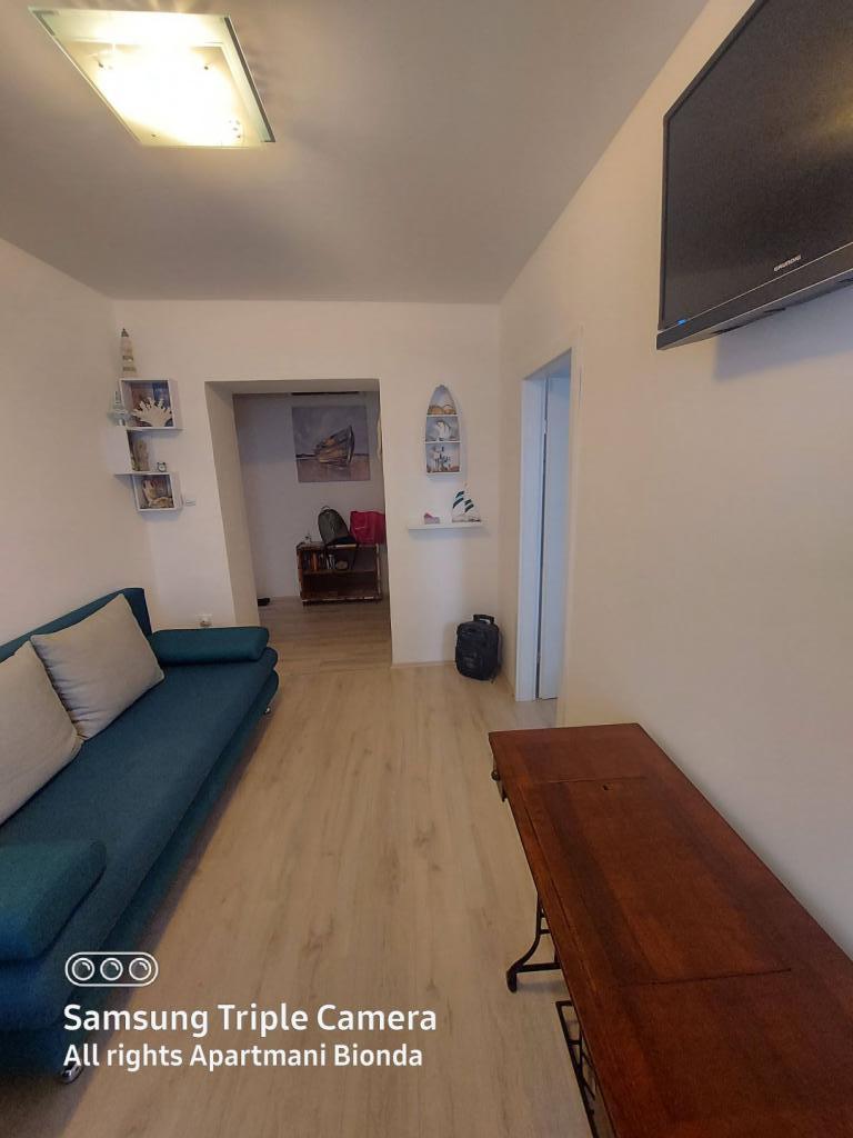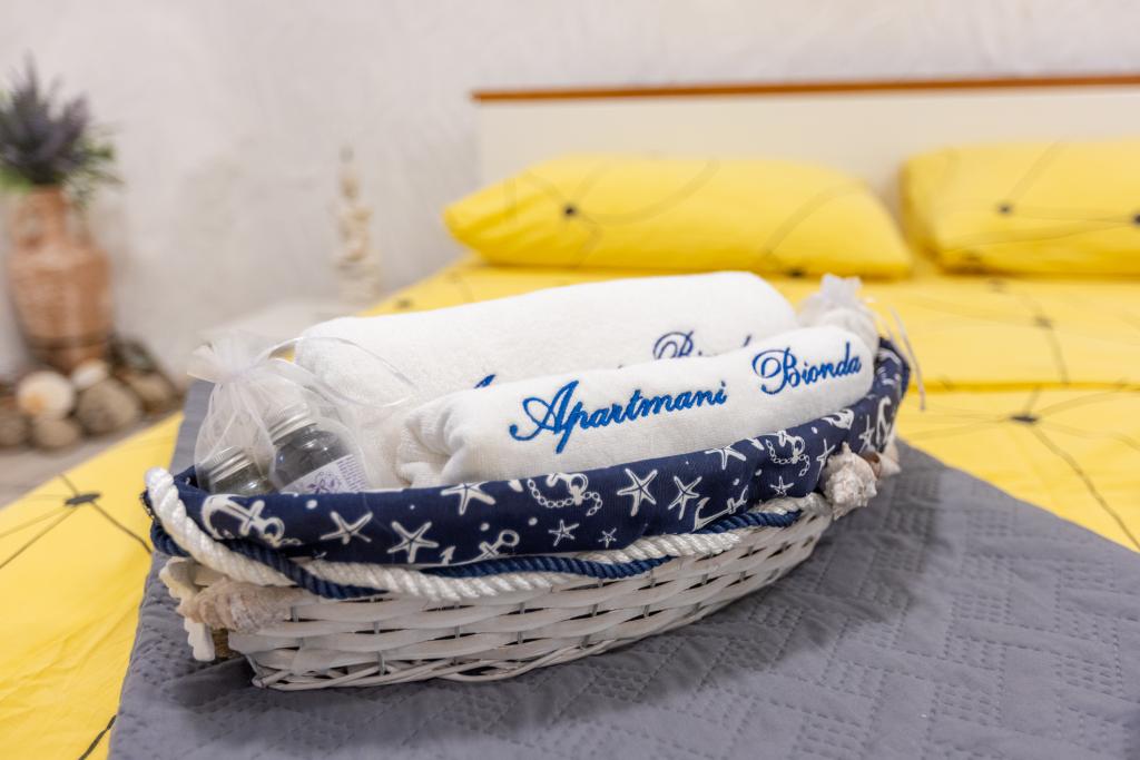 Apartmán Bionda má rozlohu cca 50m2 a skládá se z kuchyně, koupelny, obývacího pokoje a ložnice. Je určen pro max. 4 osoby, v ložnici je umístěna manželská postel, v obývacím pokoji je pohovka, která se rozkládá na postel o rozměru 160x200cm. Byt se nachází v centru města, v jeho starém městě, není rušné. Od moře vás dělí jen 20 schodů a od centrálního náměstí jen asi 50 m. Byt je klimatizovaný a plně vybavený pro každodenní potřeby. (LED TV v obývacím pokoji a v ložnici, kuchyň vybavená troubou, varnou deskou, lednicí s mrazákem, deštník k dispozici, ložní prádlo se mění jednou týdně) Během pobytu u nás máte k dispozici parkovací lístek na veřejném parkovišti parkoviště.