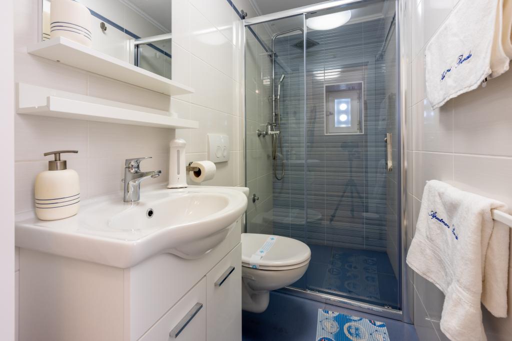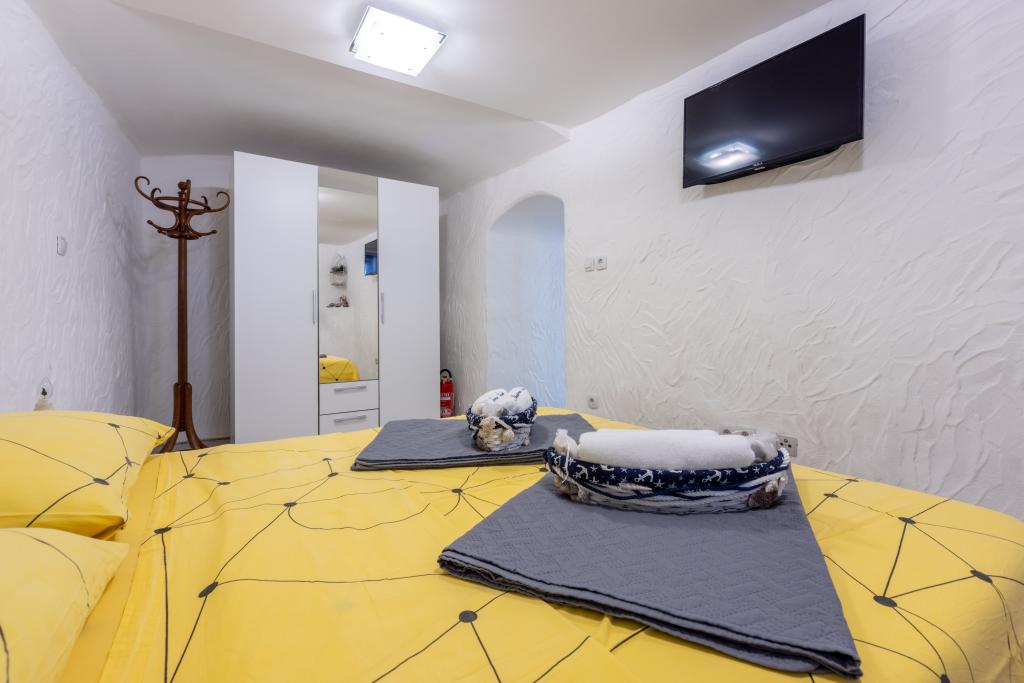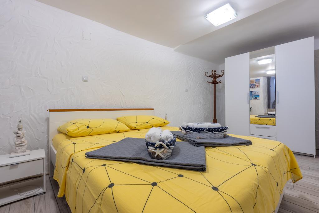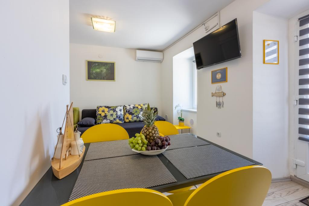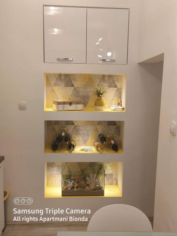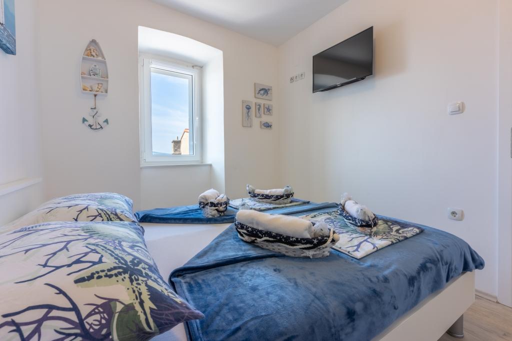 Apartmán Bionda má rozlohu cca 50m2 a skládá se z kuchyně, koupelny, obývacího pokoje a ložnice. Je určen pro max. 4 osoby, v ložnici je umístěna manželská postel, v obývacím pokoji je pohovka, která se rozkládá na postel o rozměru 160x200cm. Byt se nachází v centru města, v jeho starém městě, není rušné. Od moře vás dělí jen 20 schodů a od centrálního náměstí jen asi 50 m. Byt je klimatizovaný a plně vybavený pro každodenní potřeby. (LED TV v obývacím pokoji a v ložnici, kuchyň vybavená troubou, varnou deskou, lednicí s mrazákem, deštník k dispozici, ložní prádlo se mění jednou týdně) Během pobytu u nás máte k dispozici parkovací lístek na veřejném parkovišti parkoviště.