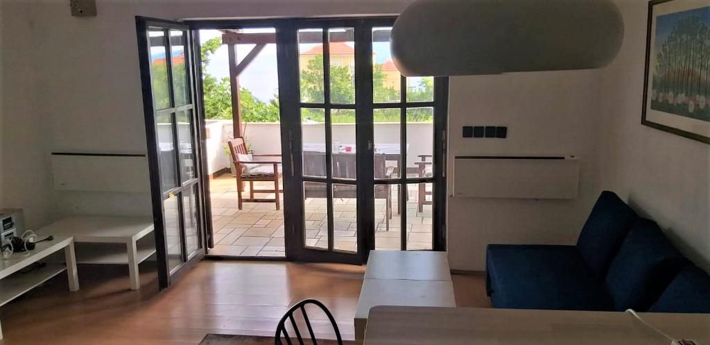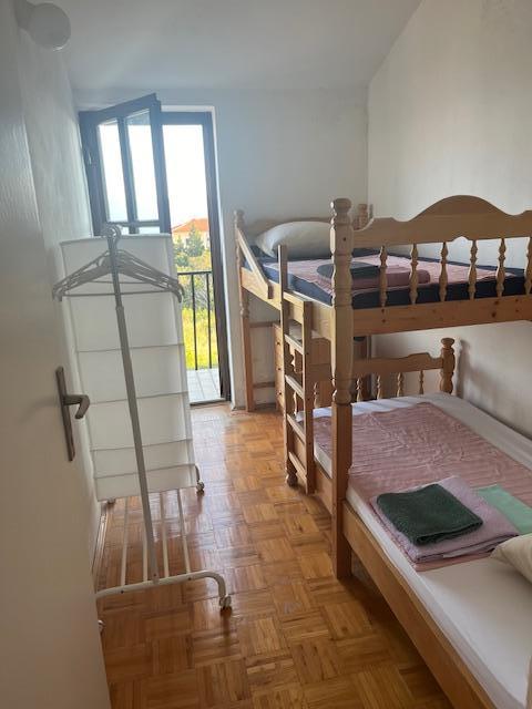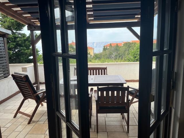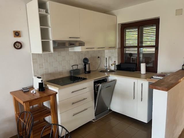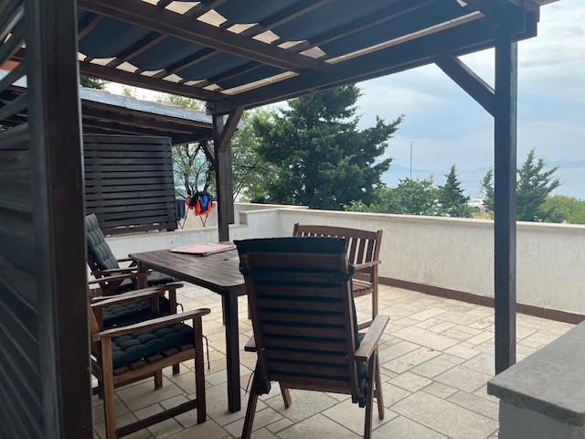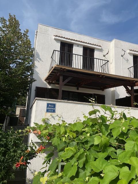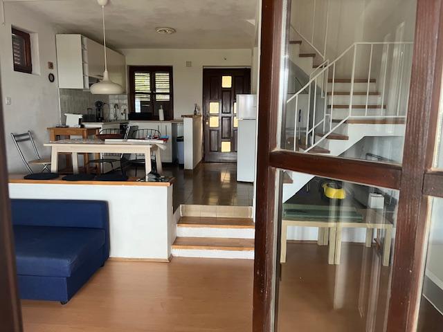 Dvoupatrový byt 70m2 + velká terasa 20m2 s výhledem na moře. Ve spodním patře je obývací pokoj se vstupem na terasu, kuchyně a WC. V horním patře je koupelna s WC a sprchovým koutem, tři ložnice (dvě s výhledem na moře a balkon). Samostatný vchod, soukromí. 3 minuty dolů po schodech na pláž.
