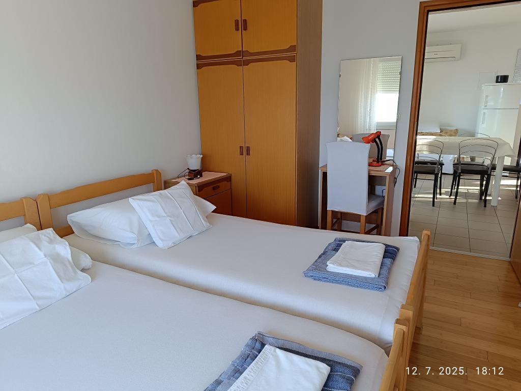 Byli jsme na dovolené s přáteli a měli jsme dva apartmány (A4 a A4), jeden pro nás a jeden pro naše přátele. Byly hned vedle sebe a sdílely malou chodbu, ze které se vcházelo do obou apartmánů. Naprosto praktické! Apartmán byl krásně zařízený, s úžasným výhledem a mořem velmi blízko. A hostitelé byli neuvěřitelně vřelí a ochotní. Cítili jsme se opravdu jako doma! Můžu to naprosto doporučit – určitě se vrátíme! S pozdravem, Anna