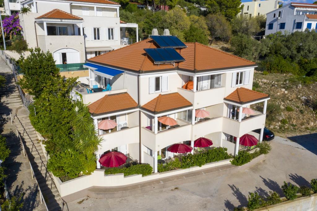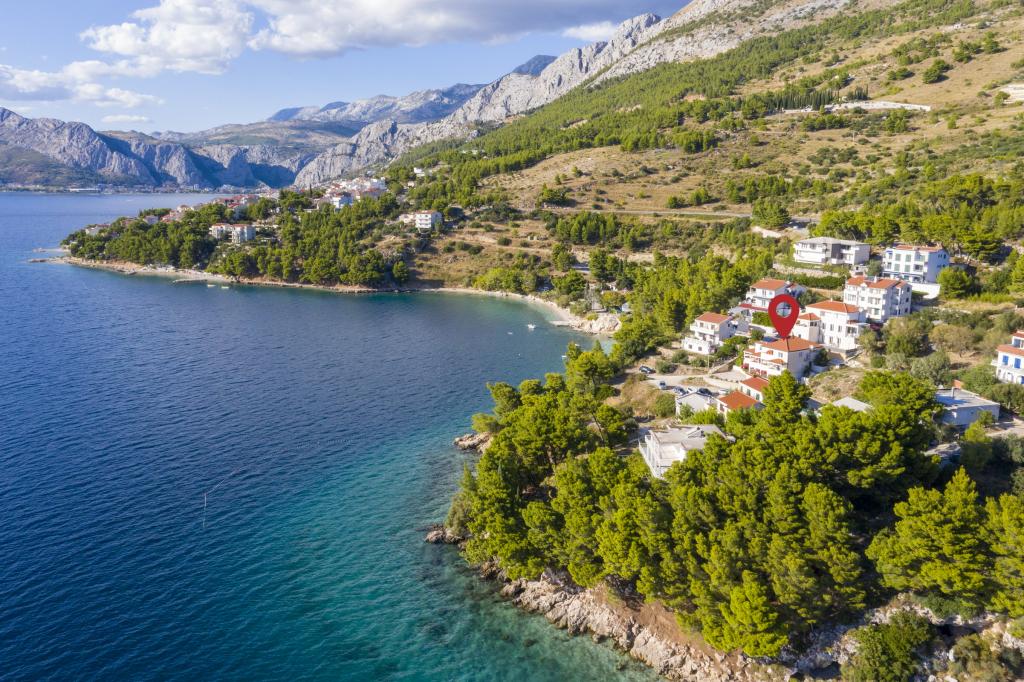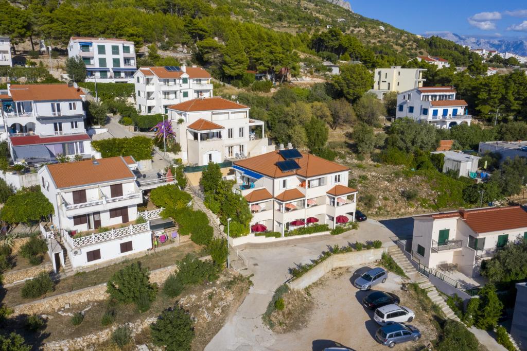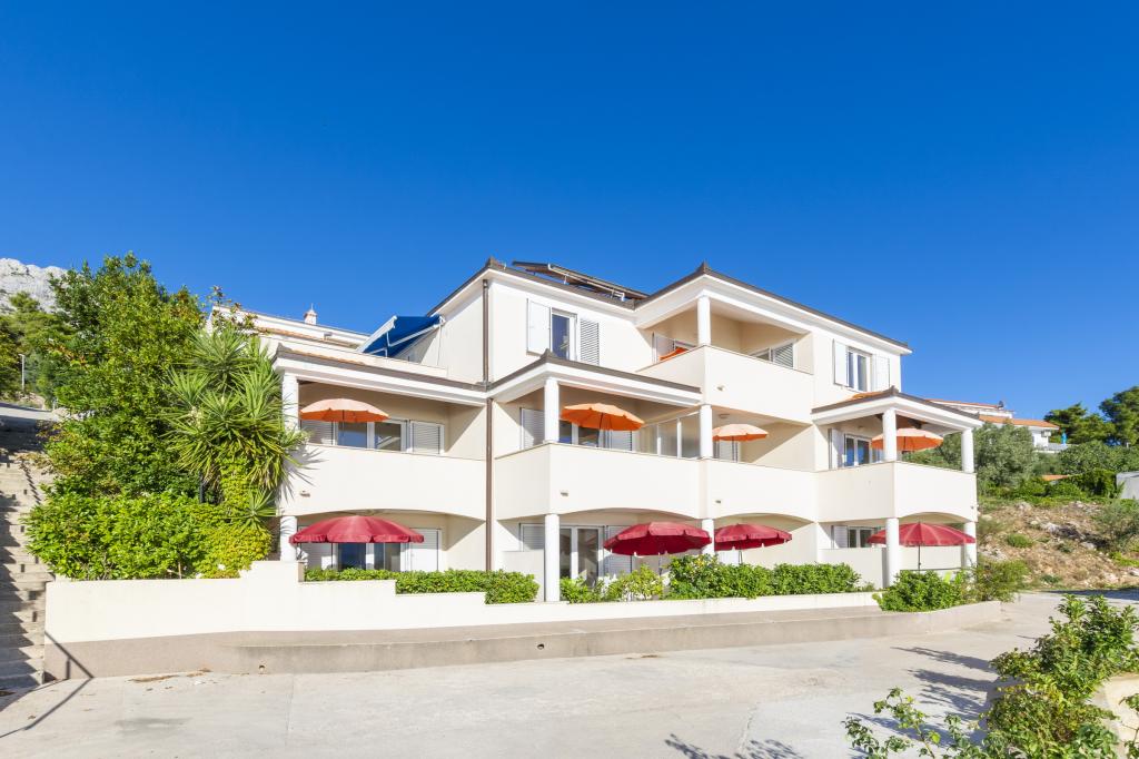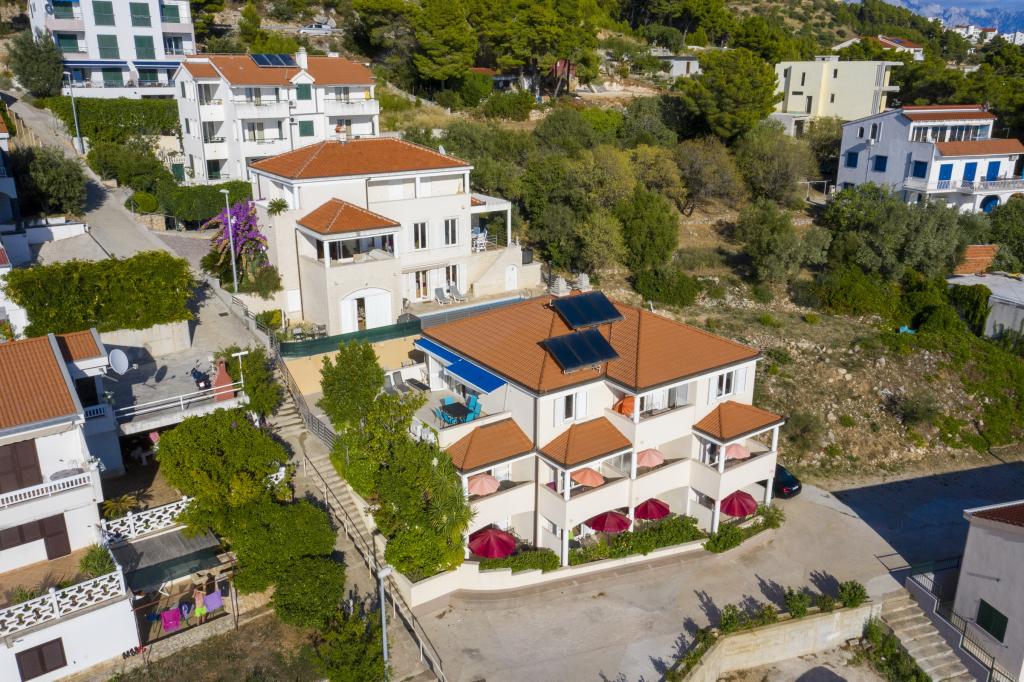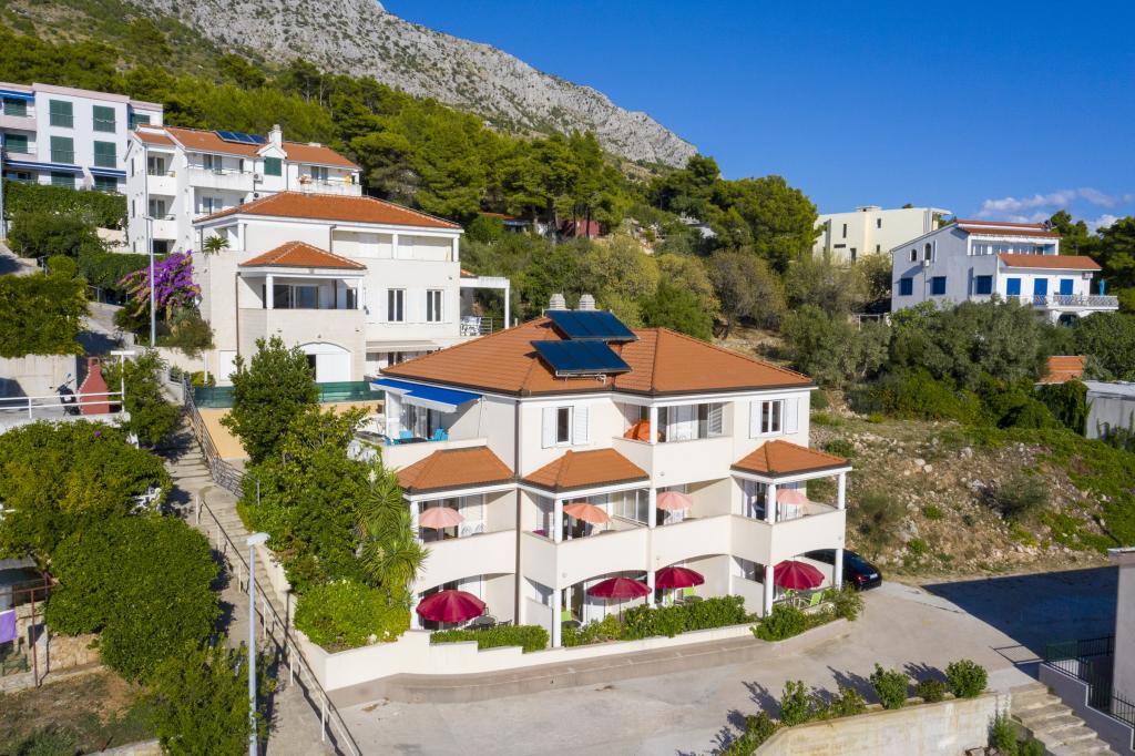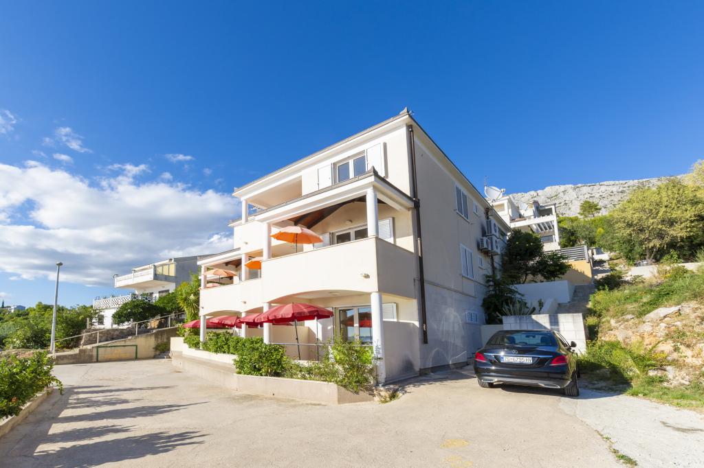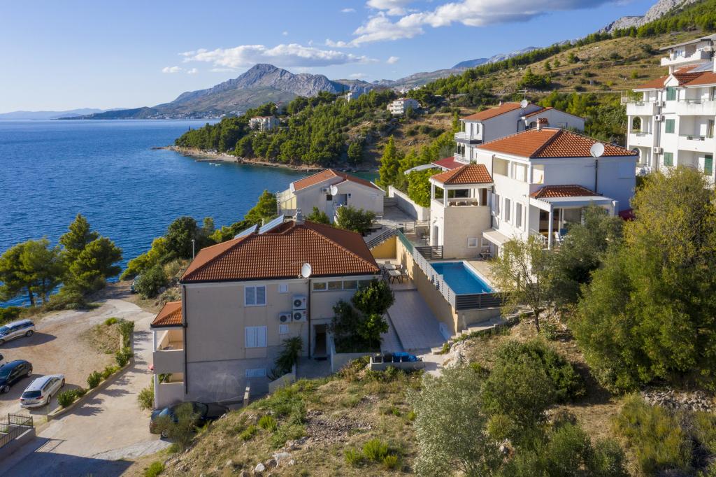Ubytování v nově postavených, mimořádně pohodlných a skvěle vybavených apartmánech. Objekt se nachází 3 km od centra Omiše. Celkem osm apartmánů, které se nacházejí v první řadě u moře. Všechny apartmány mají velké terasy s výhledem na moře a ostrov Brač. Parkovací místa přímo u vily. Apartmány se nacházejí pod hlavní silnicí (300 metrů), přímo u moře a velké oblázkové pláže. K dispozici jsou čtyři typy apartmánů: -- typ 2+2 se samostatnou dvoulůžkovou ložnicí a obývacím pokojem se dvěma lůžky, -- dále apartmány typu 2+2 velké studio, -- velké lux. apartmány typu 4+2 se dvěma dvoulůžkovými ložnicemi a velkým obývacím pokojem se dvěma rozkládacími lůžky a -- velký de lux. apartmán typu 14+2, ve skutečnosti vila na třech podlažích o rozloze 300 m2, s bazénem o rozměrech 9x4 metry s vyhřívanou vodou, se sedmi dvoulůžkovými ložnicemi, dvěma velkými obývacími pokoji s balkony a terasami, čtyřmi koupelnami, samostatnou toaletou, venkovním grilem, saunou a posilovnou atd. Bazén je výhradně využíván apartmánem A 14+2. Ostatní byty ne.