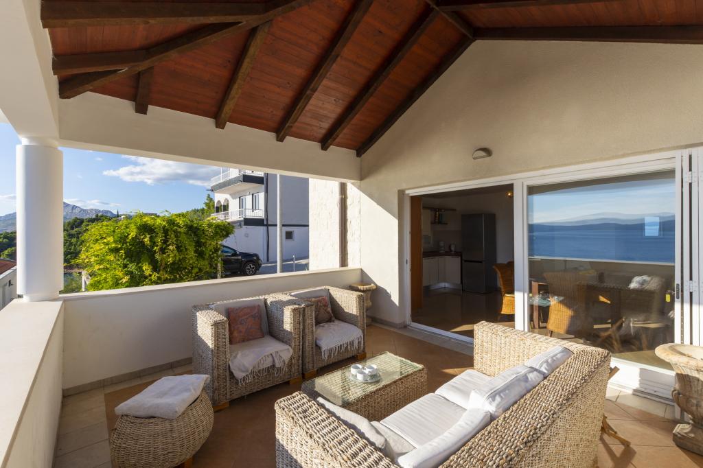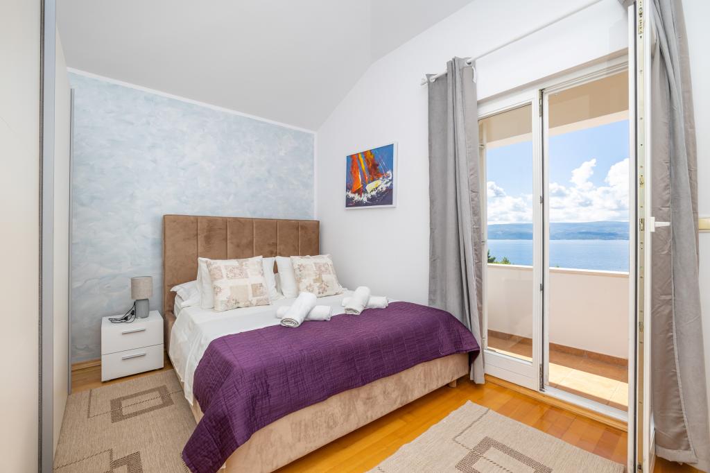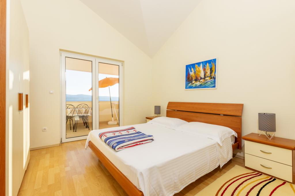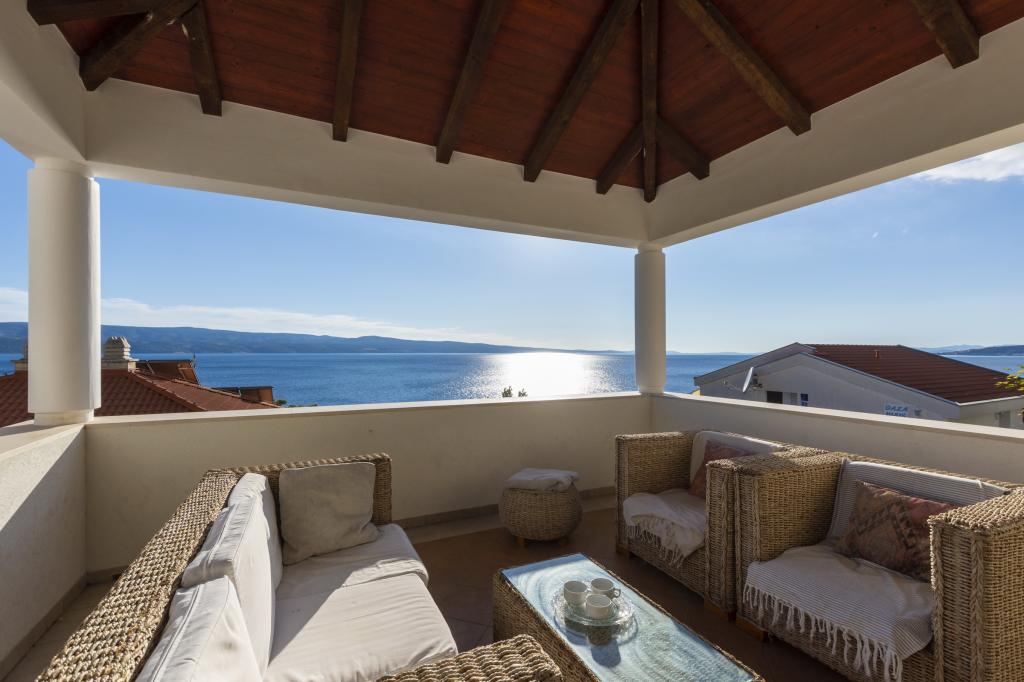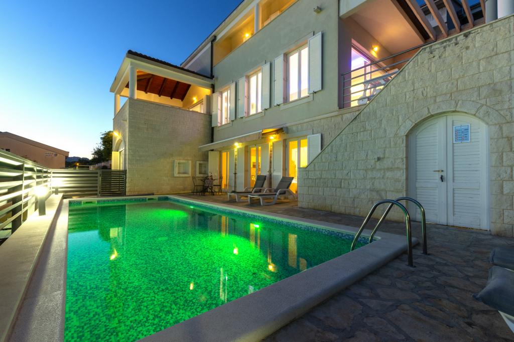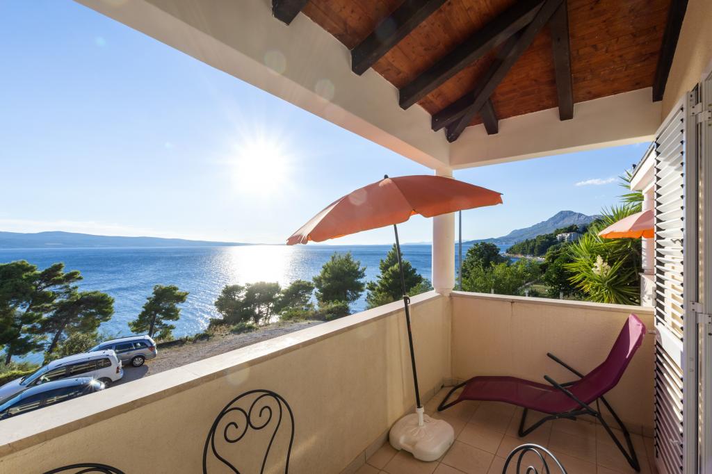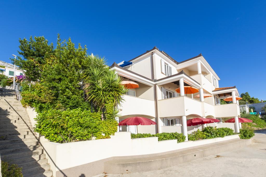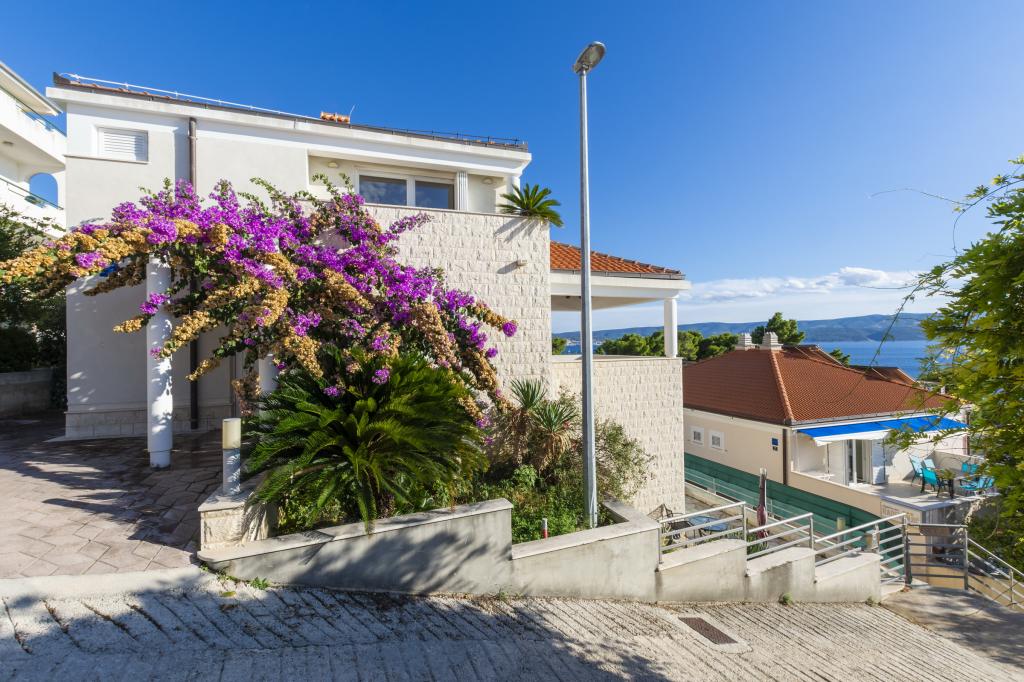 Ubytování v nově postavených, mimořádně pohodlných a skvěle vybavených apartmánech. Objekt se nachází 3 km od centra Omiše. Celkem osm apartmánů, které se nacházejí v první řadě u moře. Všechny apartmány mají velké terasy s výhledem na moře a ostrov Brač. Parkovací místa přímo u vily. Apartmány se nacházejí pod hlavní silnicí (300 metrů), přímo u moře a velké oblázkové pláže. K dispozici jsou čtyři typy apartmánů: -- typ 2+2 se samostatnou dvoulůžkovou ložnicí a obývacím pokojem se dvěma lůžky, -- dále apartmány typu 2+2 velké studio, -- velké lux. apartmány typu 4+2 se dvěma dvoulůžkovými ložnicemi a velkým obývacím pokojem se dvěma rozkládacími lůžky a -- velký de lux. apartmán typu 14+2, ve skutečnosti vila na třech podlažích o rozloze 300 m2, s bazénem o rozměrech 9x4 metry s vyhřívanou vodou, se sedmi dvoulůžkovými ložnicemi, dvěma velkými obývacími pokoji s balkony a terasami, čtyřmi koupelnami, samostatnou toaletou, venkovním grilem, saunou a posilovnou atd. Bazén je výhradně využíván apartmánem A 14+2. Ostatní byty ne.