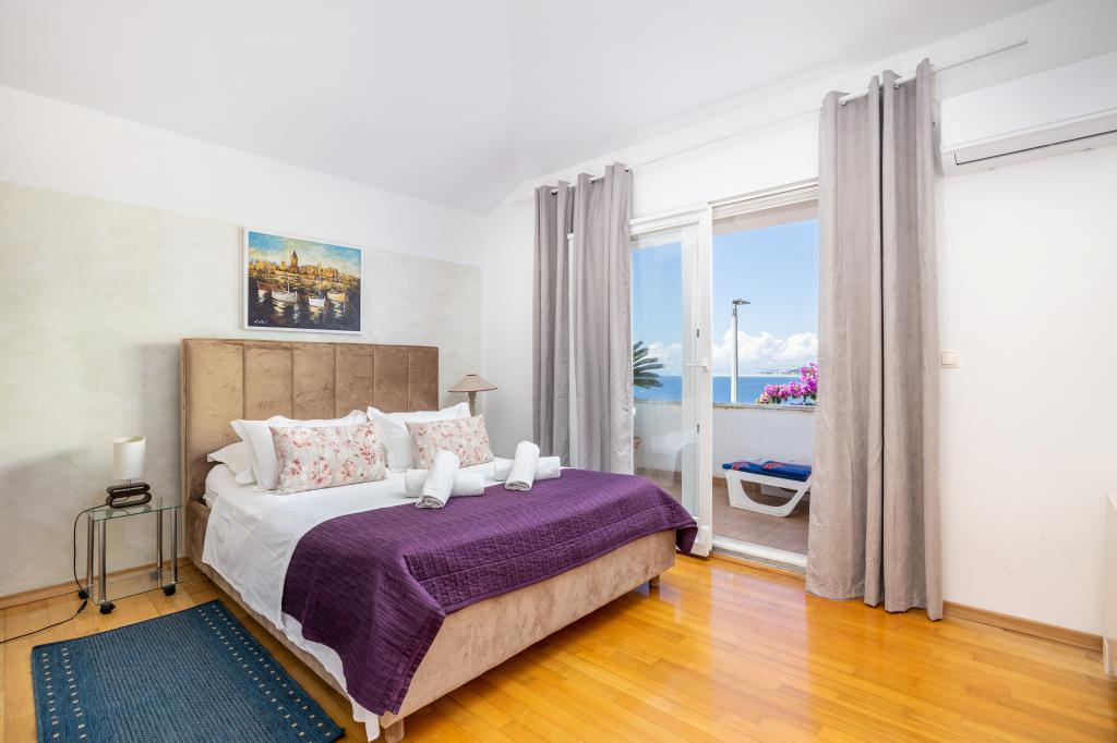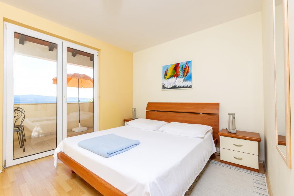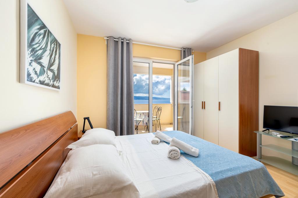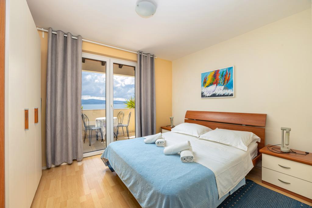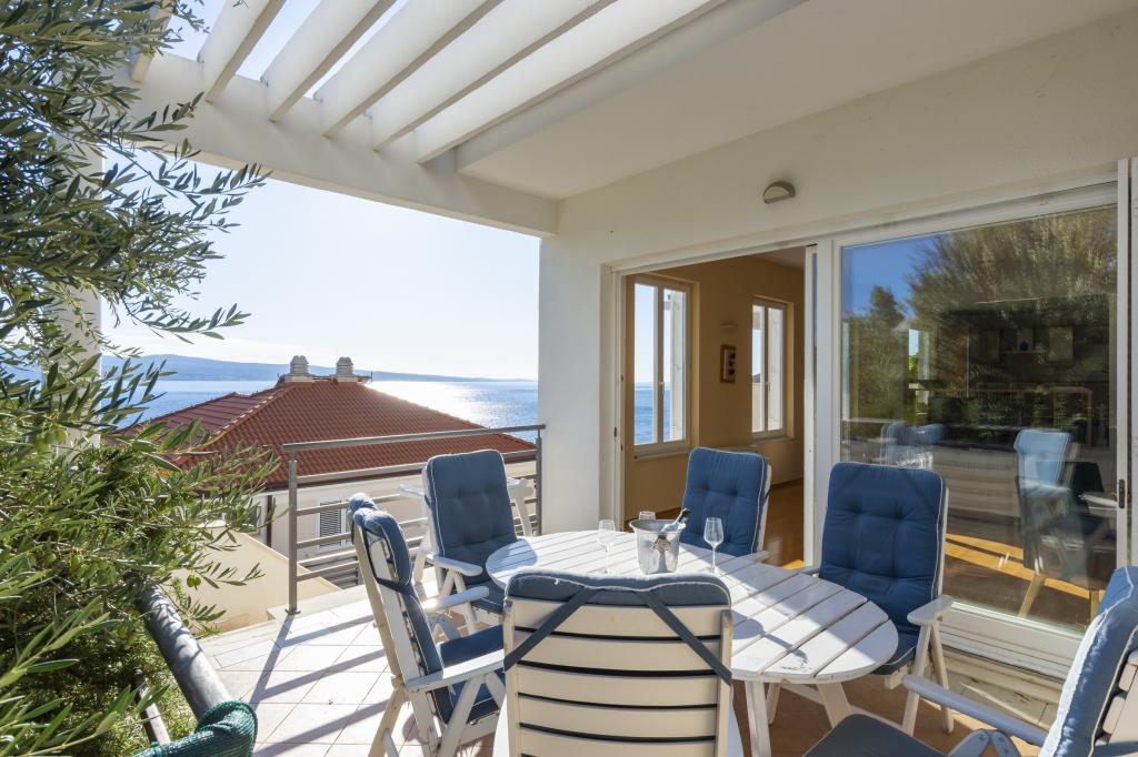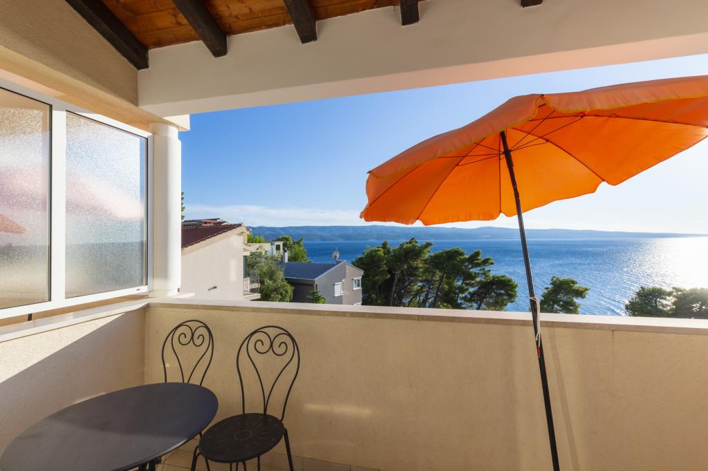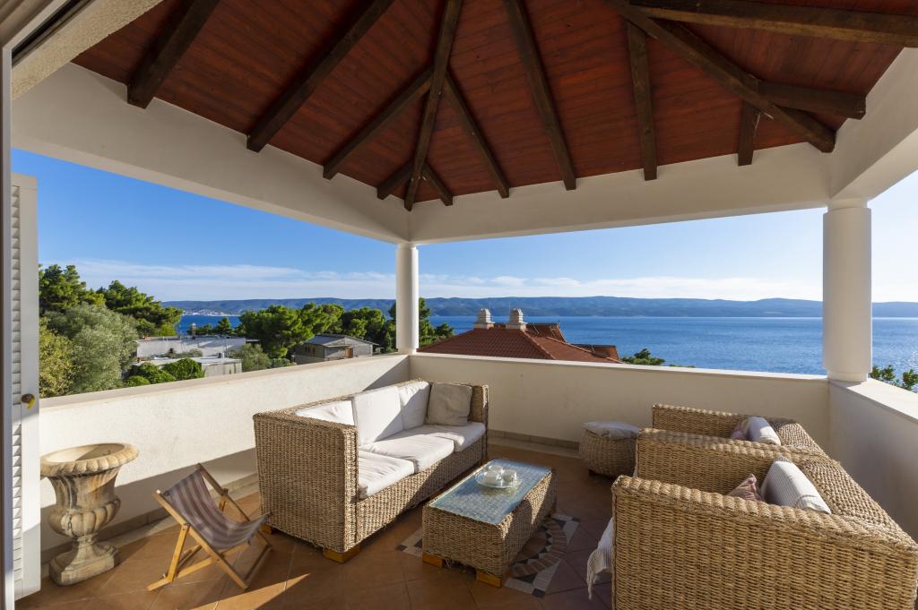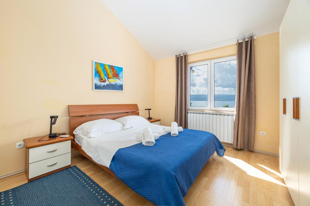 Ubytování v nově postavených, mimořádně pohodlných a skvěle vybavených apartmánech. Objekt se nachází 3 km od centra Omiše. Celkem osm apartmánů, které se nacházejí v první řadě u moře. Všechny apartmány mají velké terasy s výhledem na moře a ostrov Brač. Parkovací místa přímo u vily. Apartmány se nacházejí pod hlavní silnicí (300 metrů), přímo u moře a velké oblázkové pláže. K dispozici jsou čtyři typy apartmánů: -- typ 2+2 se samostatnou dvoulůžkovou ložnicí a obývacím pokojem se dvěma lůžky, -- dále apartmány typu 2+2 velké studio, -- velké lux. apartmány typu 4+2 se dvěma dvoulůžkovými ložnicemi a velkým obývacím pokojem se dvěma rozkládacími lůžky a -- velký de lux. apartmán typu 14+2, ve skutečnosti vila na třech podlažích o rozloze 300 m2, s bazénem o rozměrech 9x4 metry s vyhřívanou vodou, se sedmi dvoulůžkovými ložnicemi, dvěma velkými obývacími pokoji s balkony a terasami, čtyřmi koupelnami, samostatnou toaletou, venkovním grilem, saunou a posilovnou atd. Bazén je výhradně využíván apartmánem A 14+2. Ostatní byty ne.