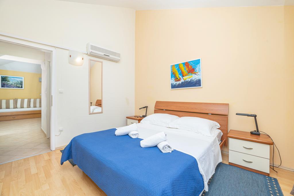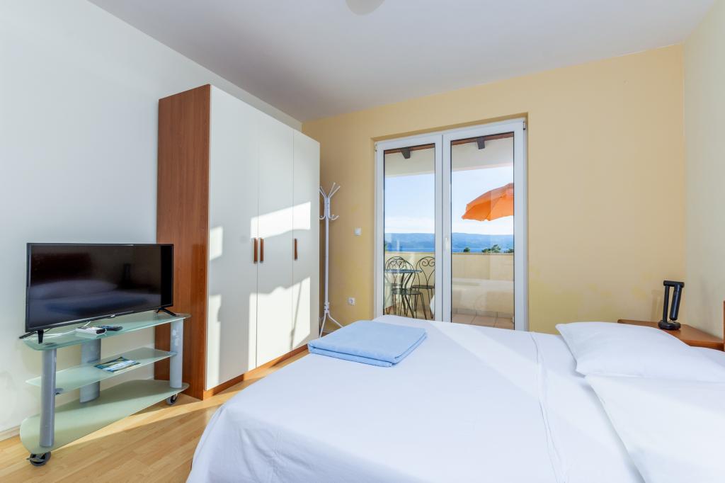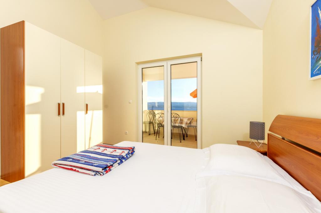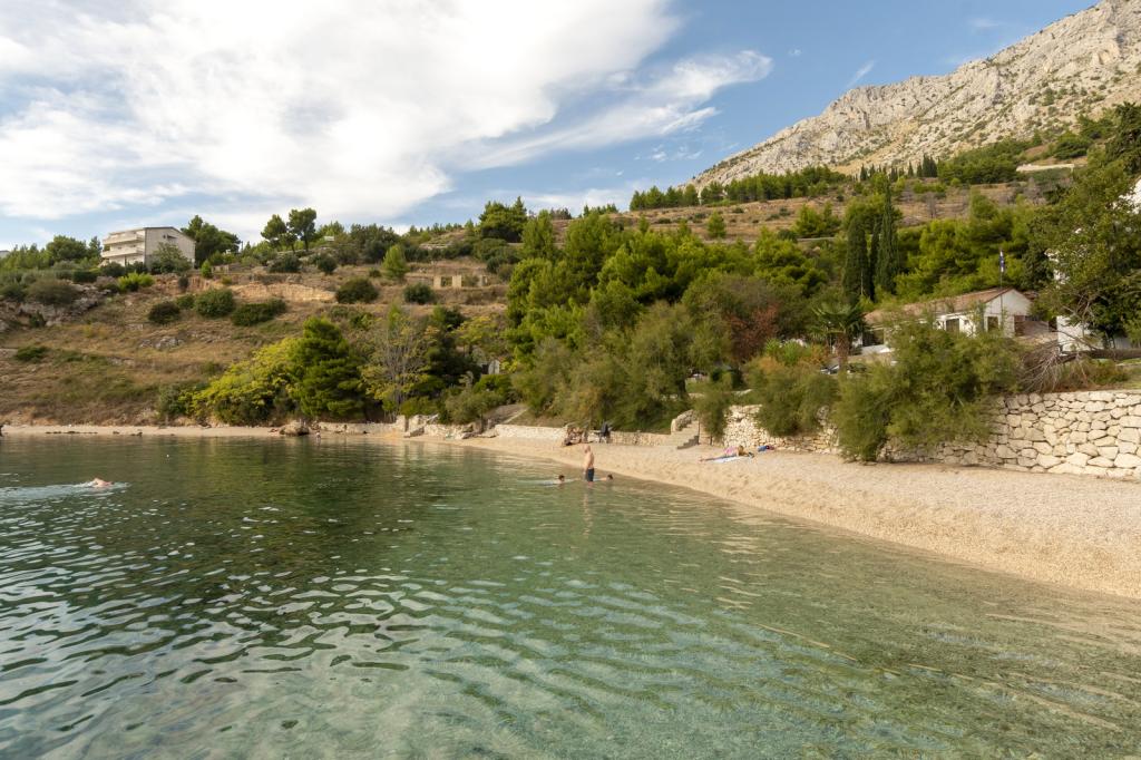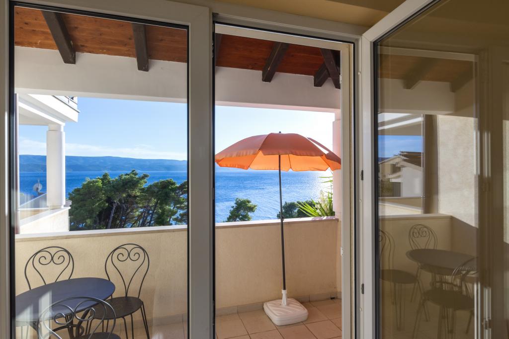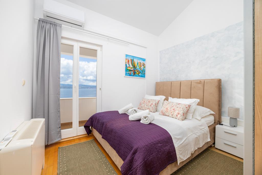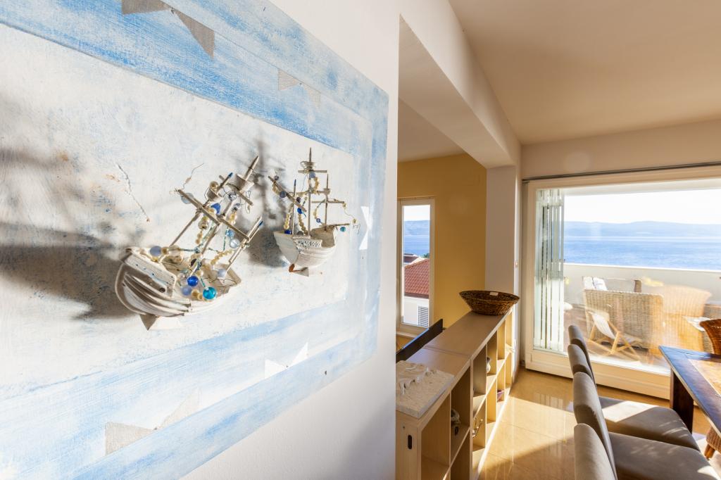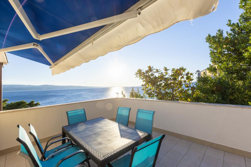 Ubytování v nově postavených, mimořádně pohodlných a skvěle vybavených apartmánech. Objekt se nachází 3 km od centra Omiše. Celkem osm apartmánů, které se nacházejí v první řadě u moře. Všechny apartmány mají velké terasy s výhledem na moře a ostrov Brač. Parkovací místa přímo u vily. Apartmány se nacházejí pod hlavní silnicí (300 metrů), přímo u moře a velké oblázkové pláže. K dispozici jsou čtyři typy apartmánů: -- typ 2+2 se samostatnou dvoulůžkovou ložnicí a obývacím pokojem se dvěma lůžky, -- dále apartmány typu 2+2 velké studio, -- velké lux. apartmány typu 4+2 se dvěma dvoulůžkovými ložnicemi a velkým obývacím pokojem se dvěma rozkládacími lůžky a -- velký de lux. apartmán typu 14+2, ve skutečnosti vila na třech podlažích o rozloze 300 m2, s bazénem o rozměrech 9x4 metry s vyhřívanou vodou, se sedmi dvoulůžkovými ložnicemi, dvěma velkými obývacími pokoji s balkony a terasami, čtyřmi koupelnami, samostatnou toaletou, venkovním grilem, saunou a posilovnou atd. Bazén je výhradně využíván apartmánem A 14+2. Ostatní byty ne.