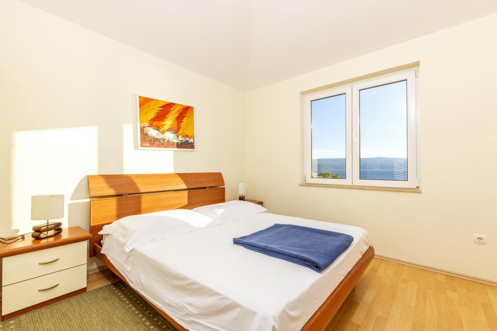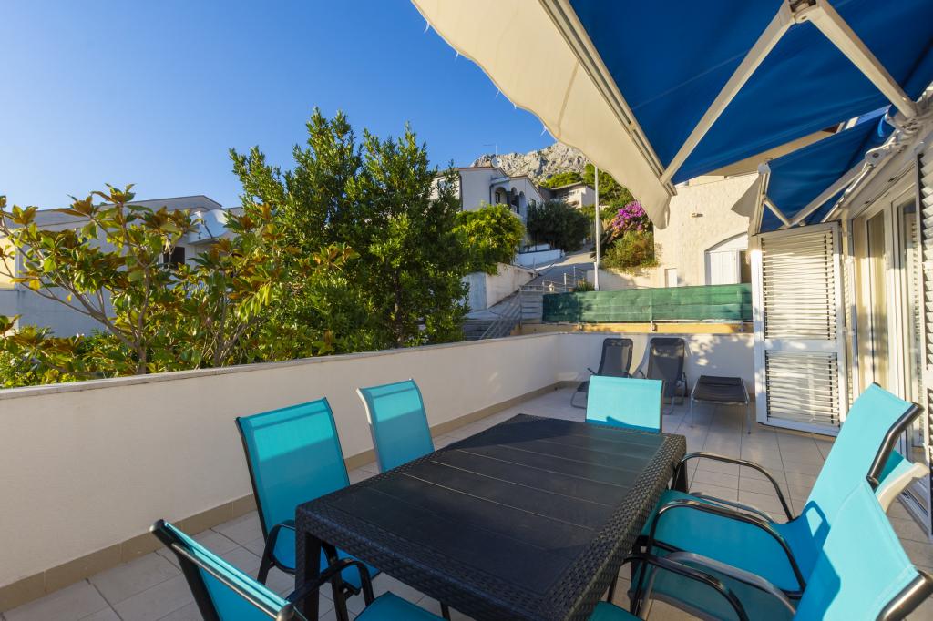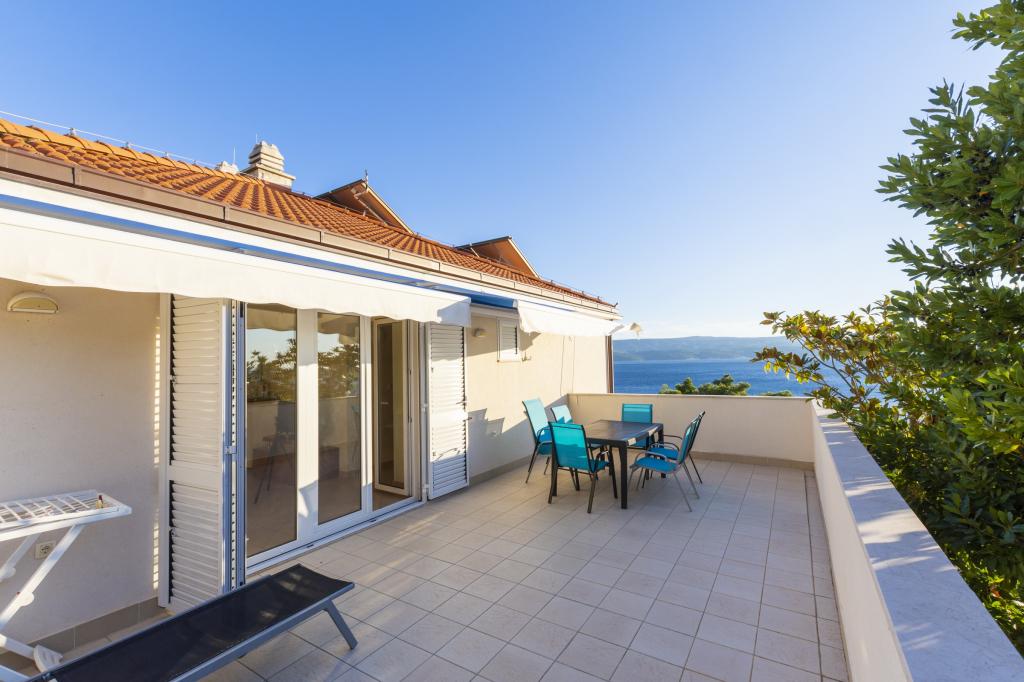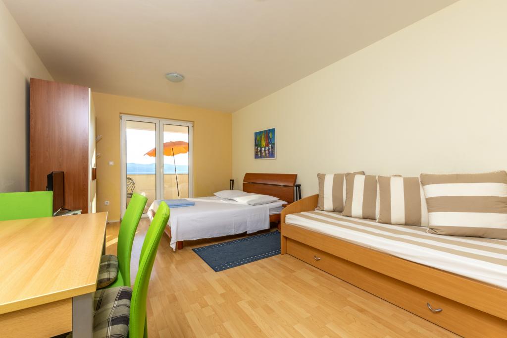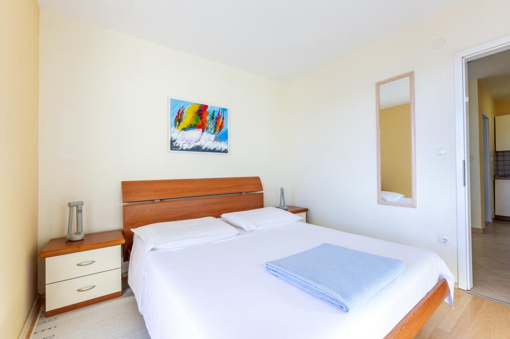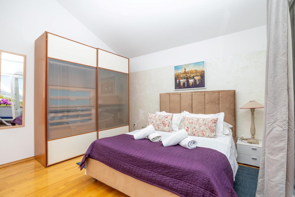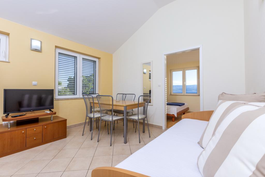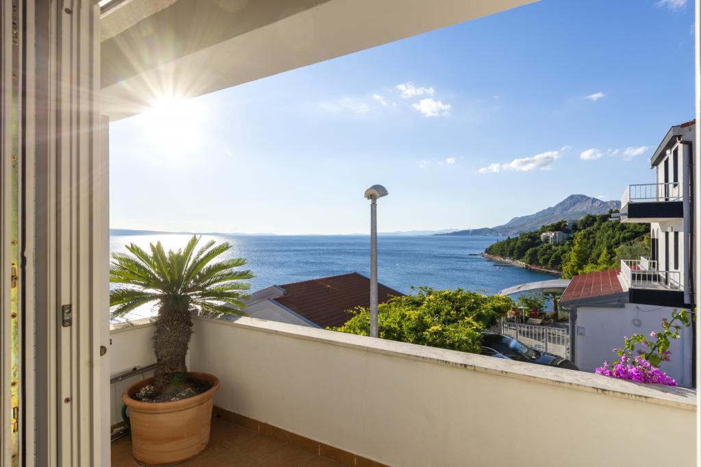 Ubytování v nově postavených, mimořádně pohodlných a skvěle vybavených apartmánech. Objekt se nachází 3 km od centra Omiše. Celkem osm apartmánů, které se nacházejí v první řadě u moře. Všechny apartmány mají velké terasy s výhledem na moře a ostrov Brač. Parkovací místa přímo u vily. Apartmány se nacházejí pod hlavní silnicí (300 metrů), přímo u moře a velké oblázkové pláže. K dispozici jsou čtyři typy apartmánů: -- typ 2+2 se samostatnou dvoulůžkovou ložnicí a obývacím pokojem se dvěma lůžky, -- dále apartmány typu 2+2 velké studio, -- velké lux. apartmány typu 4+2 se dvěma dvoulůžkovými ložnicemi a velkým obývacím pokojem se dvěma rozkládacími lůžky a -- velký de lux. apartmán typu 14+2, ve skutečnosti vila na třech podlažích o rozloze 300 m2, s bazénem o rozměrech 9x4 metry s vyhřívanou vodou, se sedmi dvoulůžkovými ložnicemi, dvěma velkými obývacími pokoji s balkony a terasami, čtyřmi koupelnami, samostatnou toaletou, venkovním grilem, saunou a posilovnou atd. Bazén je výhradně využíván apartmánem A 14+2. Ostatní byty ne.