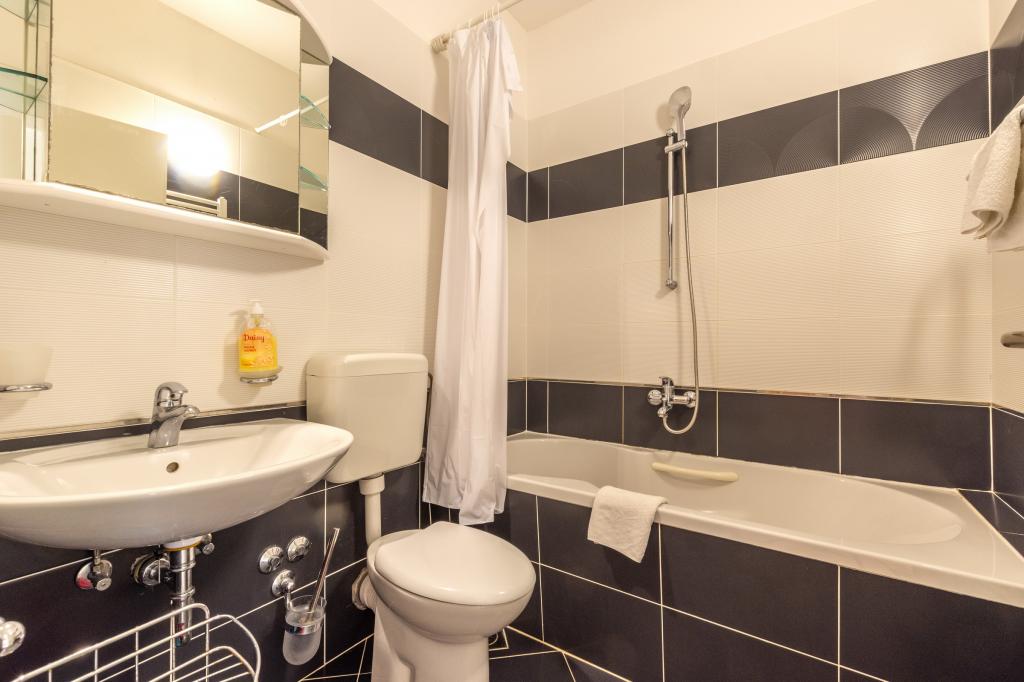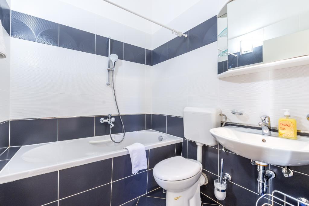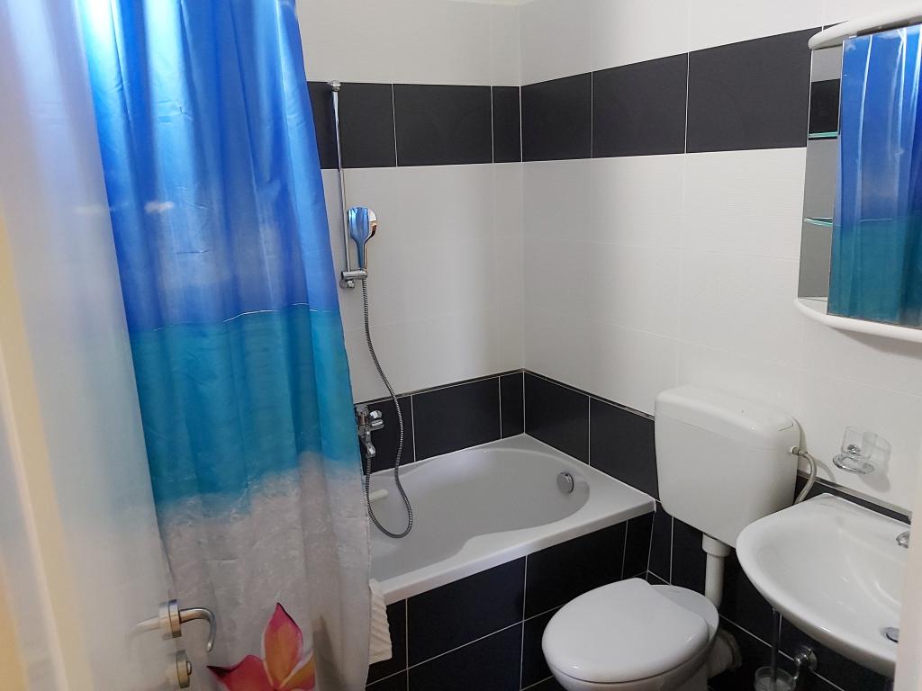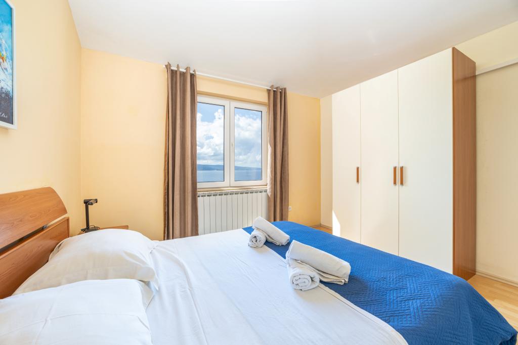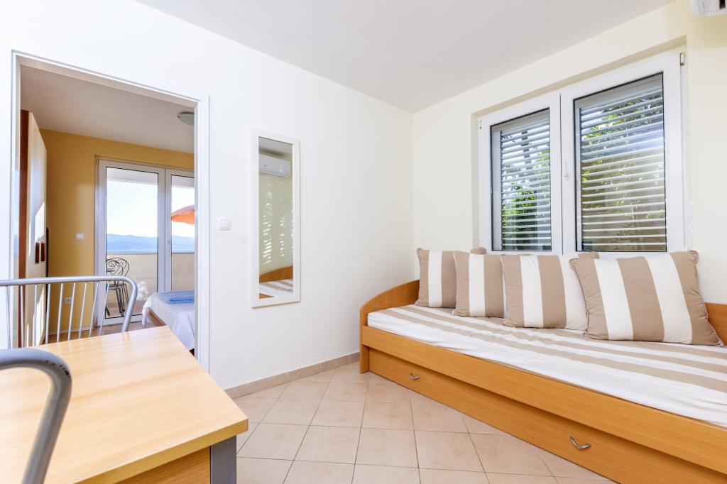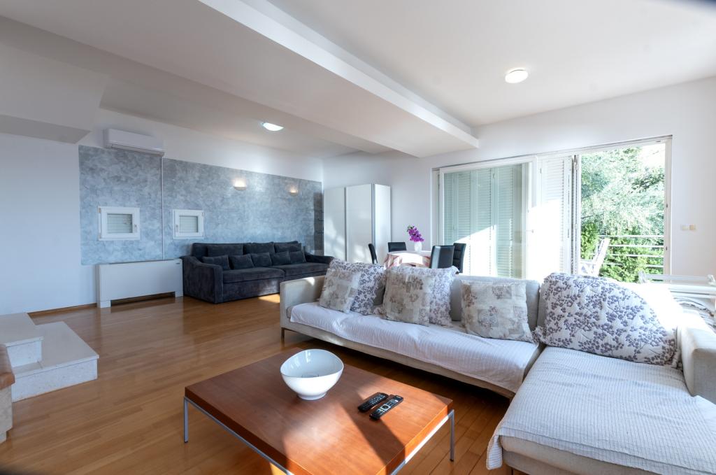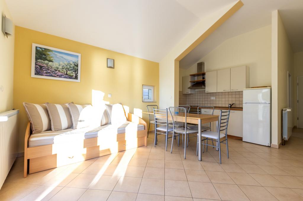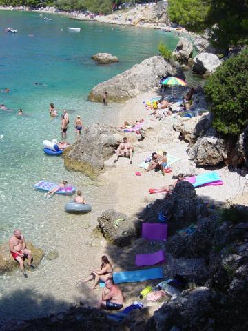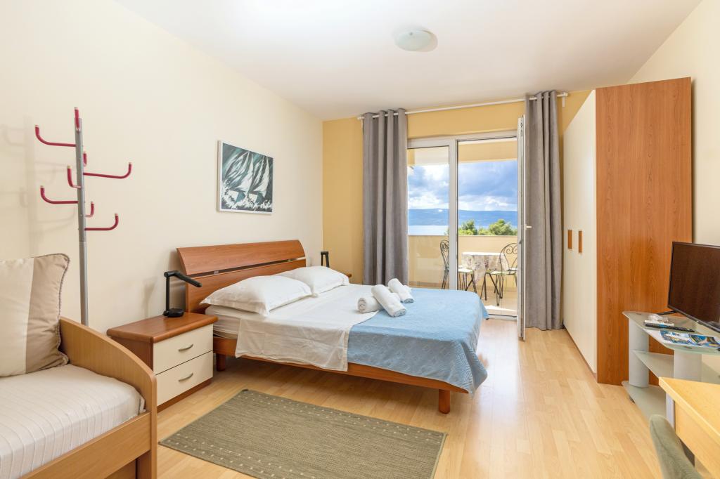 Ubytování v nově postavených, mimořádně pohodlných a skvěle vybavených apartmánech. Objekt se nachází 3 km od centra Omiše. Celkem osm apartmánů, které se nacházejí v první řadě u moře. Všechny apartmány mají velké terasy s výhledem na moře a ostrov Brač. Parkovací místa přímo u vily. Apartmány se nacházejí pod hlavní silnicí (300 metrů), přímo u moře a velké oblázkové pláže. K dispozici jsou čtyři typy apartmánů: -- typ 2+2 se samostatnou dvoulůžkovou ložnicí a obývacím pokojem se dvěma lůžky, -- dále apartmány typu 2+2 velké studio, -- velké lux. apartmány typu 4+2 se dvěma dvoulůžkovými ložnicemi a velkým obývacím pokojem se dvěma rozkládacími lůžky a -- velký de lux. apartmán typu 14+2, ve skutečnosti vila na třech podlažích o rozloze 300 m2, s bazénem o rozměrech 9x4 metry s vyhřívanou vodou, se sedmi dvoulůžkovými ložnicemi, dvěma velkými obývacími pokoji s balkony a terasami, čtyřmi koupelnami, samostatnou toaletou, venkovním grilem, saunou a posilovnou atd. Bazén je výhradně využíván apartmánem A 14+2. Ostatní byty ne.