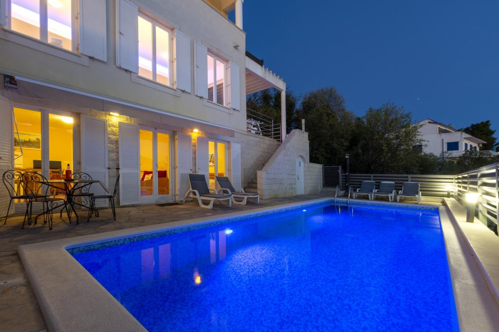 Pobytová taxa je v ceně.Každý z našich hostů je při příjezdu vítán uvítacím nápojem. Pro všechny naše hosty můžeme také pronajmout loď nebo motorový člun, zorganizovat rafting na řece Cetině, výlety na ostrov Brač atd. Všechny apartmány mohou využívat venkovní gril. Parkování je zajištěno pro všechny apartmány přímo vedle vily. Krásné oblázkové pláže jsou od vily vzdálené 30 metrů. Bazén je určen výhradně pro velké luxusní apartmány typu A 14+2 (vila - samostatný dům), ostatní apartmány bazén využívat nemohou. Bazén je tedy využíván výhradně a pouze velkým luxusním apartmánem (vilou), ostatní apartmány nikoli. Vila s bazénem (velký apartmán typu A 14+2) je samostatná budova. Vila s bazénem má sedm dvoulůžkových pokojů, čtyři koupelny s toaletami, jednu samostatnou toaletu, dva obývací pokoje, posilovnu se saunou, šipkami, basketbalovým košem atd. Všechny ostatní apartmány (typ A 2+2, Studio +2 a A 4+2) se nacházejí v jiné samostatné budově, která je od vily s bazénem vzdálena 6 metrů.