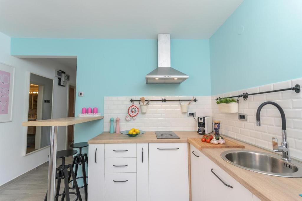 Moderní, nově zařízený apartmán, mimořádně příjemné prostředí, luxusně zařízená koupelna, pohodlný pokoj s manželskou postelí pro 2 osoby, plně vybavená nová kuchyně, prostorný obývací pokoj s luxusní rozkládací pohovkou, na které se vyspí 2 osoby. TV 160 cm/netflix, vysokorychlostní internet, Nachází se v klidné části Opatije, 800 metrů od moře a centra Opatije, 70 m od nákupního centra Spaar (10 minut chůze).