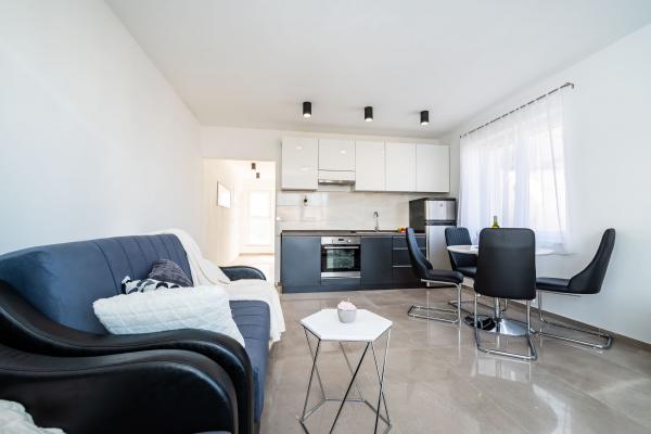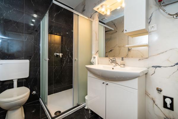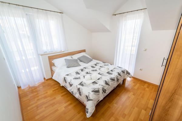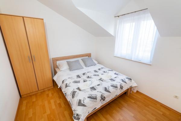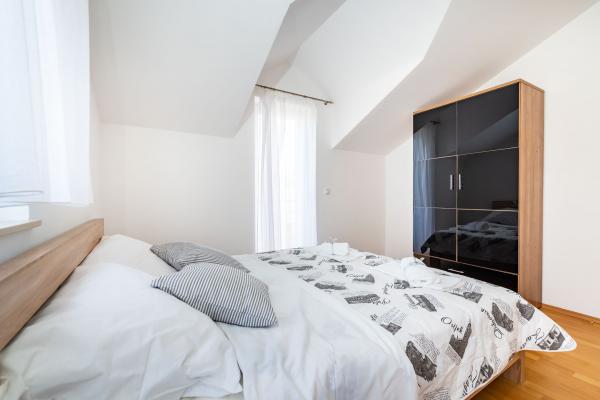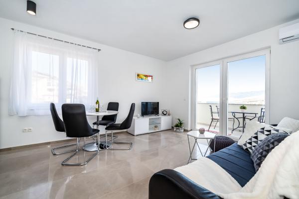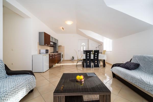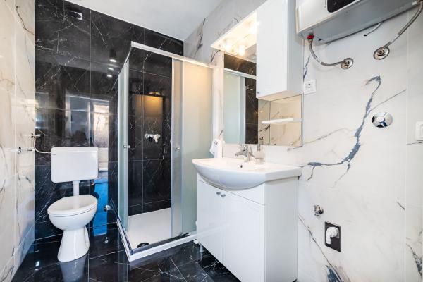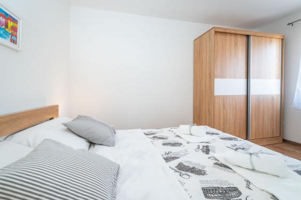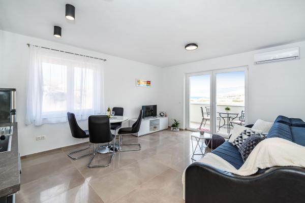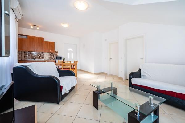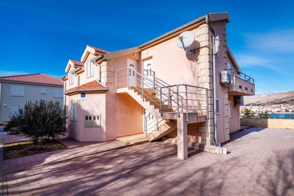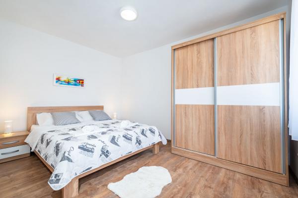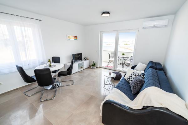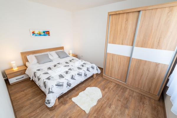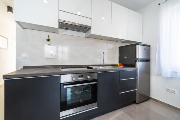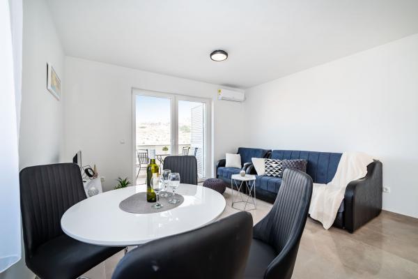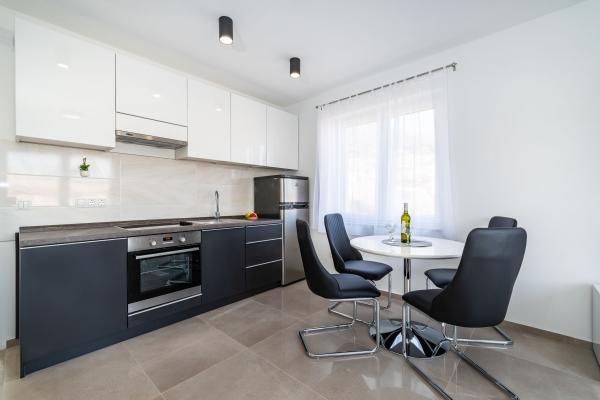 Vynikající apartmány v krásné lokalitě s výhledem na moře a město. Plně vybavené veškerým potřebným obsahem, parkoviště pro auta, wi-fi, vše, co potřebujete pro vaši příjemnou dovolenou. 7 minut na pláž, 10 minut do centra města a restaurací. Nejbližší obchod je 5 minut chůze, vše je dostupné za 10 minut pěšky. Apartmány 1 - 6 se nacházejí v jedné budově a jsou zcela totožné. Tři byty jsou v přízemí (1 až 3) s velkými terasami. V prvním patře jsou tři byty. Všechny mají výhled na moře. Apartmány 7 a 8 se nacházejí v 1. patře druhé budovy, která se nachází hned vedle první budovy. Všechny apartmány jsou moderně zařízené a hosté mají k dispozici vše, co potřebují, včetně mikrovlnné trouby, lednice, wi-fi, rychlovarné konvice, kuchyňského náčiní, ručníků... K dispozici je gril se stolem a židlemi pro společenské vyžití.